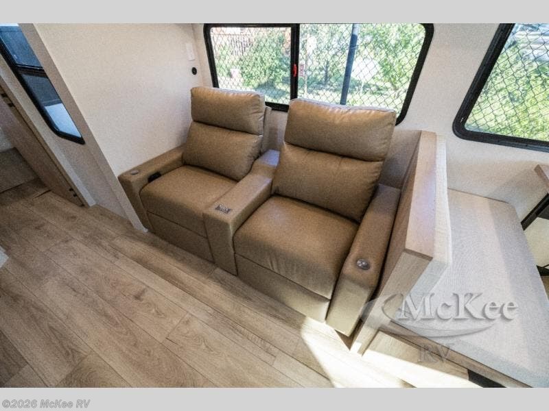 From the moment you arrive, it’s effortless — powered stabilizer jacks, power tongue jack and a 15,000 BTU ducted A/C keep everything smooth. With JBL® Bluetooth audio inside and out, roller shades, custom furniture and modern finishes, this trailer feels like luxury on wheels.