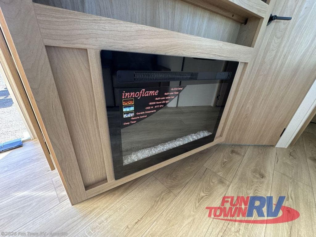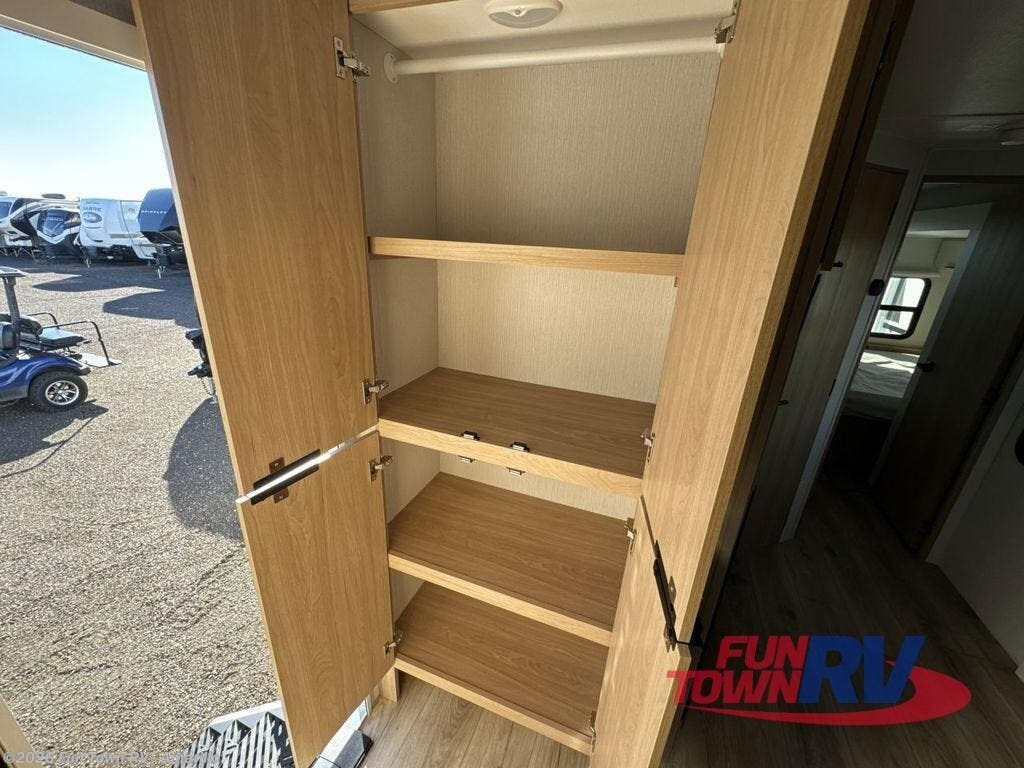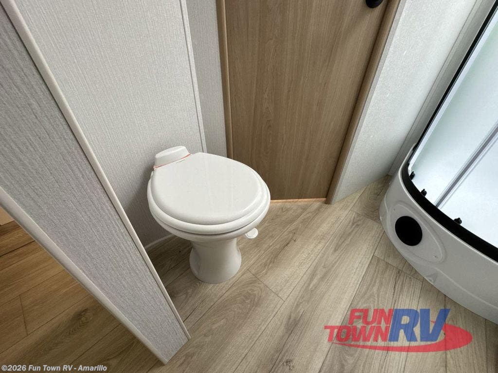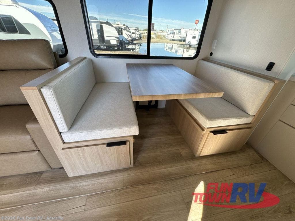 Have everything you need in a compact and well equipped travel trailer. After entering the travel trailer you will find neat places and storage. There is a galley kitchen with molded fiberglass countertops providing unmatched durability. When wanting a perfect place to relax you can enjoy watching TV in the booth dinette or enjoy movies just like at the theaters in the theater seating. If you want to have your own private space you will love the bedroom that has access to a conveniently placed bathroom with a modern radius shower. The bedroom also has a closet to store all your clothes and keep them wrinkle-free!