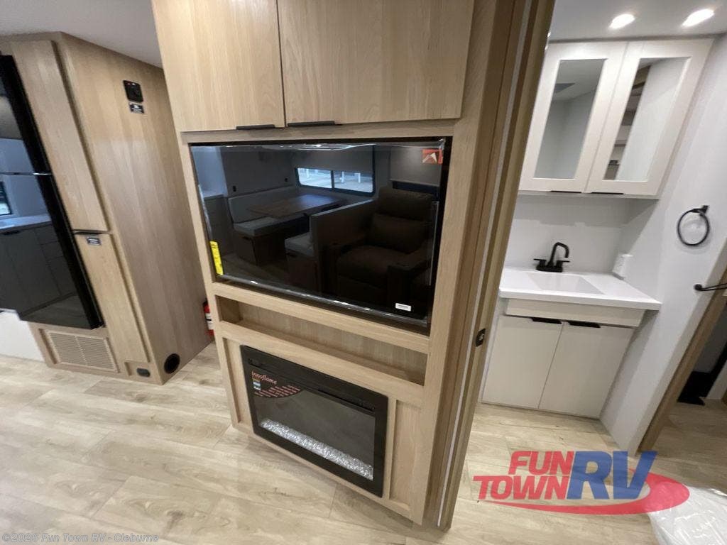 Have everything you need in a compact and well equipped travel trailer. After entering the travel trailer you will find neat places and storage. There is a galley kitchen with molded fiberglass countertops providing unmatched durability. When wanting a perfect place to relax you can enjoy watching TV in the booth dinette or enjoy movies just like at the theaters in the theater seating. If you want to have your own private space you will love the bedroom that has access to a conveniently placed bathroom with a modern radius shower. The bedroom also has a closet to store all your clothes and keep them wrinkle-free!
