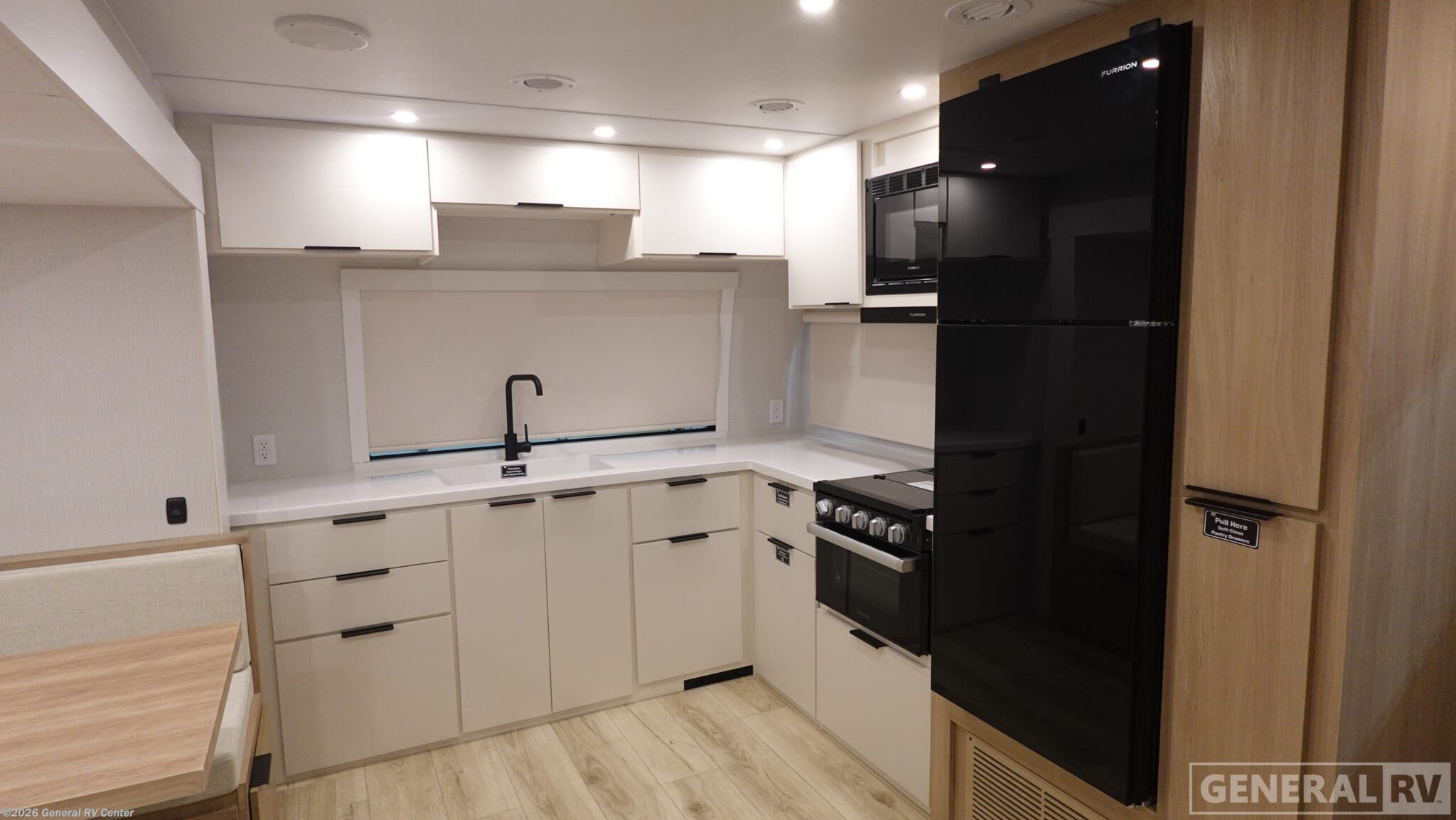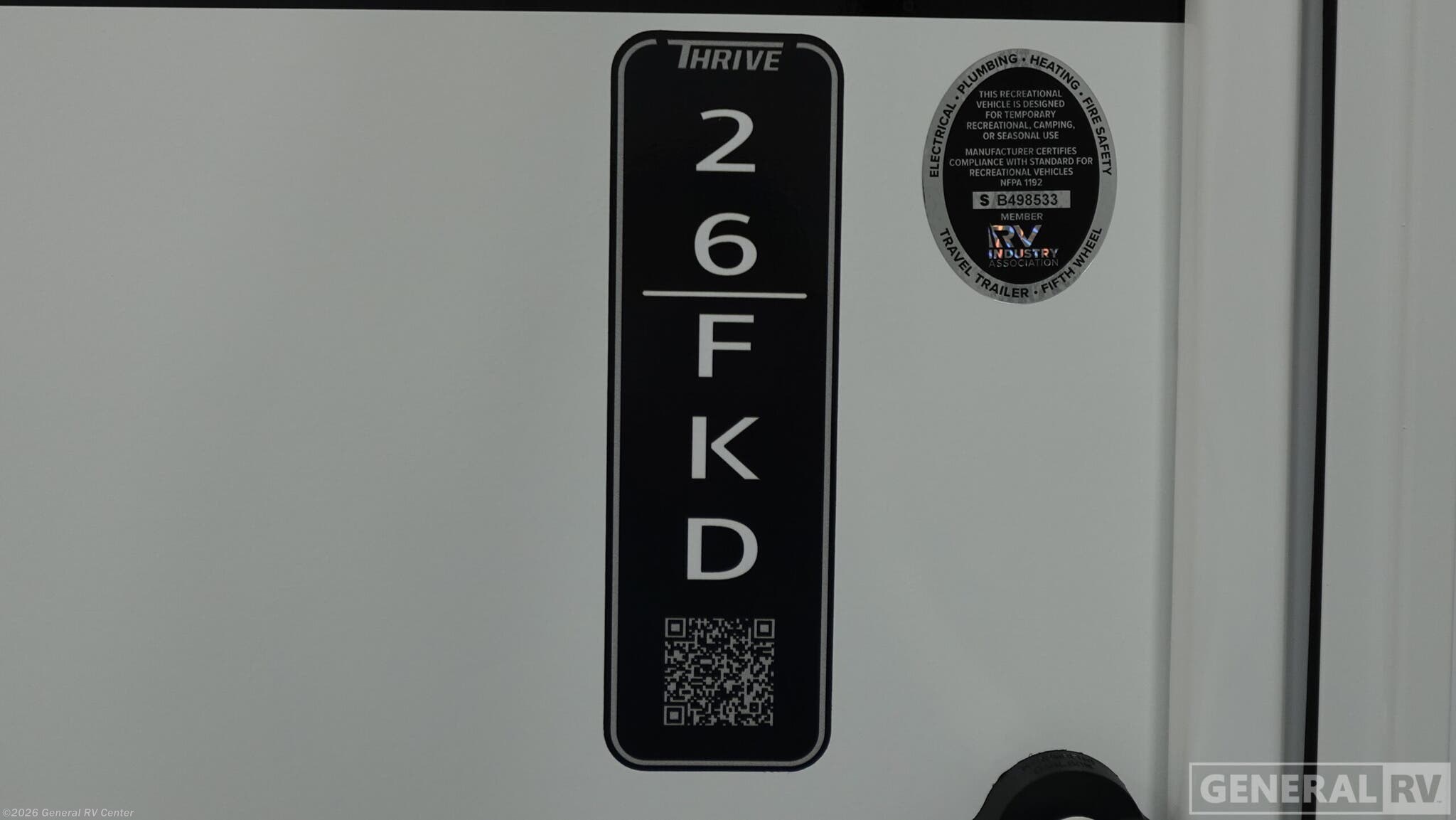 **Winnebago Thrive travel trailer 26FKD highlights:** - Rear Private Bedroom - Theater Seating - Radius Shower - Booth Dinette Have everything you need in a compact and well equipped travel trailer. After entering the travel trailer you will find neat places and storage to have everything in place. There is a galley kitchen with molded fiberglass countertops providing unmatched durability. When wanting a perfect place to relax you can enjoy watching TV in the booth dinette or enjoy movies just like at the theaters in the theater seating. If you want to have your own private space you will love the bedroom that has access to a conveniently placed bathroom with a modern radius shower. The bedroom also has a closet to store all your clothes and keep them wrinkle-free! With any Thrive travel trailer by Winnebago, you can camp with functionality, comfort, and convenience! The large front viewing window with strike guard will be the first thing that catches your eye, and the fiberglass sidewalls with Azdel Onboard provide a durable trailer made to last. There is also an exterior ladder, along with front radius profile lights, power stabilizer jacks, and a powered awning with LED lighting to name a few exterior features. You will stay powered up by the 30-amp power cord and 200-watt solar panel, plus there is a tankless water heater for endless hot showers. Inside, you'll love the custom Winnebago furniture, carpetless side outs, molded fiberglass countertops, and residential recessed ceiling lights to keep your space well lit!
