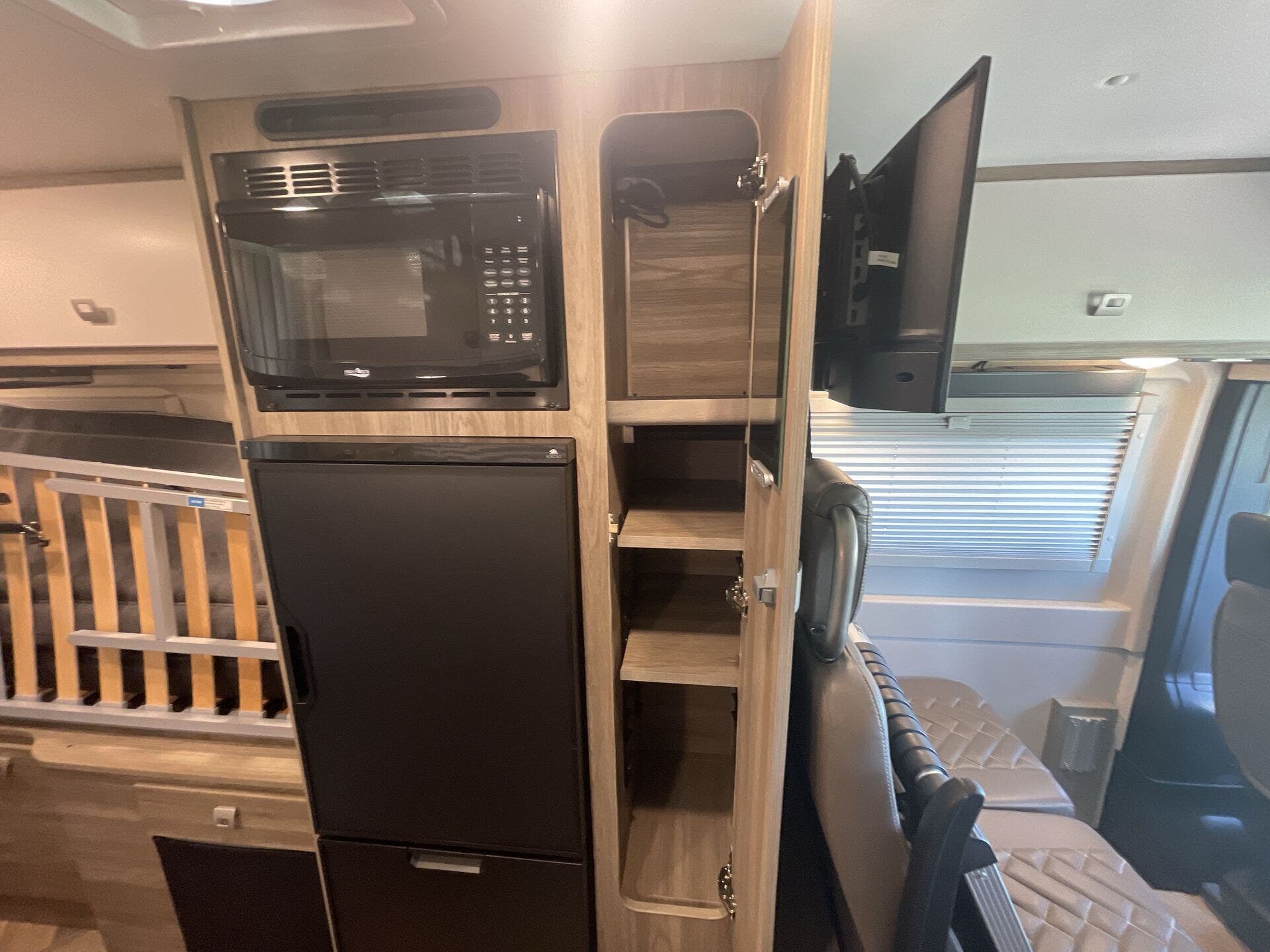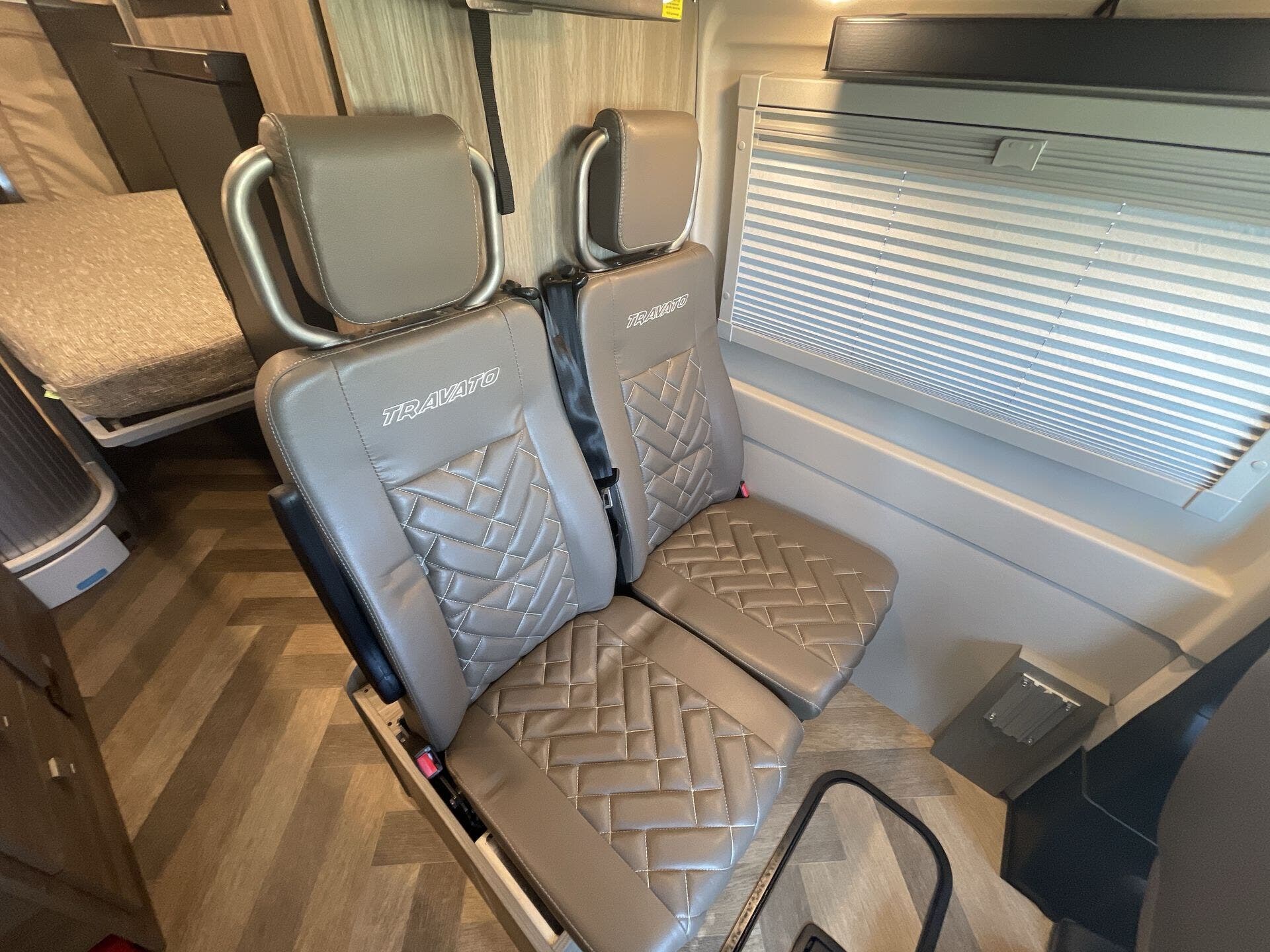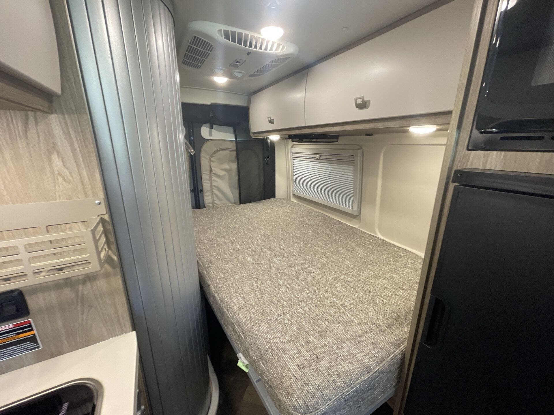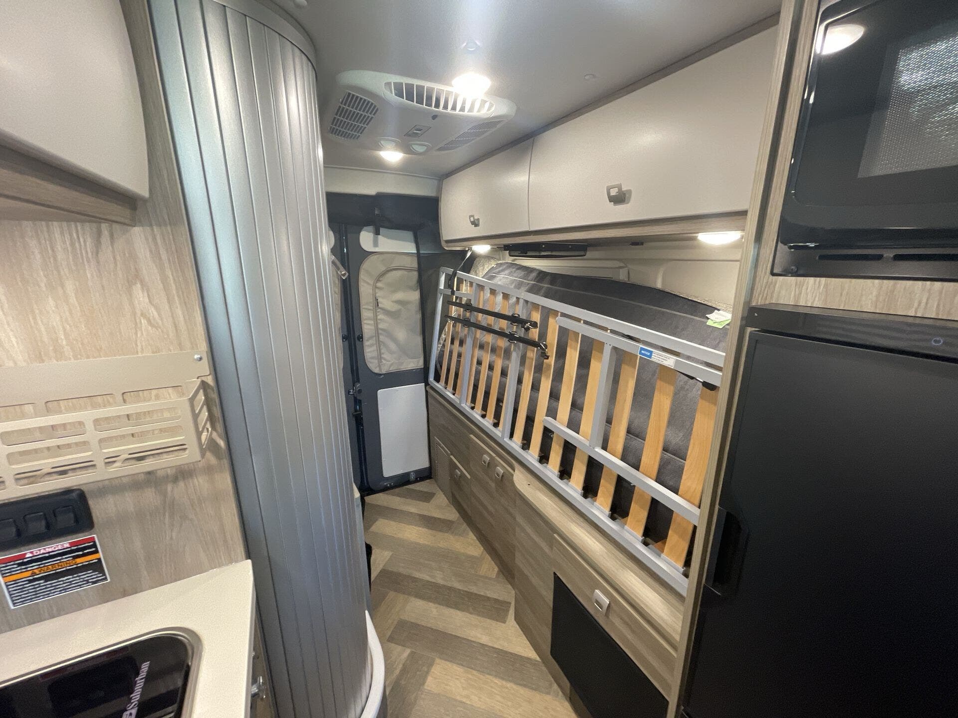 Inside, the Travato is equipped with a variety of features to make every journey comfortable and convenient. The RV includes essentials such as a microwave, refrigerator, stove top burner, water heater, air conditioning, water tanks with a combined capacity of over 43 gallons, and dependable safety features. The interior offers cozy sleeping for two and comes with thoughtful touches like day/night shades, overhead cabinetry, a medicine cabinet, and a pantry for added convenience.