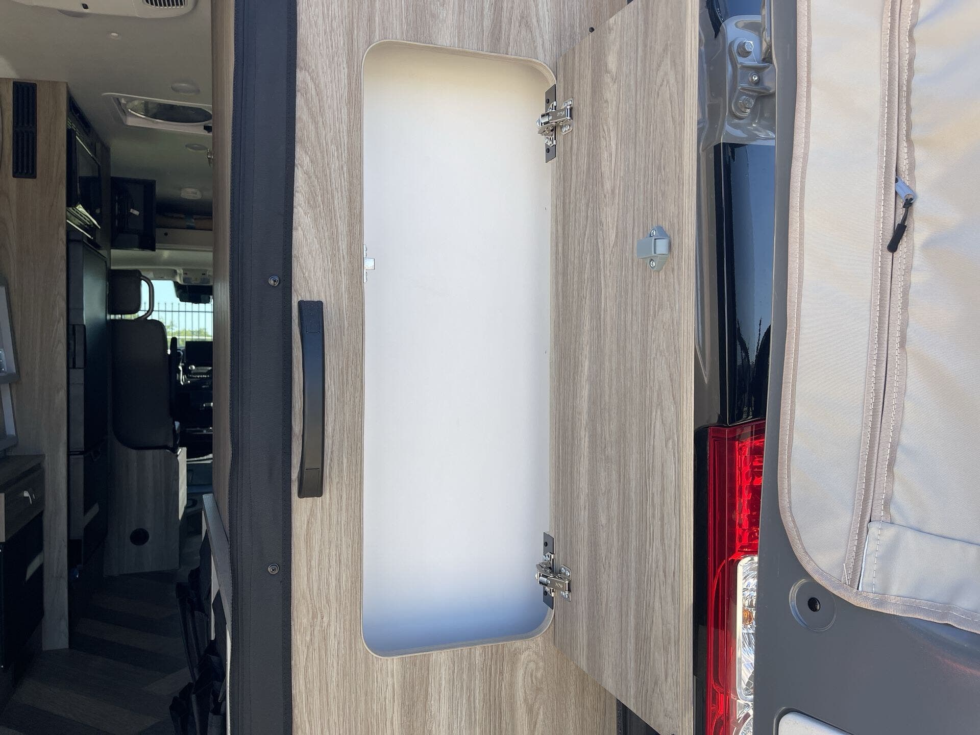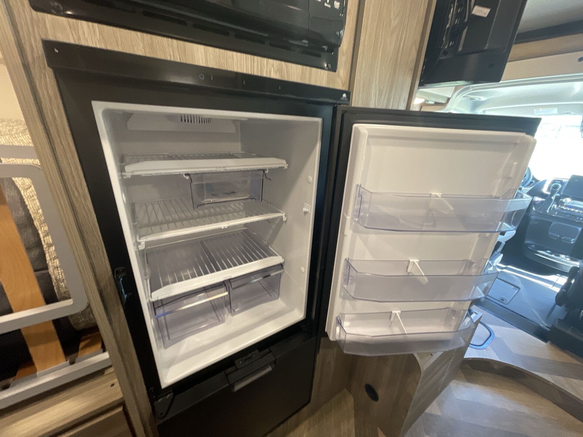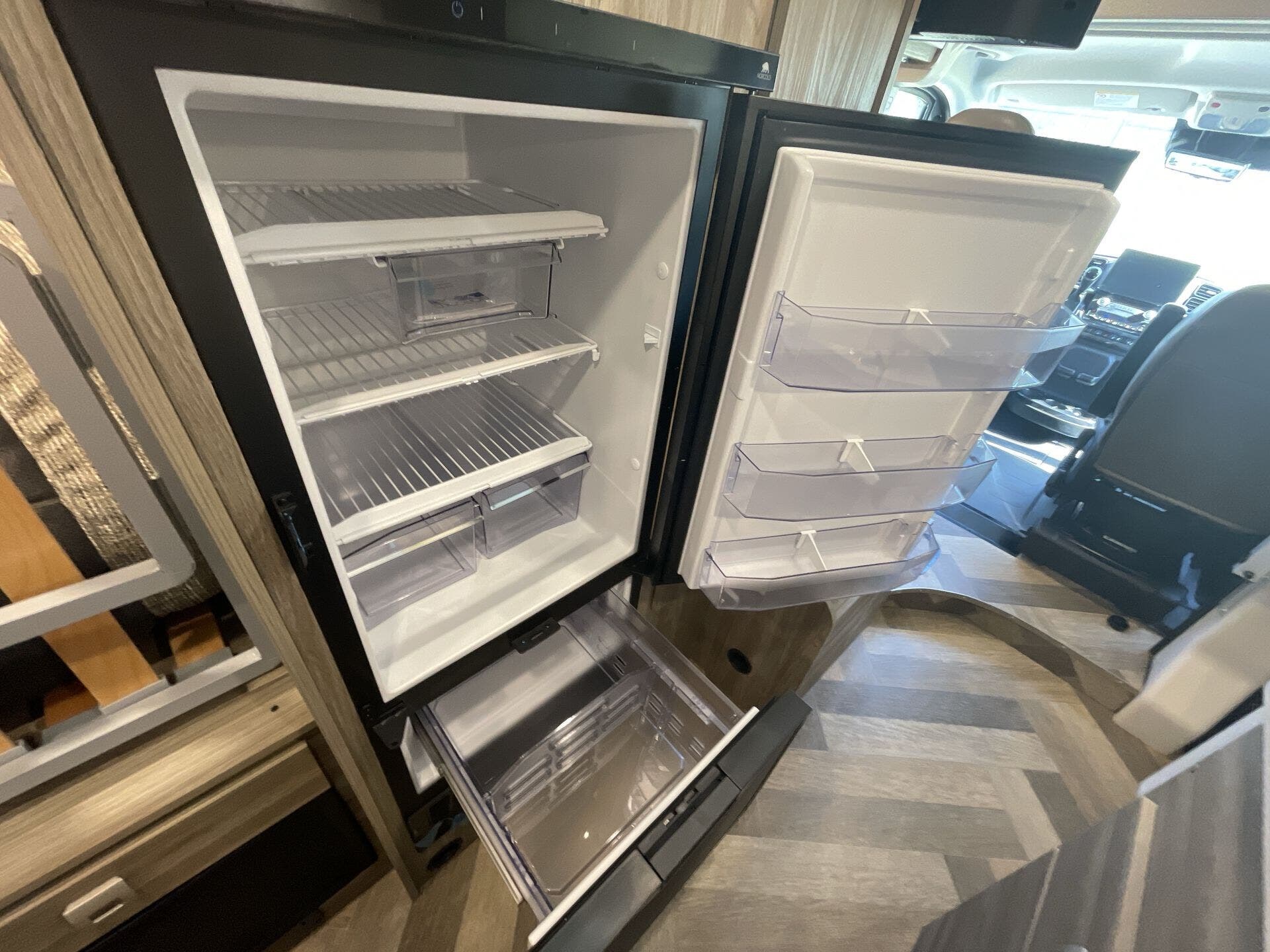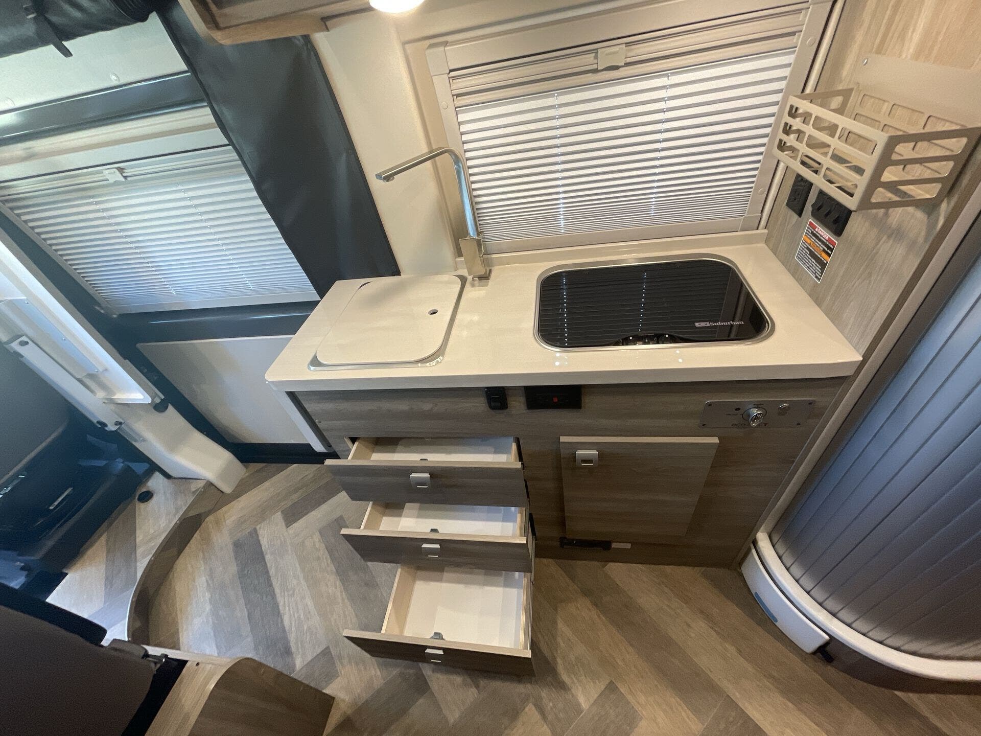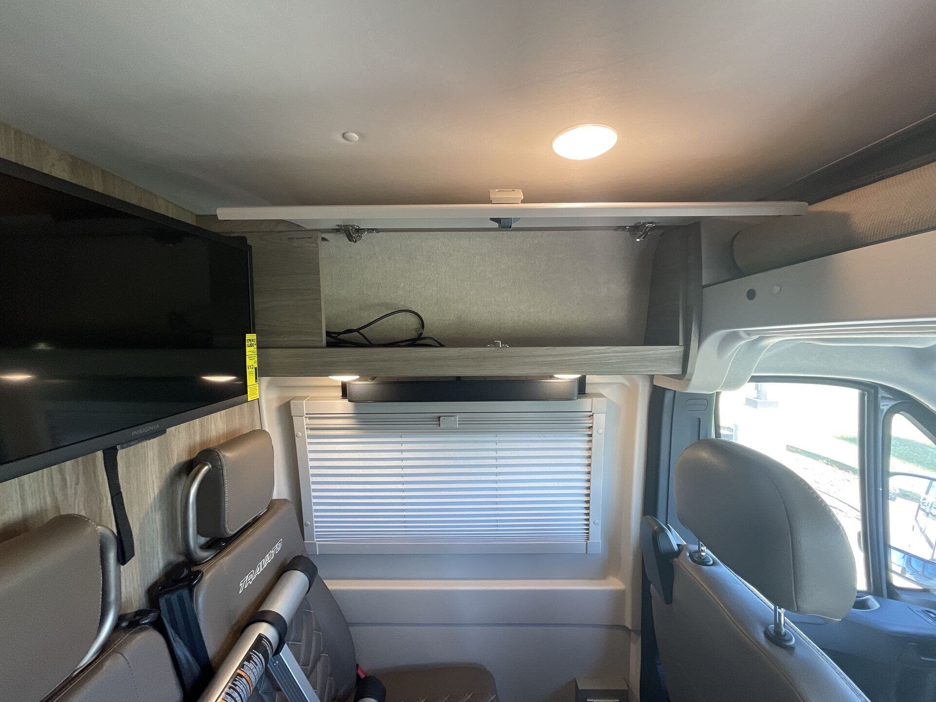 Inside, the Travato is equipped with a variety of features to make every journey comfortable and convenient. The RV includes essentials such as a microwave, refrigerator, stove top burner, water heater, air conditioning, water tanks with a combined capacity of over 43 gallons, and dependable safety features. The interior offers cozy sleeping for two and comes with thoughtful touches like day/night shades, overhead cabinetry, a medicine cabinet, and a pantry for added convenience.