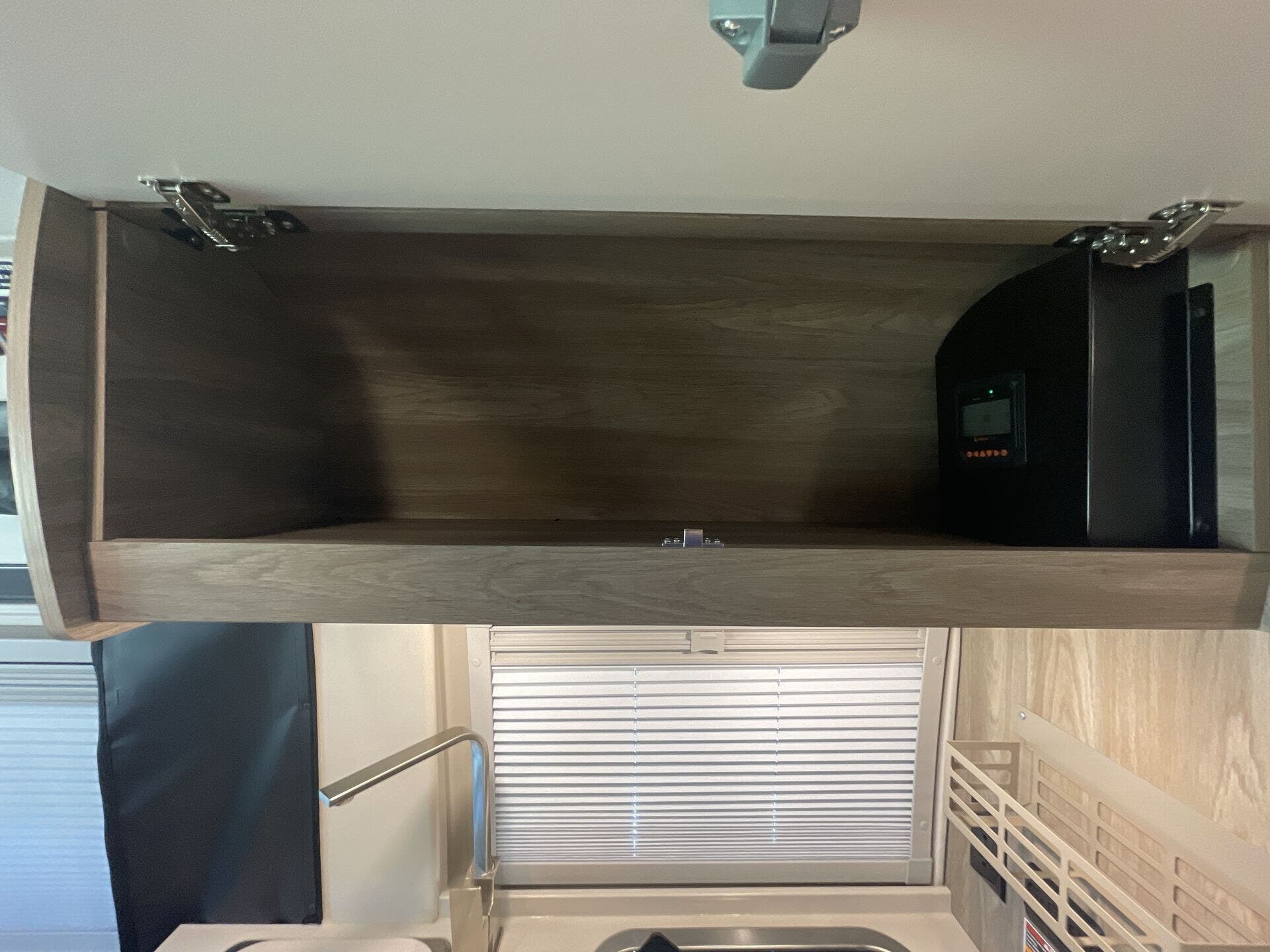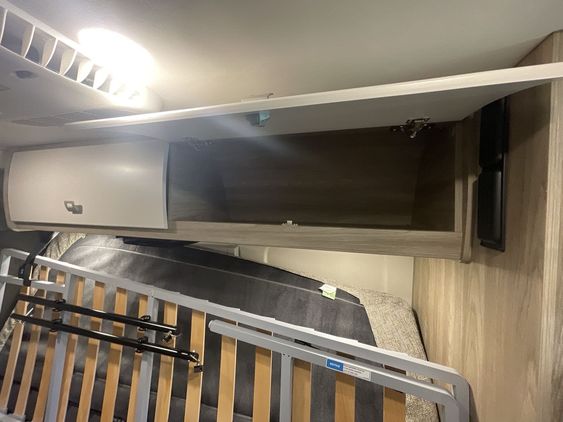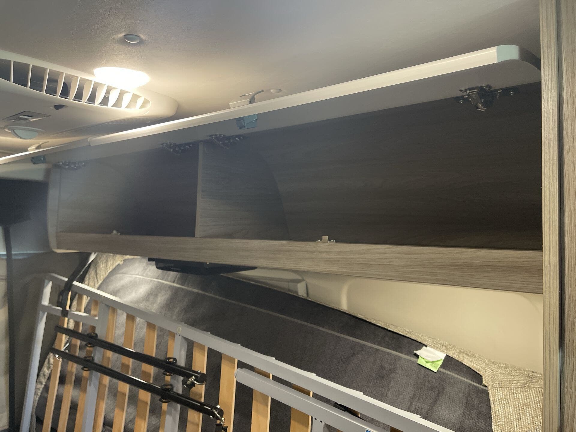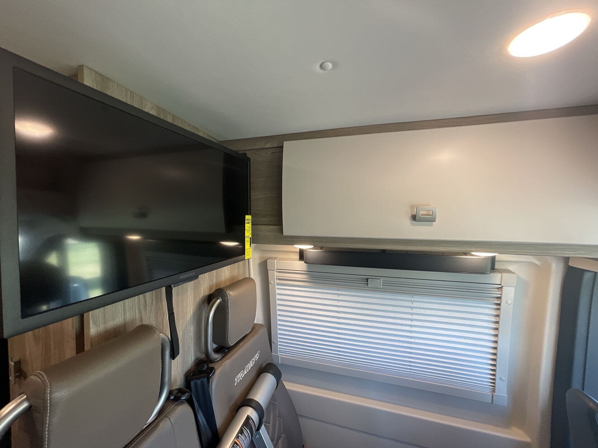 - Comfort-focused features like TV, day/night shades, and overhead cabinets