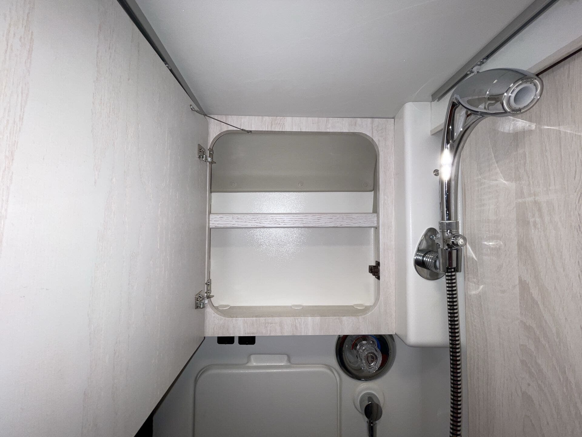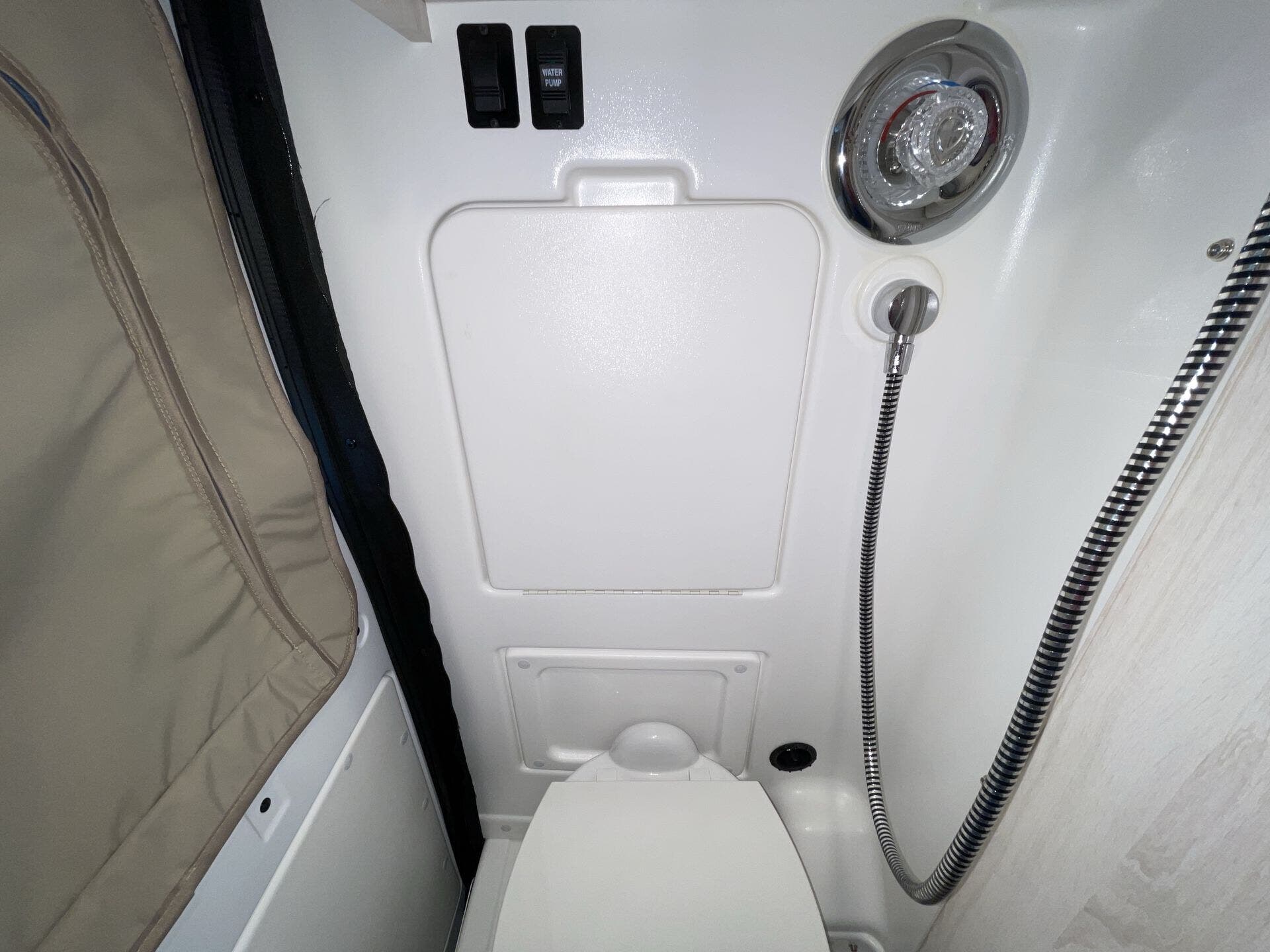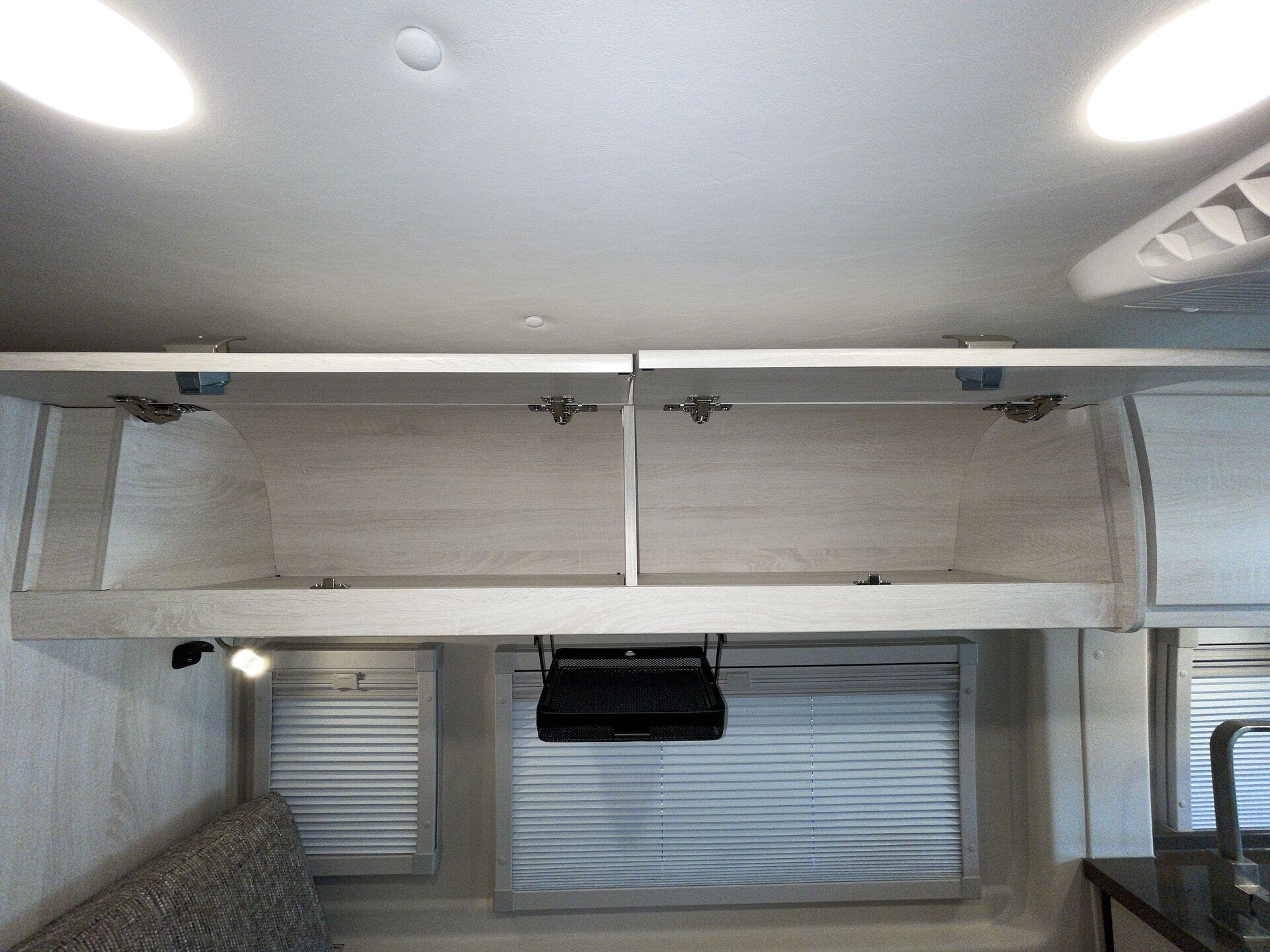 Day/Night Shades, Kitchen Sink, Medicine Cabinet, Overhead Cabinetry, Removable Table, Shower, Toilet