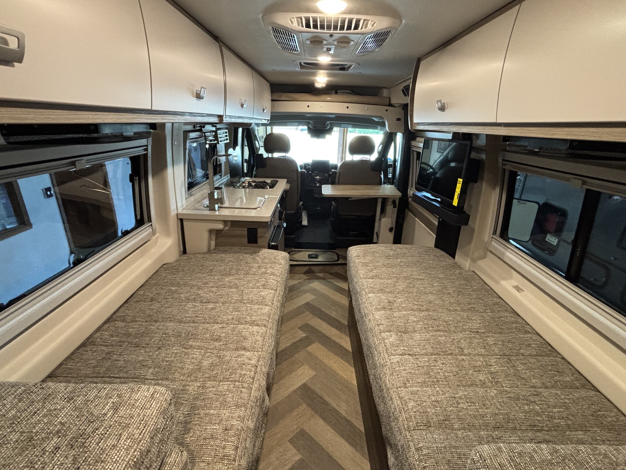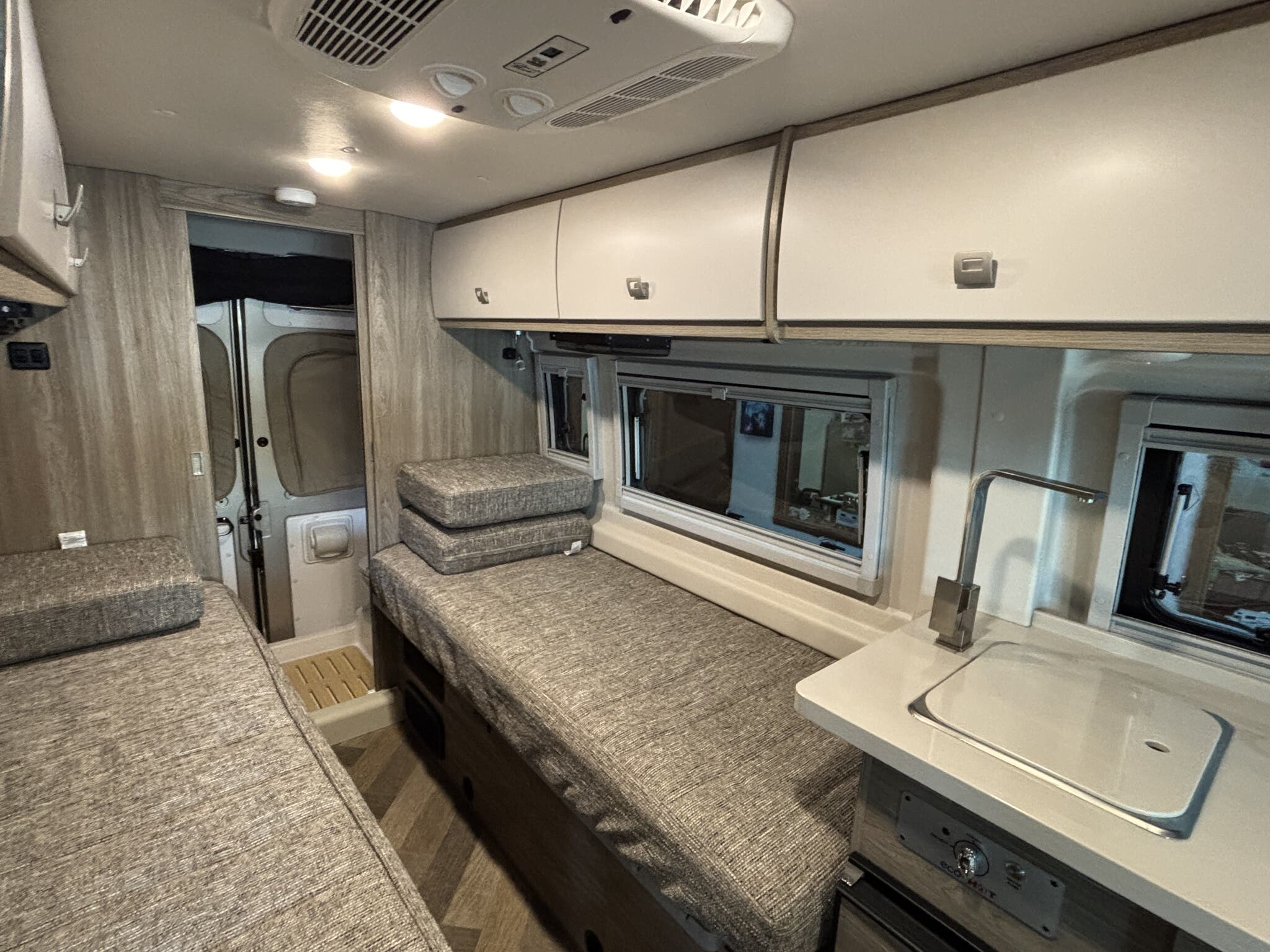 The interior of the Winnebago Travato is thoughtfully designed to maximize space while offering modern comforts. Sleeping accommodations for two make it ideal for couples or solo travelers. The innovative floor plan, the 59KL layout, ensures a cozy yet functional living space equipped with a queen-size bed, generous storage options, and essential amenities. The RV's compact length of 21 feet allows easy maneuvering through tight spots and campground sites.