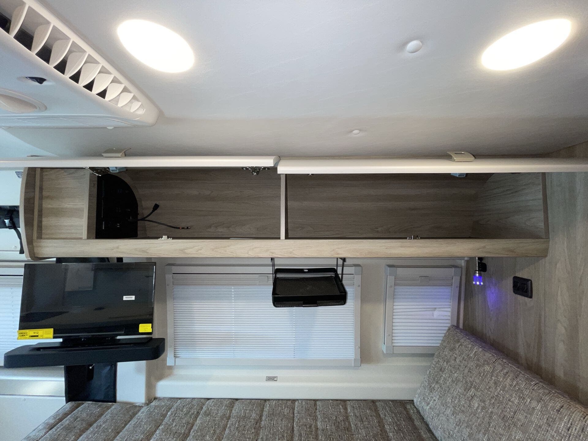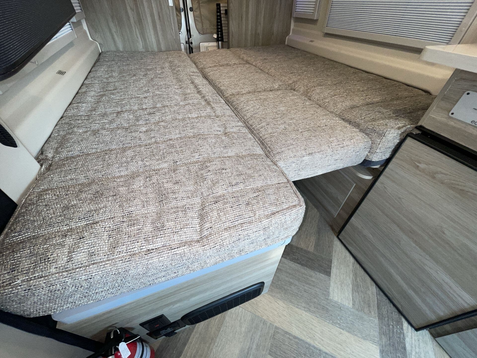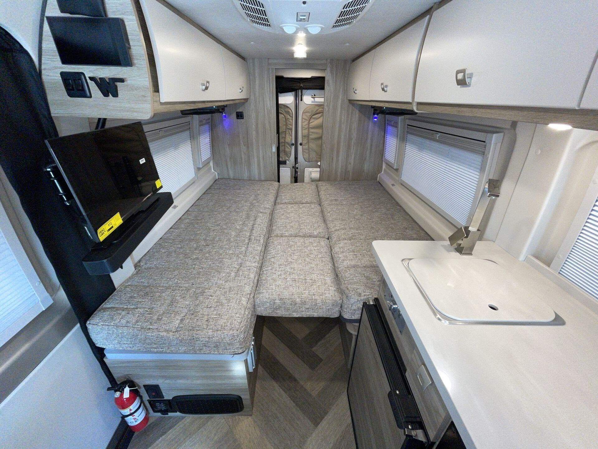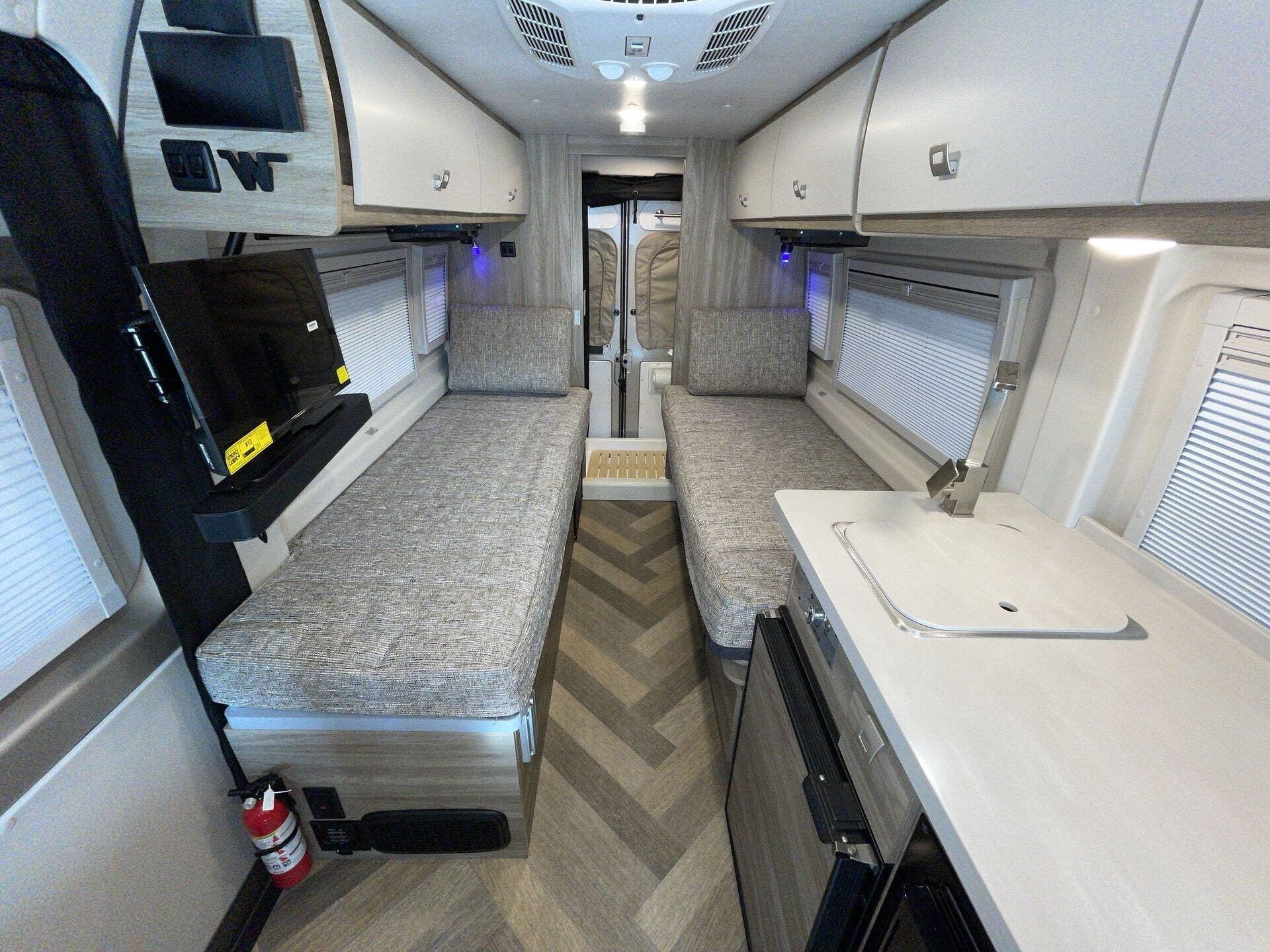 Inside, the Travato 59KL features twin beds with a flexible sleep system, giving you options for separate sleeping areas or a larger bed when needed. The galley kitchen includes everything you need for cooking on the road, while the rear wet bath keeps the coach fully self-contained. Winnebago’s lithium battery power system and solar setup make off-grid camping easier and help reduce reliance on hookups.