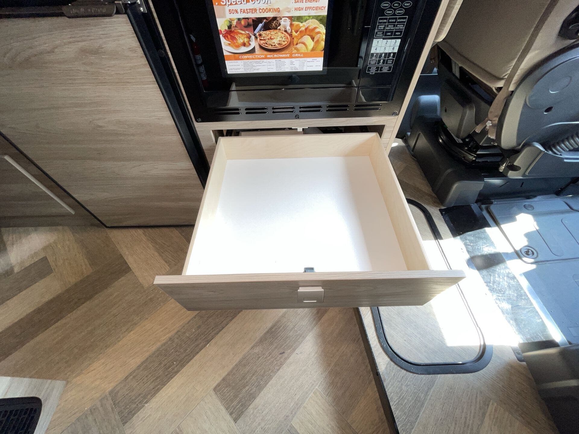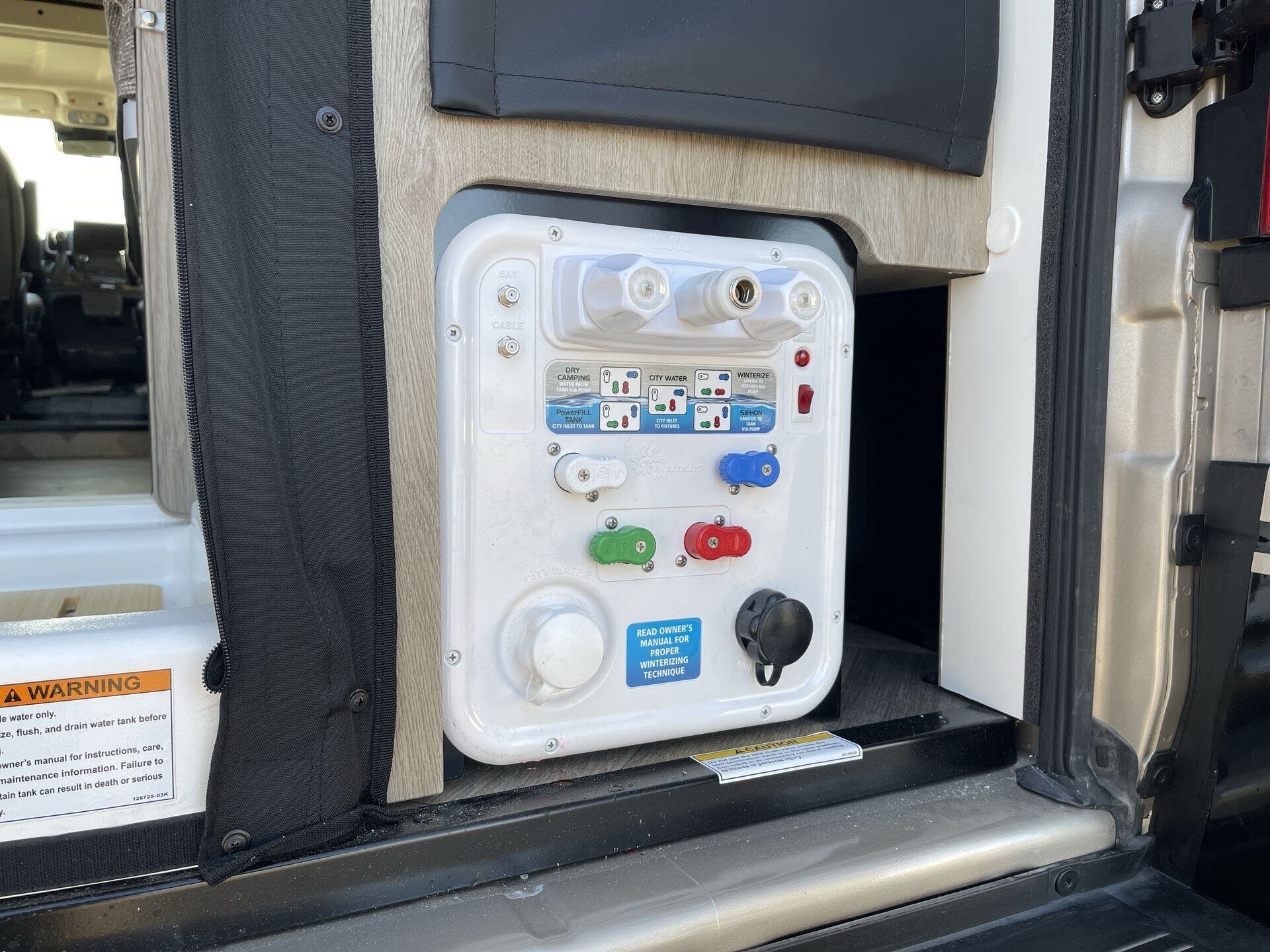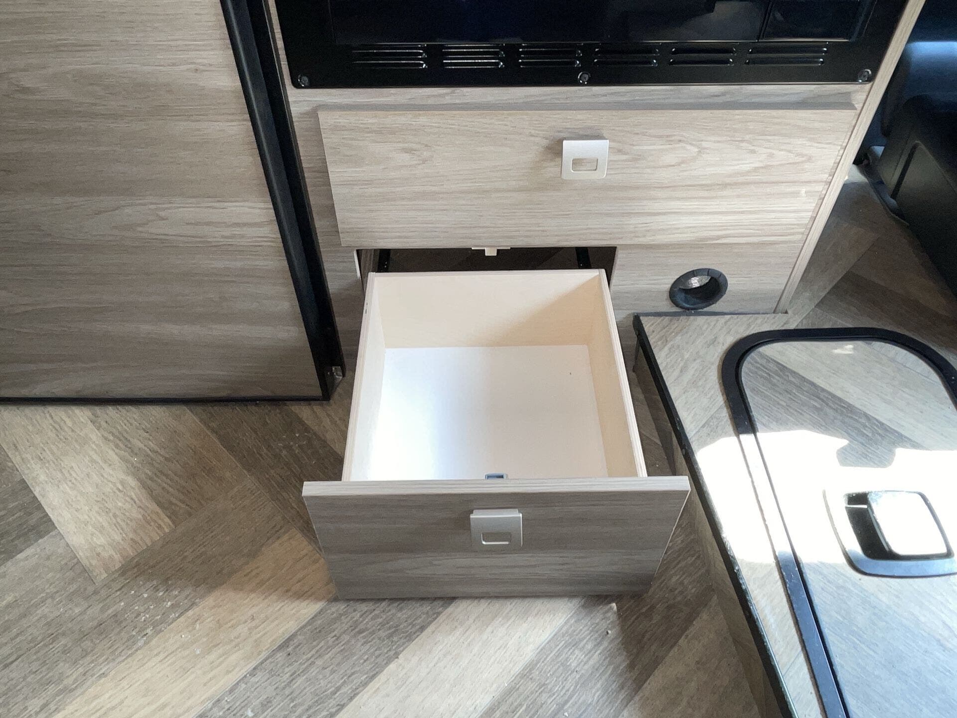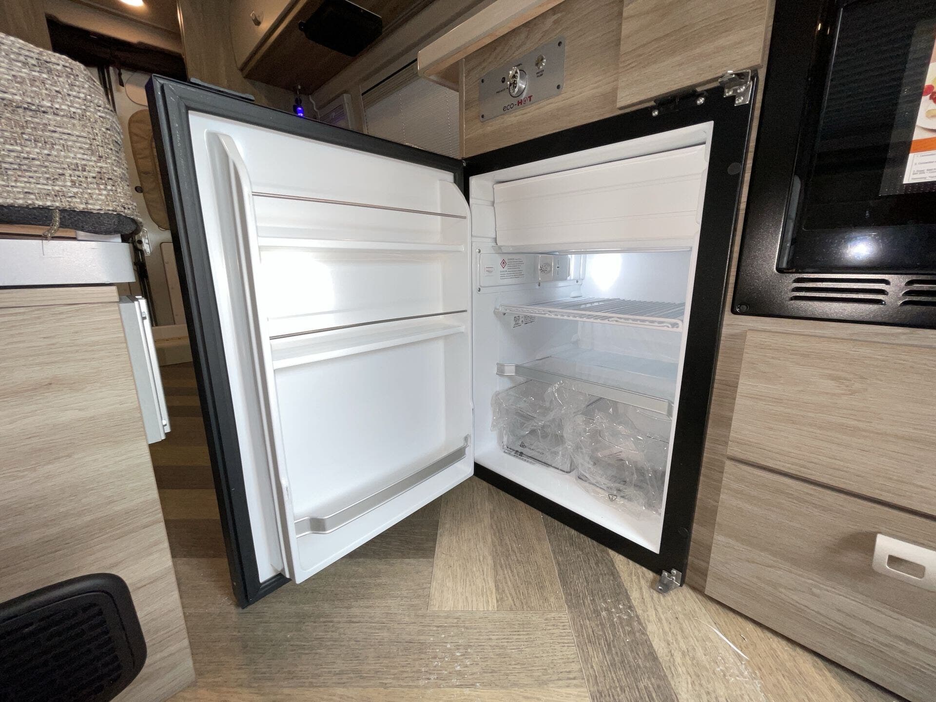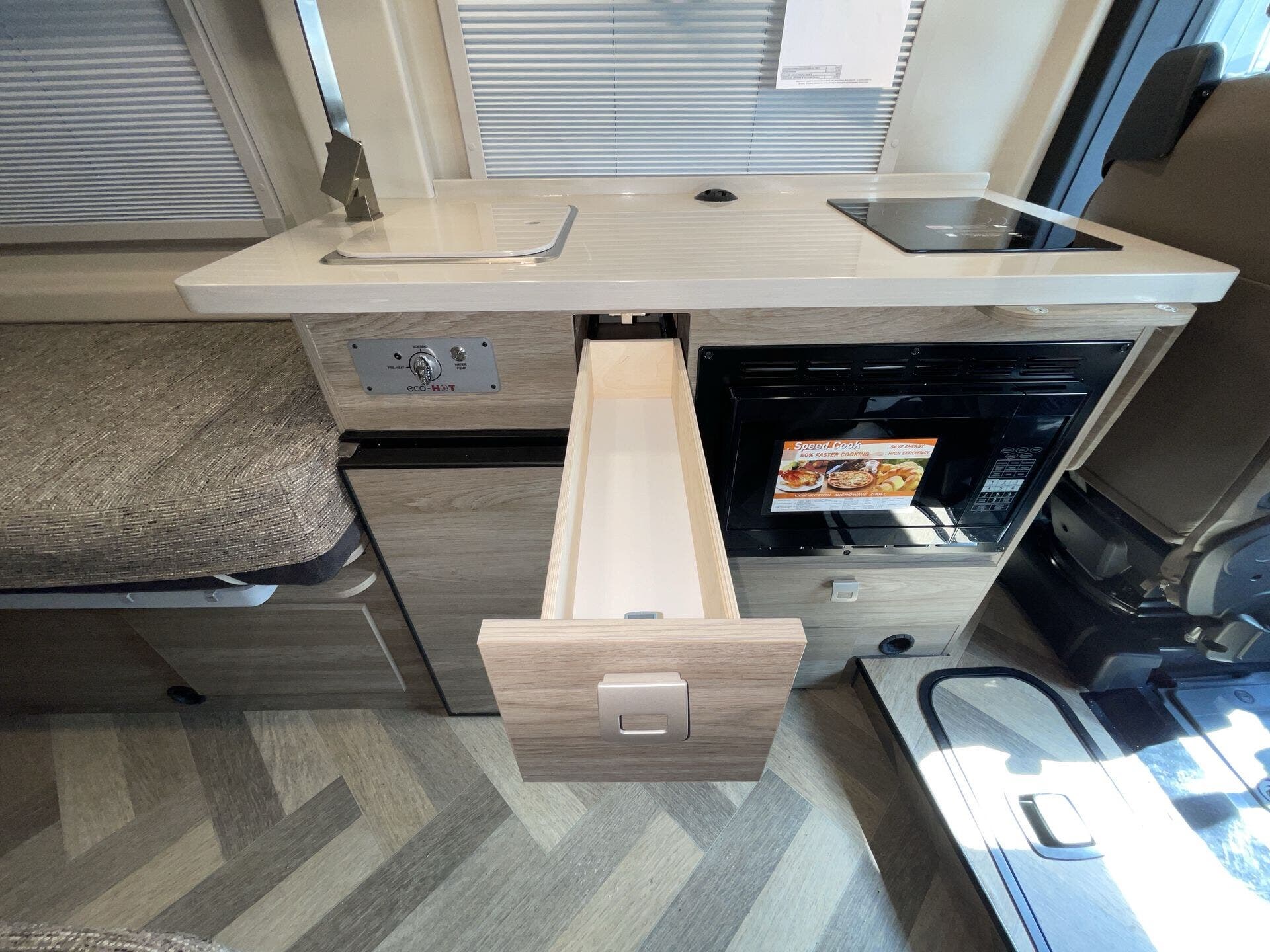 Inside, the Travato 59KL features twin beds with a flexible sleep system, giving you options for separate sleeping areas or a larger bed when needed. The galley kitchen includes everything you need for cooking on the road, while the rear wet bath keeps the coach fully self-contained. Winnebago’s lithium battery power system and solar setup make off-grid camping easier and help reduce reliance on hookups.