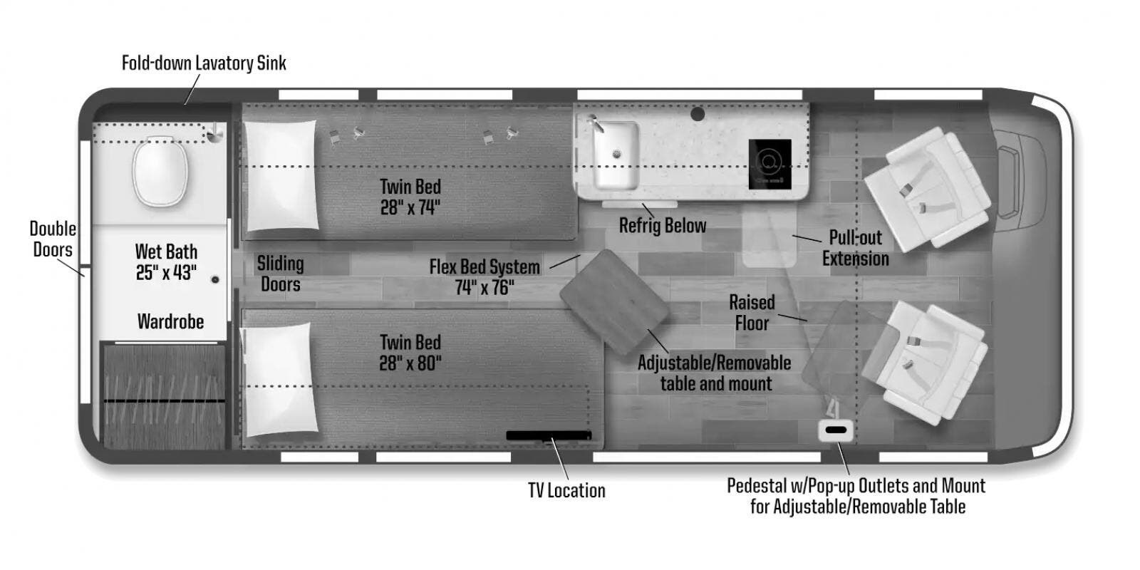 The 2026 Winnebago Travato Ram ProMaster 59KL is a thoughtfully designed Class B RV, crafted for both comfort and adventure seekers. This vehicle is built on a robust Ram ProMaster chassis, assuring a blend of reliability and performance. Under the Hood: - 3.6L V6 Gas Engine - 280 Horsepower - 9-Speed Automatic 62TE Transmission - 180-Amp Alternator - SuperSprings SumoSprings for enhanced stability - 4-Wheel ABS Brakes - Fog Lamps with stylized aluminum wheels Safety Features: - Blind Spot Monitoring - Crosswind Assist - Traffic Sign Assist - Pedestrian Automatic Emergency Braking - Full-Speed Collision Warning Plus - Post Collision Braking - Front Side Curtain Airbags Cab Features: - Power Door Locks with Remote - Power Windows - Thermal Cab Window Blinds - Slide, Swivel, Recline Seats - Push Button Start - Electric Power Steering - Steering Wheel Controls - Touchscreen Radio with Rearview Monitor - Navigation and USB Ports - Adaptive Cruise Control Living Spaces: - Rack Mount Power Awning with LED Lighting - Bluetooth Control - Aluminum Running Boards - Ground Effect Lighting - Side Screen Door with Magnetic Closures - Soft Vinyl Ceiling - Tinted Coach Windows - Below Floor Storage - Rear Screen Door - Deluxe Power Vent with Rain Cover Dining Area: - Dinette Seating with Pedestal Table - Pop-up Outlets - Pantry and Spice Rack - Corian Countertops with Extension - Single Control Faucet - Stainless Steel Sink with Corian Cover - Galley Cold Water Filtration System - 12v 4.3cf Refrigerator - Induction Cooktop - Convection Microwave Electronics: - Systems Center - LP CO and Smoke Detectors - Bluetooth-Controlled Thermostat - Amplified Digital TV Antenna - 24-inch HDTV with Bluetooth Soundbar Sleeping Arrangements: - WinnSleep System - Twin Beds with Flex Bed Kit Bathroom (Wet Bath): - Medicine Cabinet - Bathroom Mirror - Linen Storage - Shower Package with Flexible Showerhead - Foot Pedal Toilet with Sprayer - Power Roof Vent Mechanical Features: - Energy Management System - 245w Solar Panels with Solar Charge Controller and Expansion Plugs - 2.8 Gas Generator - 1000w Pure Sine Wave Inverter - 8.4kWh Lithionics Lithium-Ion Battery - Truma Combi G-Comfort Plus Heat and Hot Water - 10-Foot Sewer Hose - Outdoor Wash Station The Travato Ram ProMaster 59KL combines cutting-edge technology and thoughtful design to create an RV that’s ready for anything. Whether you're embarking on a weekend getaway or an extended road trip, this vehicle provides the perfect balance of home comforts and durable functionality. ???