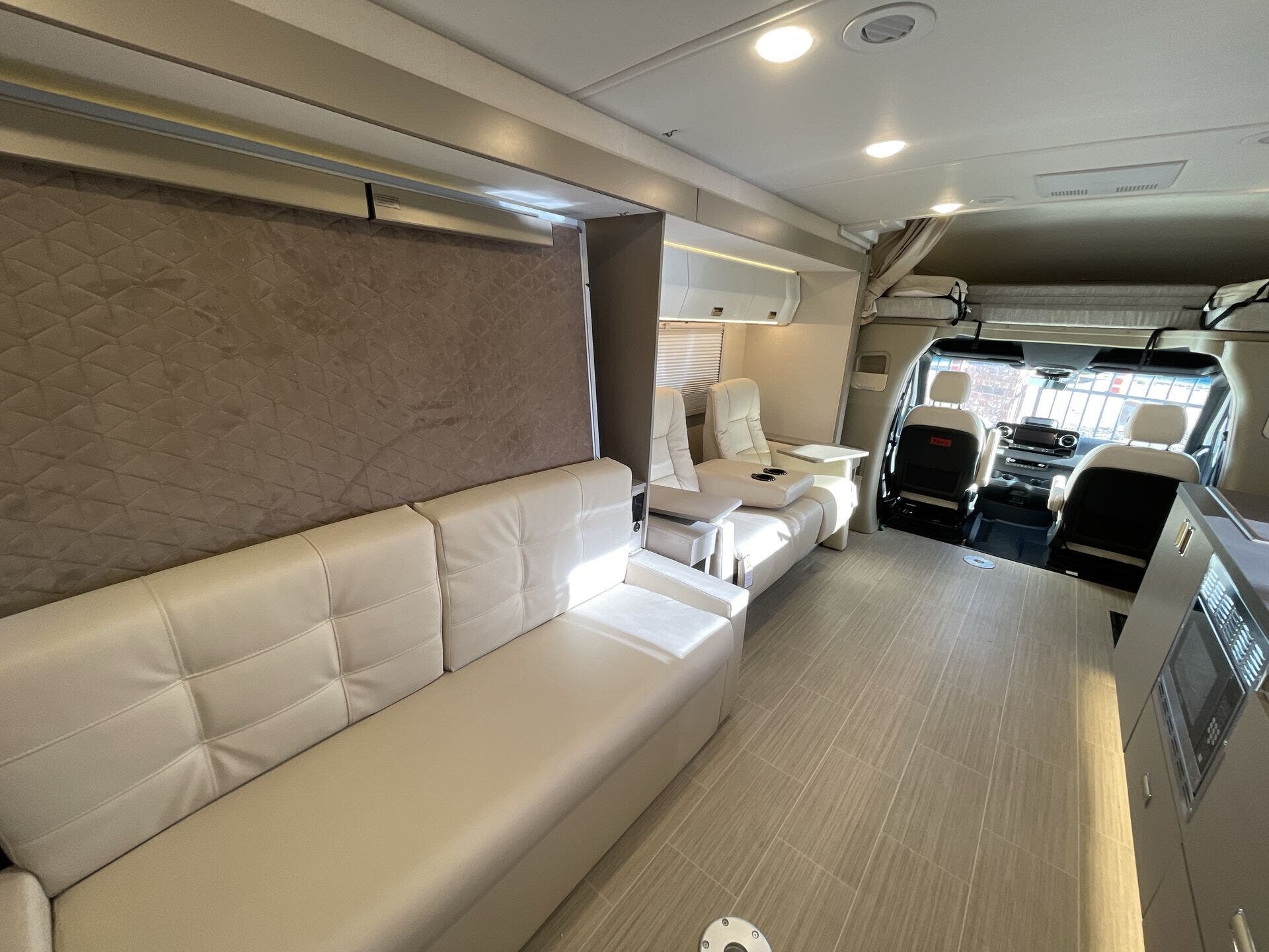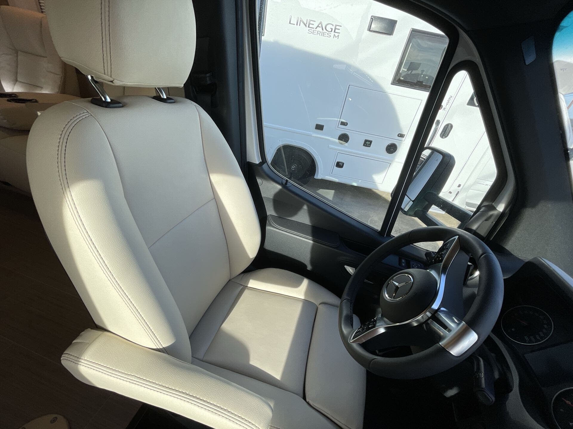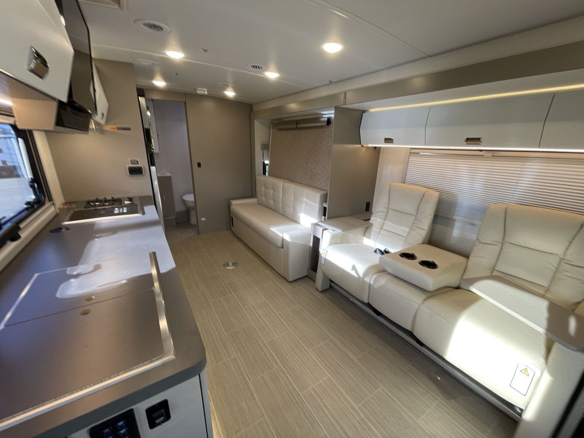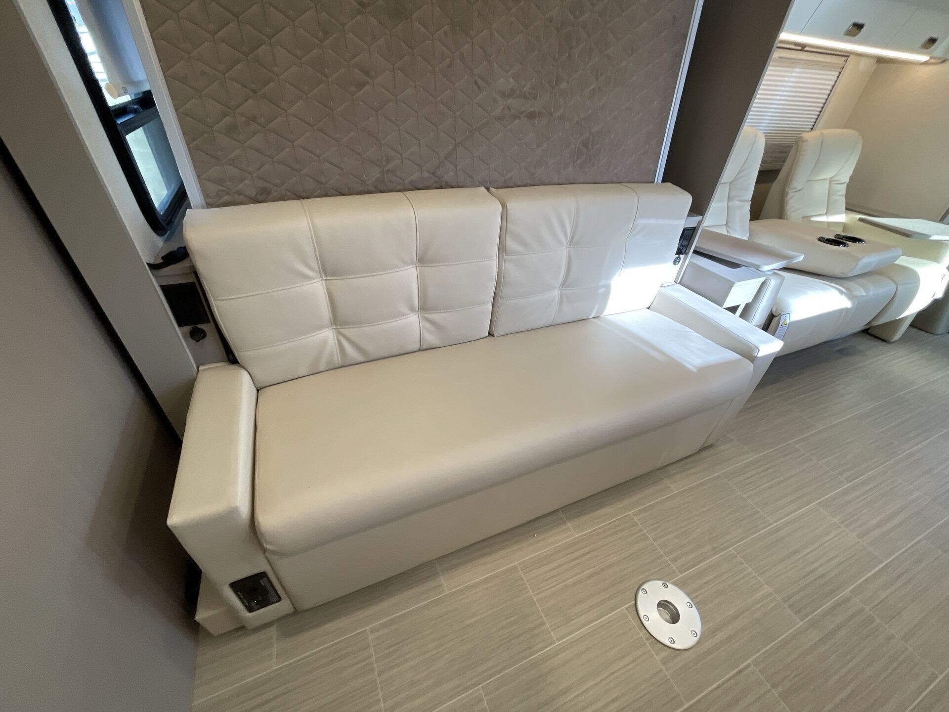 Inside, the 24D features a smart, open layout that maximizes space and livability. The large slide-out expands the living area to include comfortable seating and a versatile dinette, while the fully equipped kitchen offers solid-surface countertops, stainless-steel appliances, and ample storage for extended travel. The cab’s swivel seats integrate seamlessly into the living space, creating an inviting area to relax, dine, or entertain. Premium finishes, LED lighting, and panoramic windows add to the upscale, residential feel.