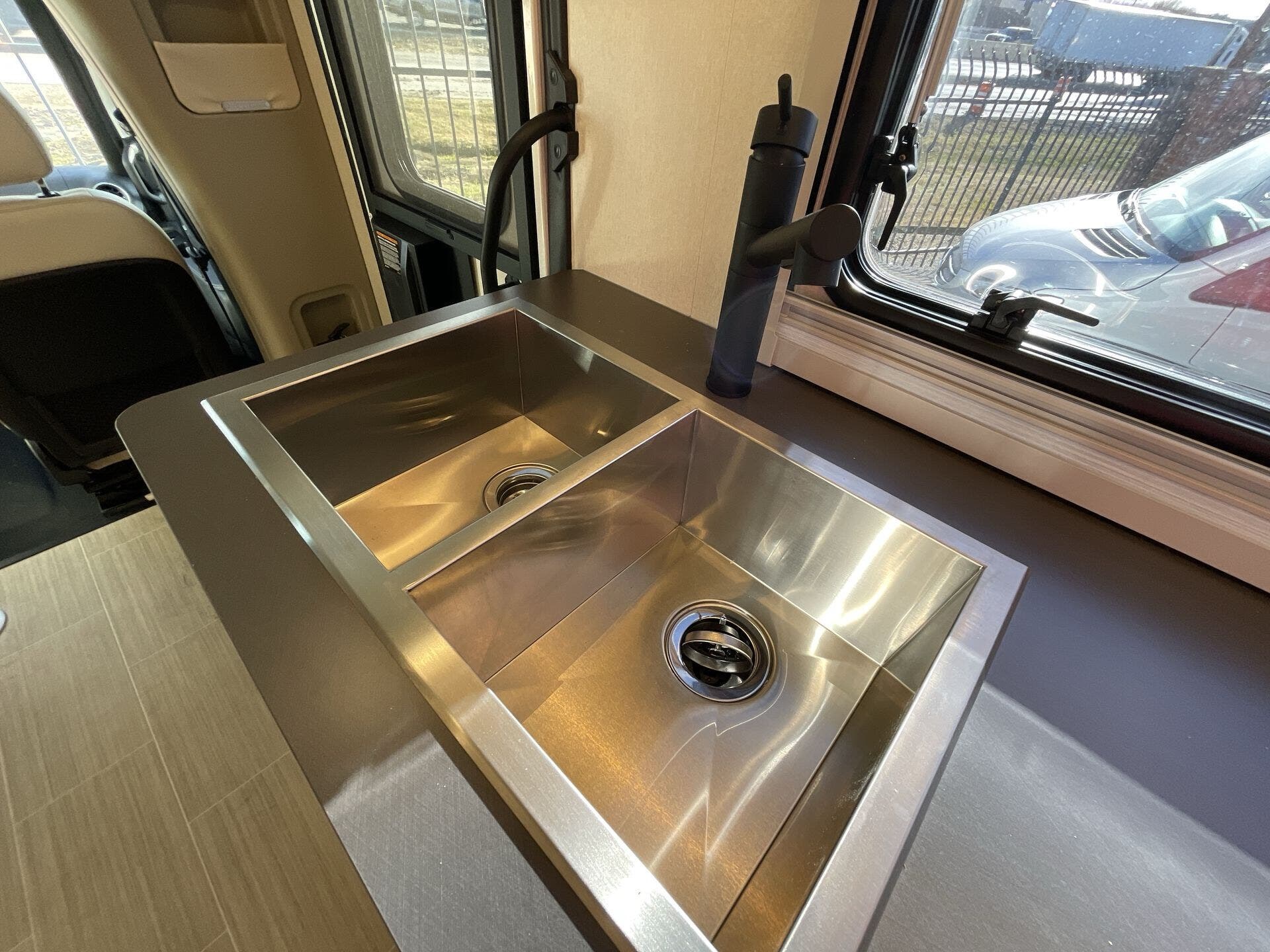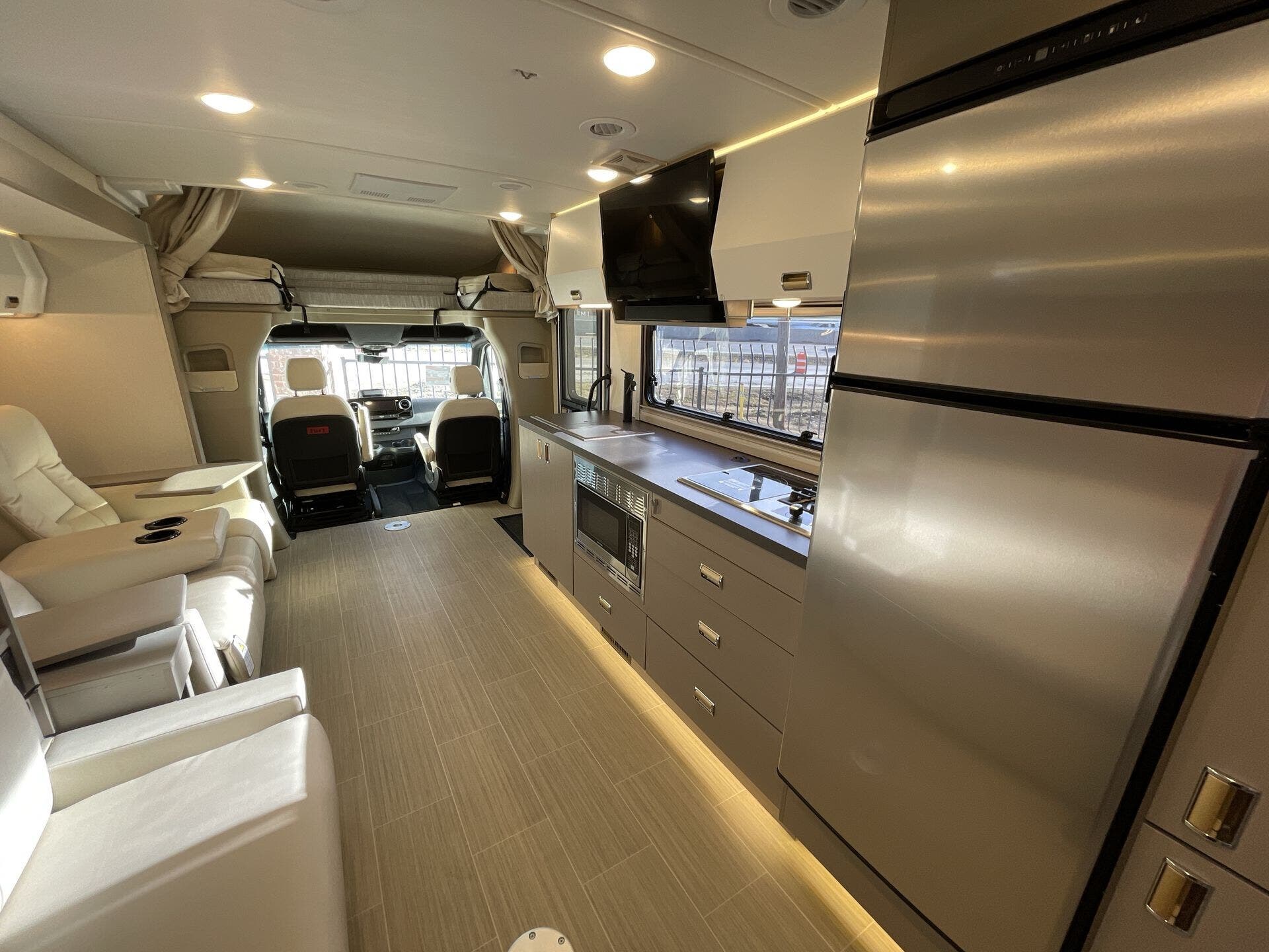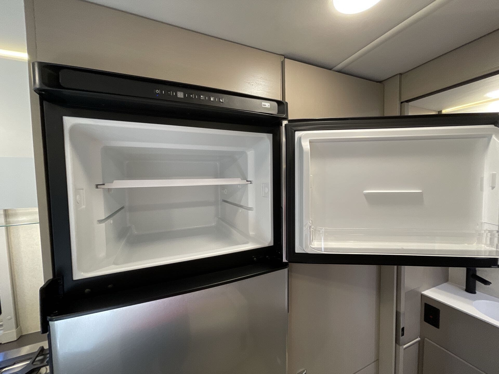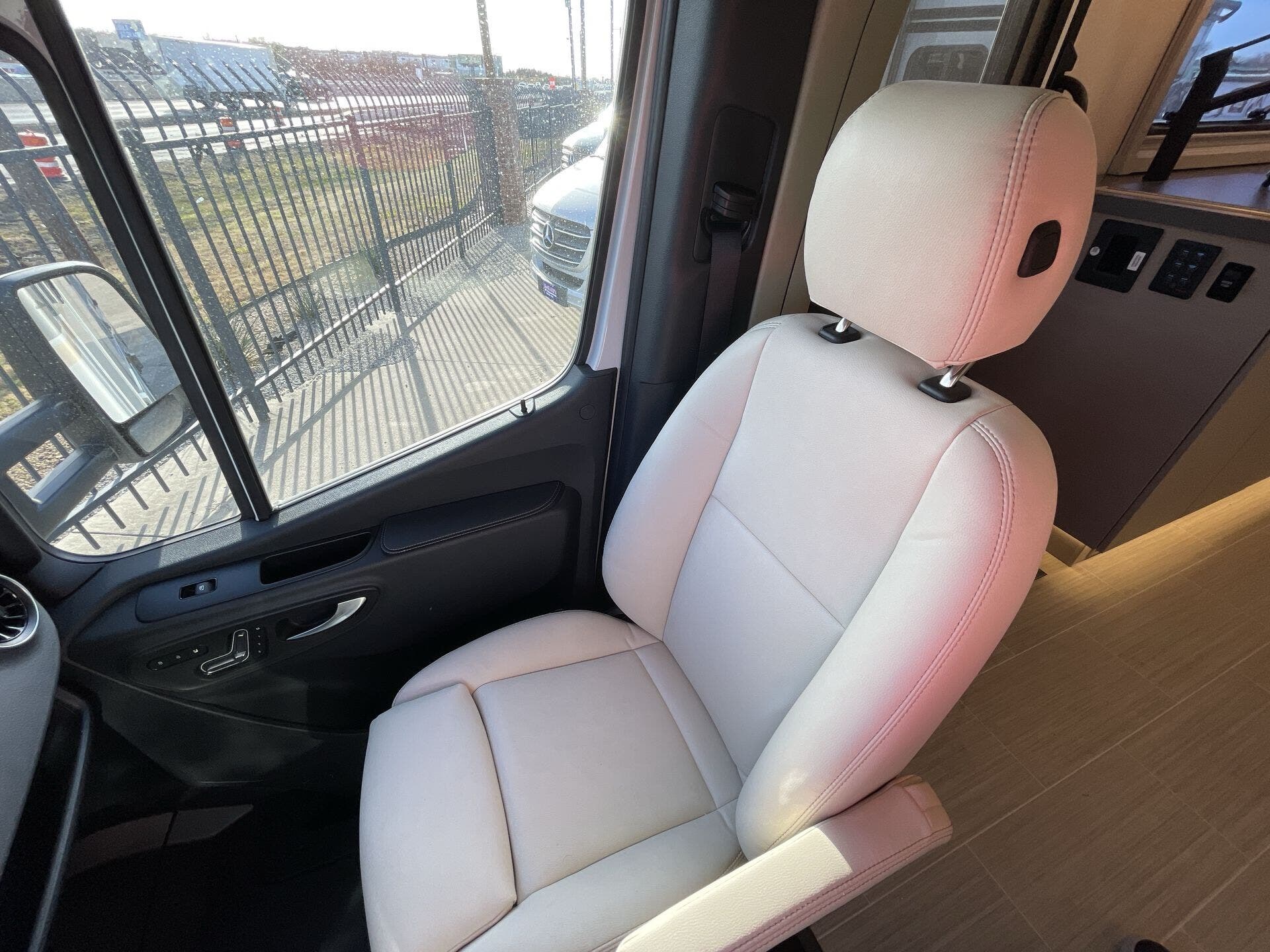 Inside, the 24D features a smart, open layout that maximizes space and livability. The large slide-out expands the living area to include comfortable seating and a versatile dinette, while the fully equipped kitchen offers solid-surface countertops, stainless-steel appliances, and ample storage for extended travel. The cab’s swivel seats integrate seamlessly into the living space, creating an inviting area to relax, dine, or entertain. Premium finishes, LED lighting, and panoramic windows add to the upscale, residential feel.