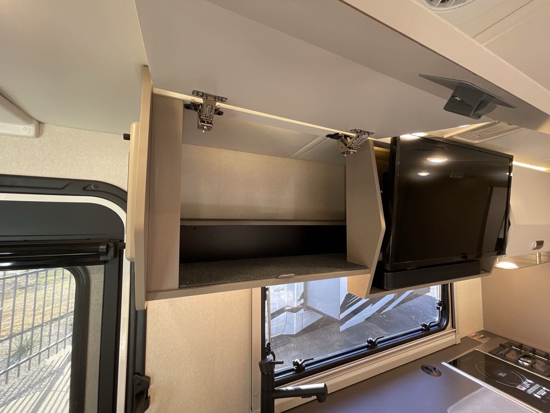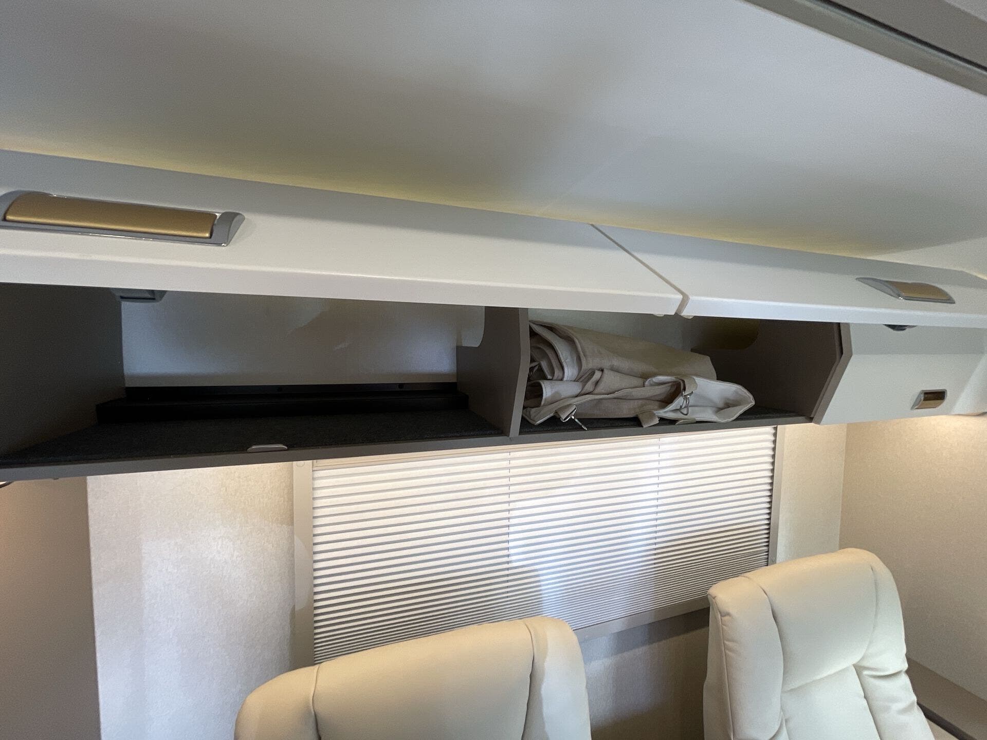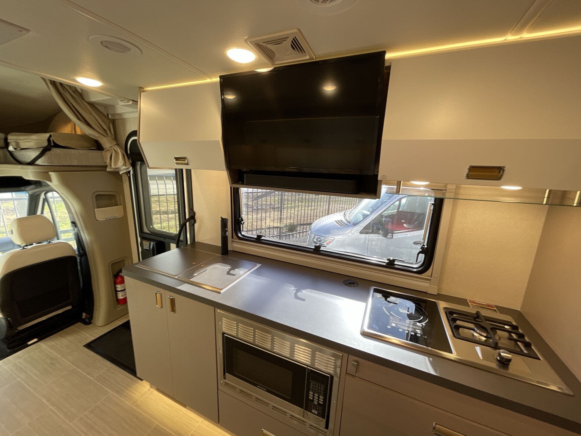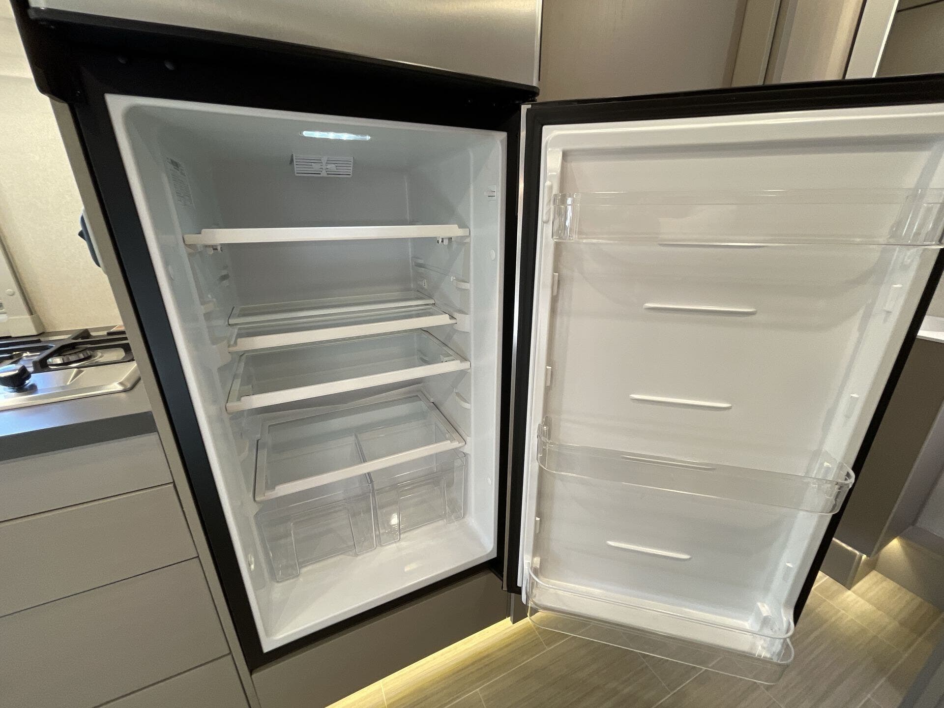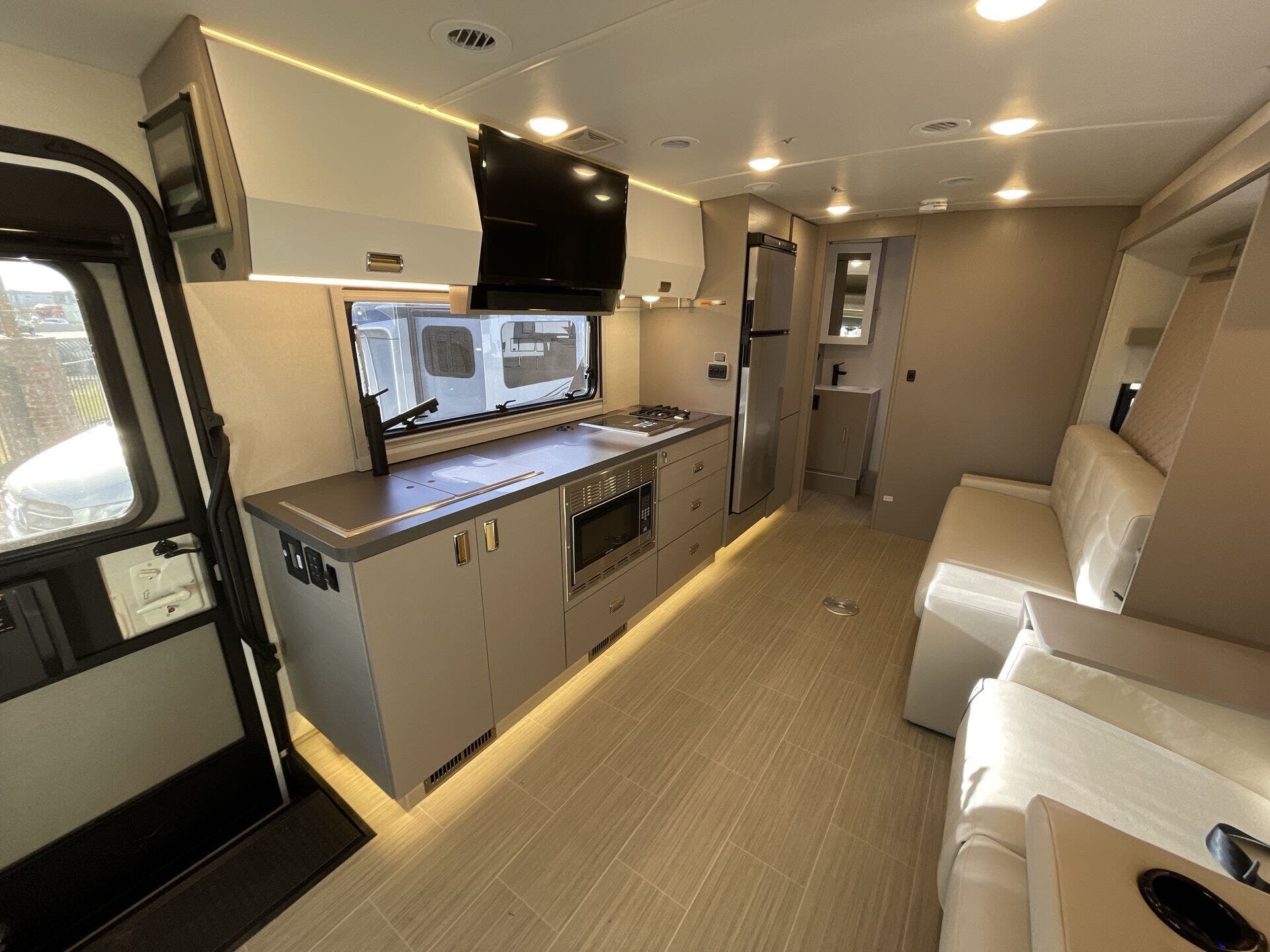 Inside, the 24D features a smart, open layout that maximizes space and livability. The large slide-out expands the living area to include comfortable seating and a versatile dinette, while the fully equipped kitchen offers solid-surface countertops, stainless-steel appliances, and ample storage for extended travel. The cab’s swivel seats integrate seamlessly into the living space, creating an inviting area to relax, dine, or entertain. Premium finishes, LED lighting, and panoramic windows add to the upscale, residential feel.