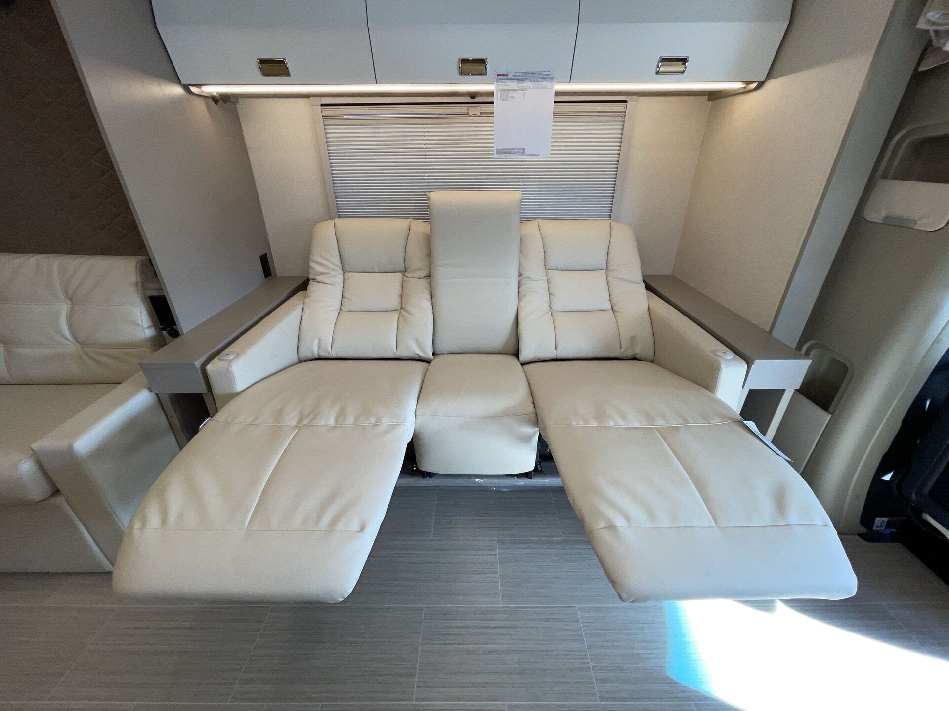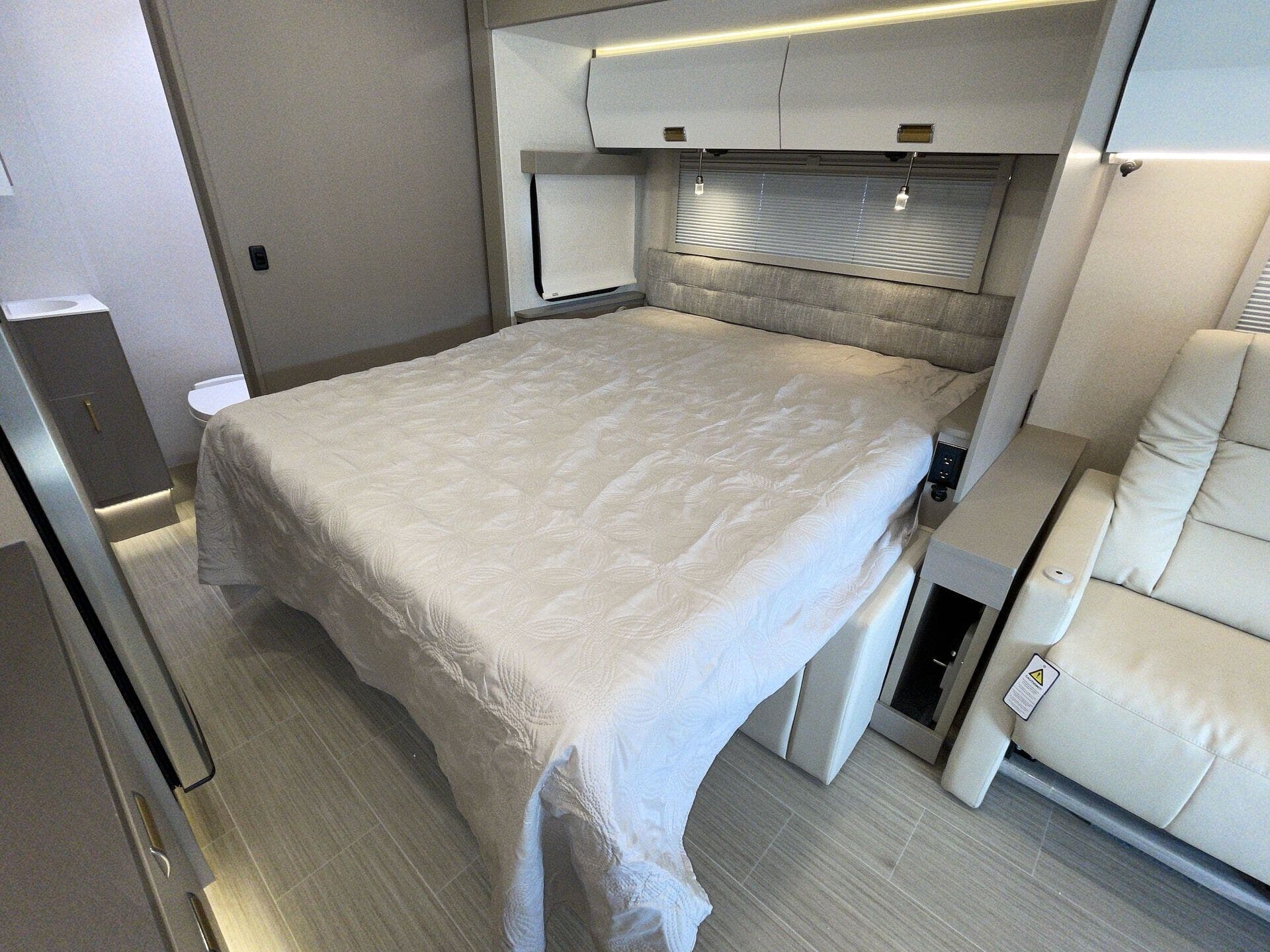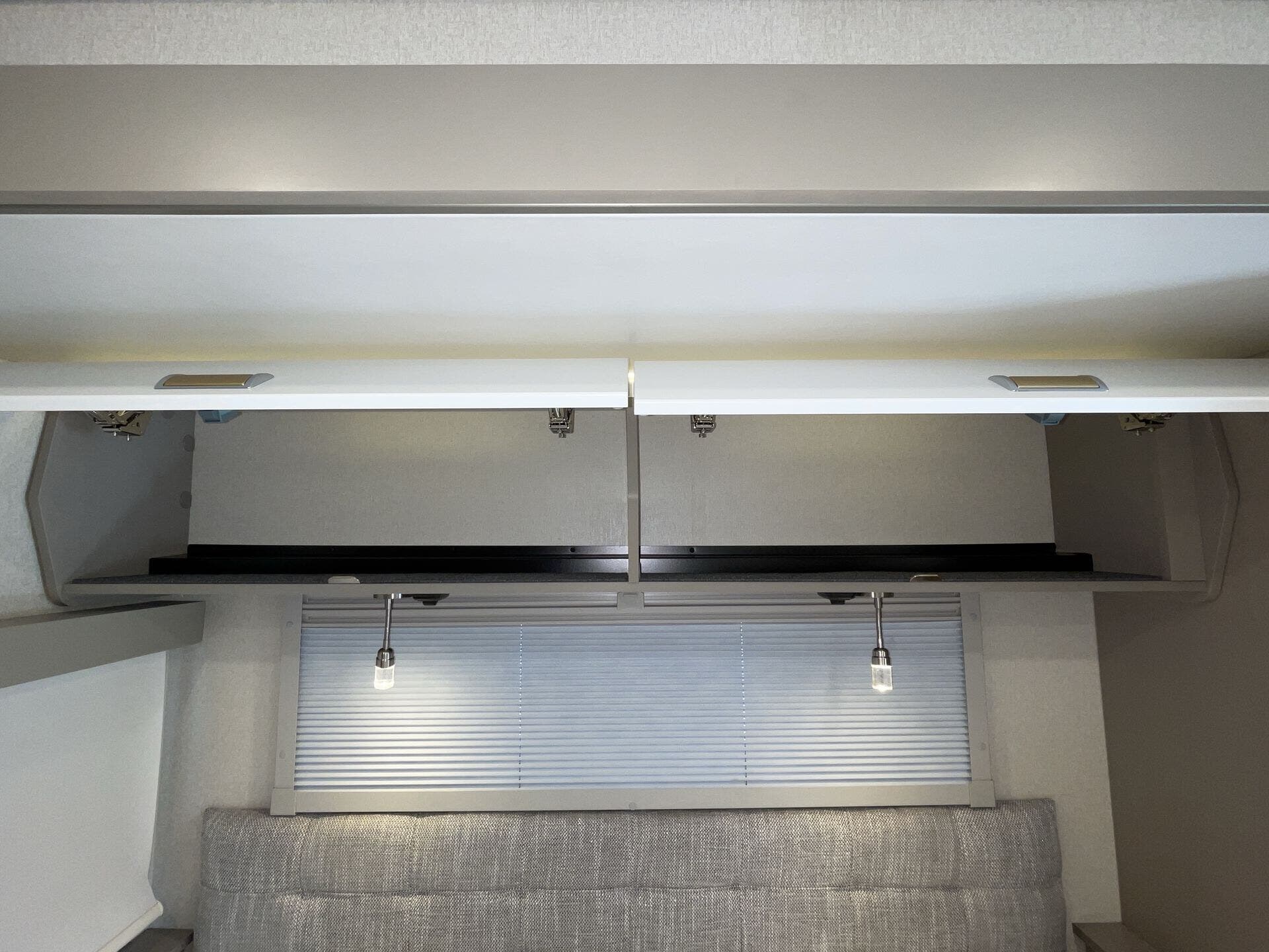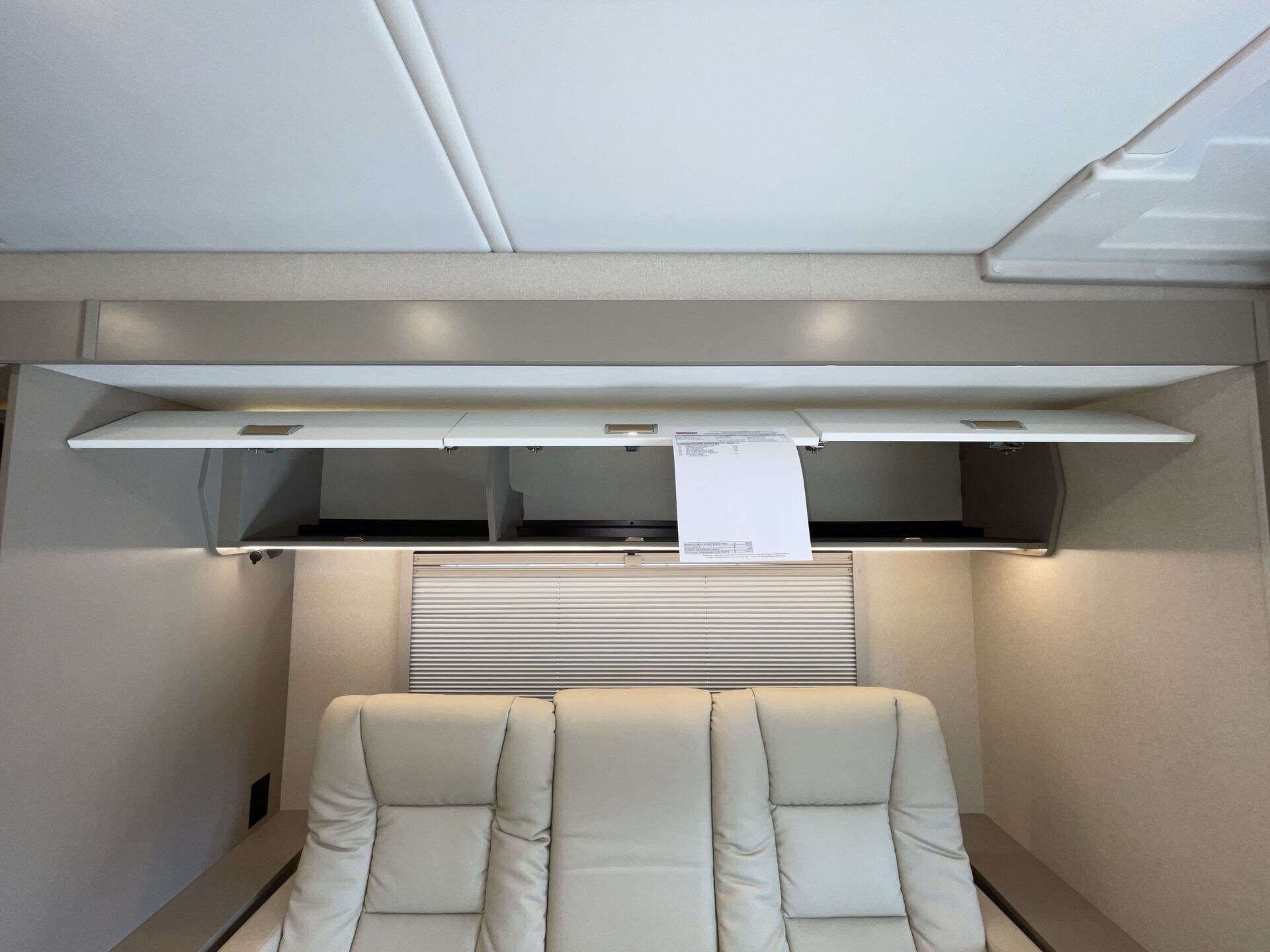 Day/Night Shades, Kitchen Sink, Medicine Cabinet, Mini Blinds, Murphy Bed, Overhead Cabinetry, Pantry, Power Seats, Queen Bed, Removable Table, Roof Vents, Shower, Solid Surface Countertops, Theater Seating, Toilet, Wardrobe(s) -