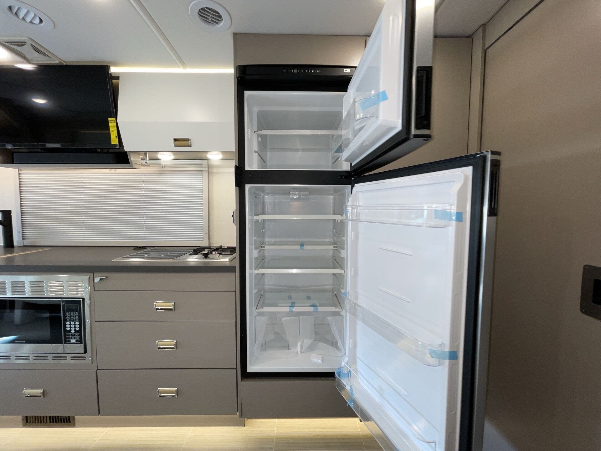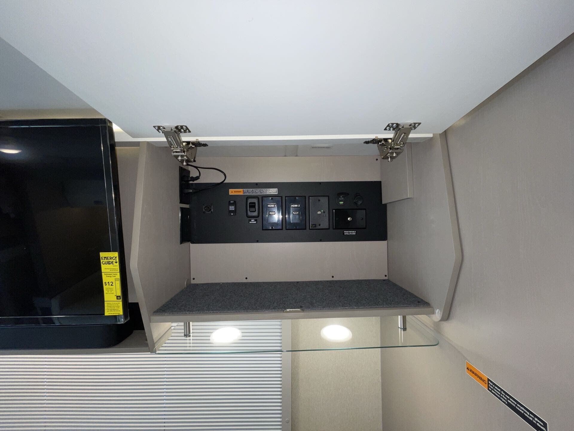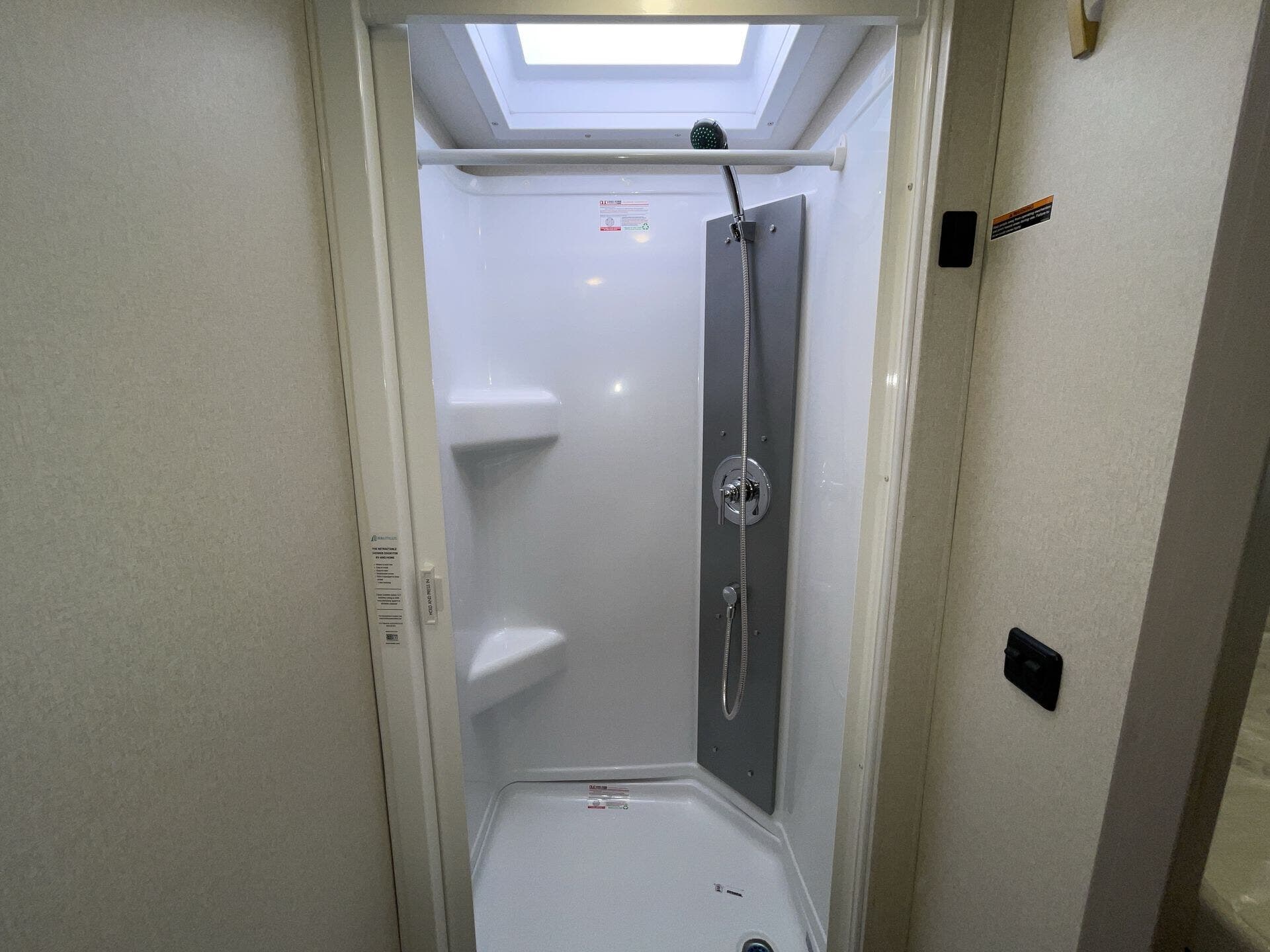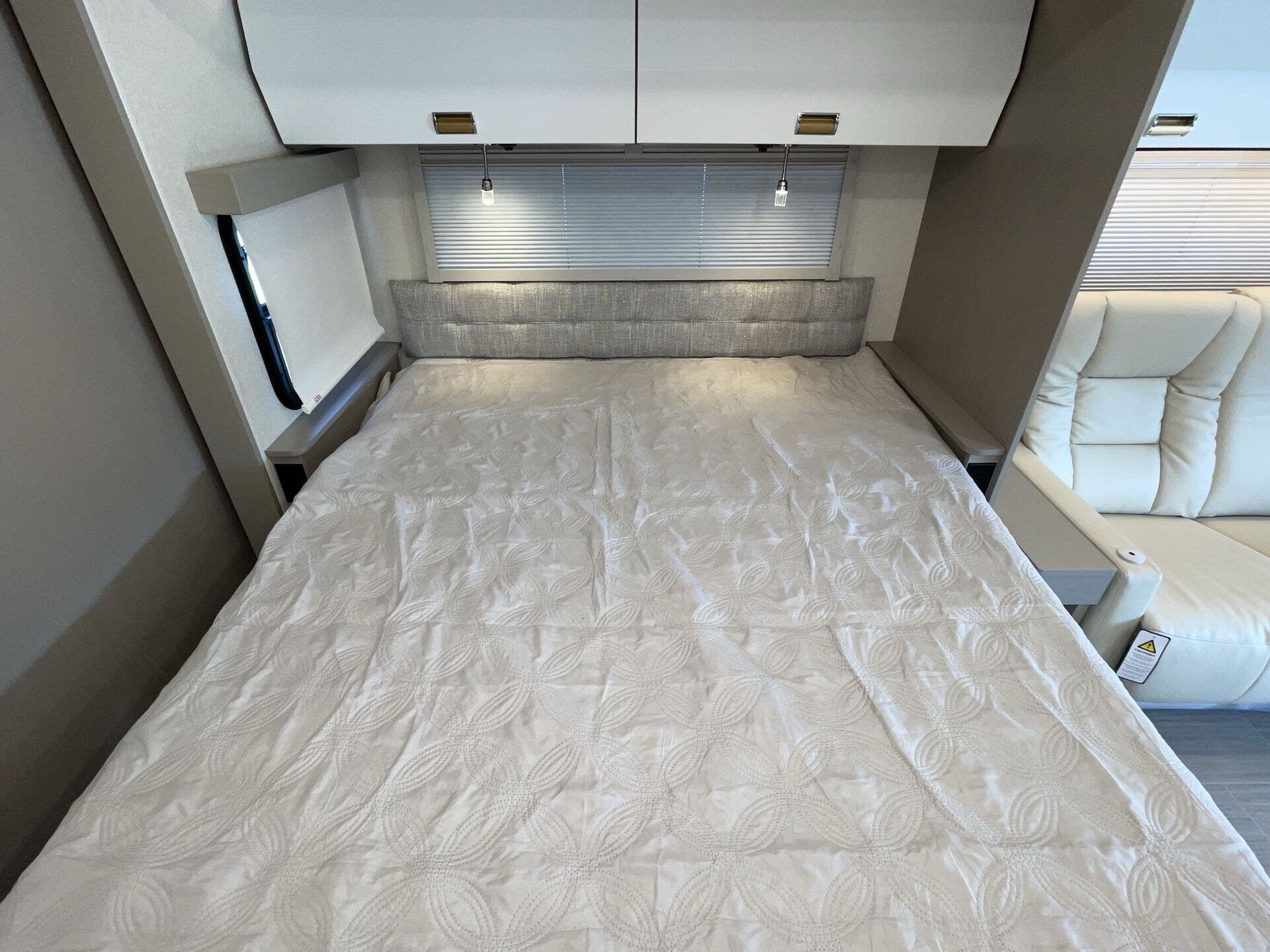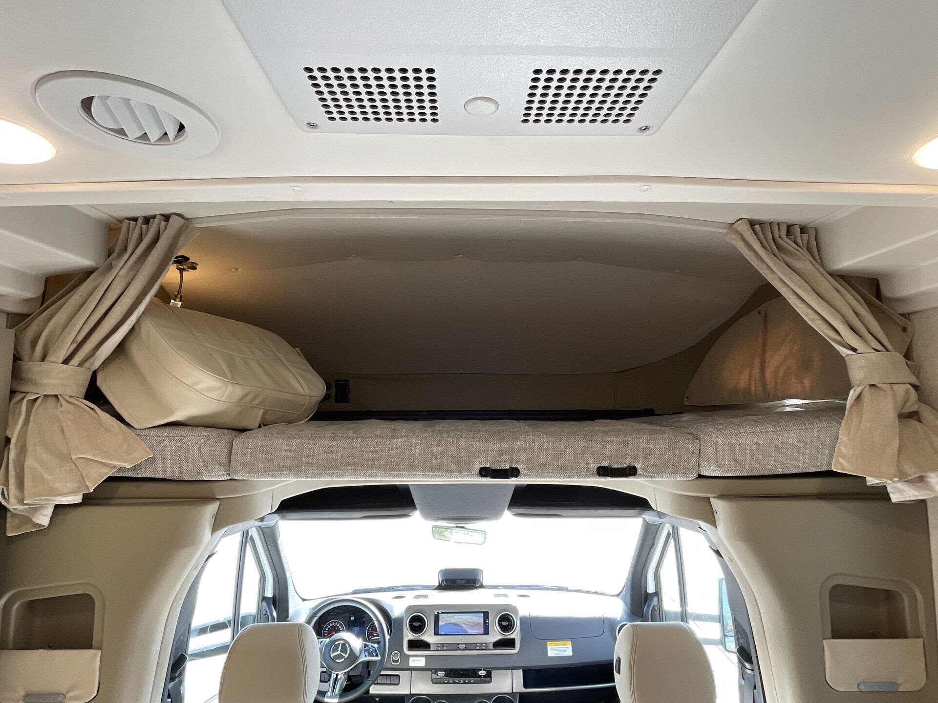 Day/Night Shades, Kitchen Sink, Medicine Cabinet, Mini Blinds, Murphy Bed, Overhead Cabinetry, Pantry, Power Seats, Queen Bed, Removable Table, Roof Vents, Shower, Solid Surface Countertops, Theater Seating, Toilet, Wardrobe(s) -