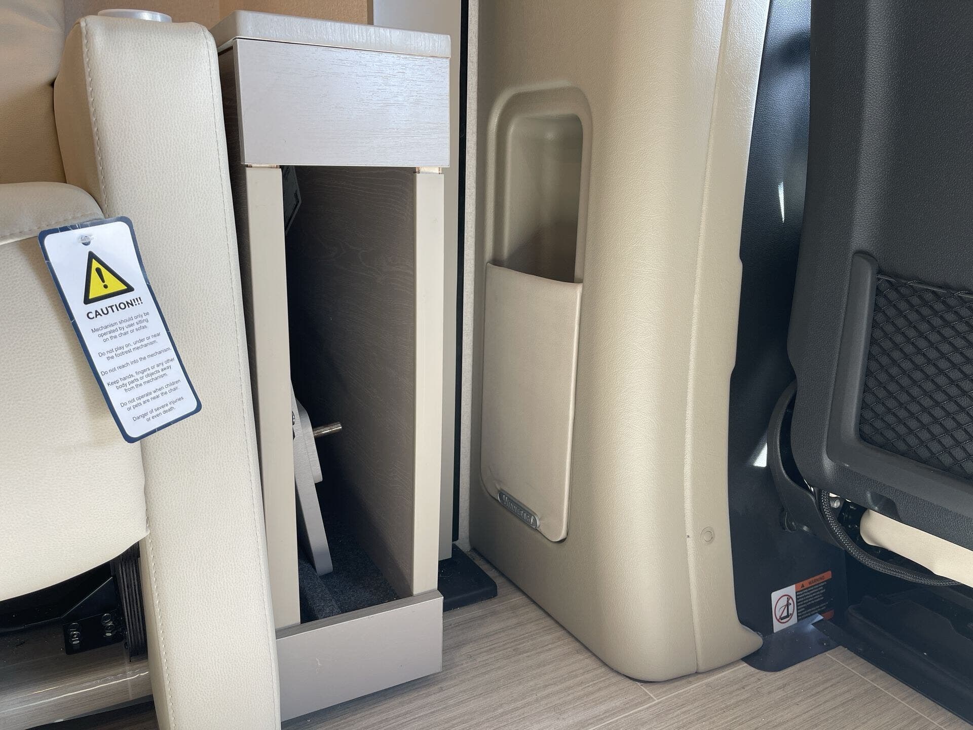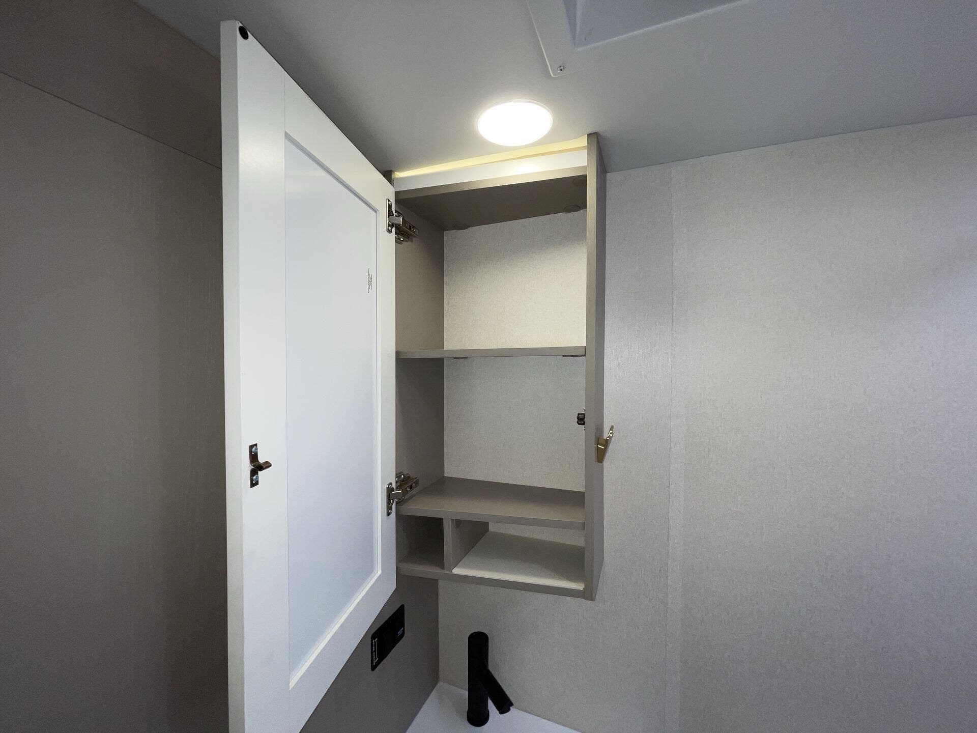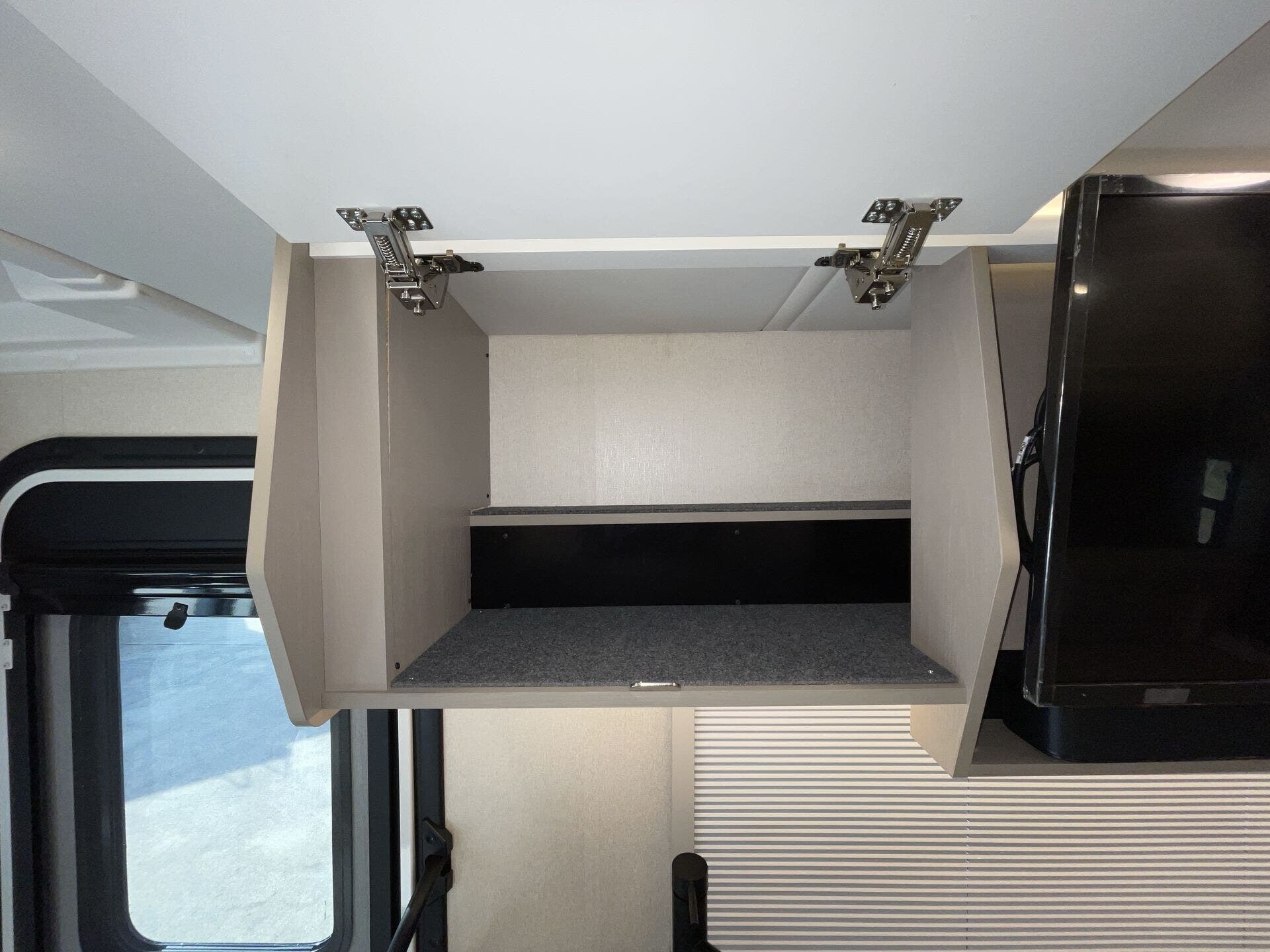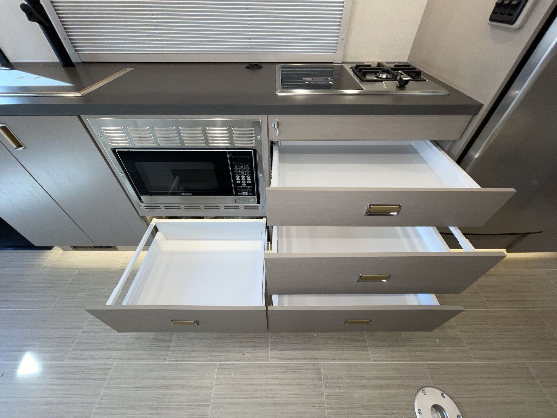 Day/Night Shades, Kitchen Sink, Medicine Cabinet, Mini Blinds, Murphy Bed, Overhead Cabinetry, Pantry, Power Seats, Queen Bed, Removable Table, Roof Vents, Shower, Solid Surface Countertops, Theater Seating, Toilet, Wardrobe(s) -