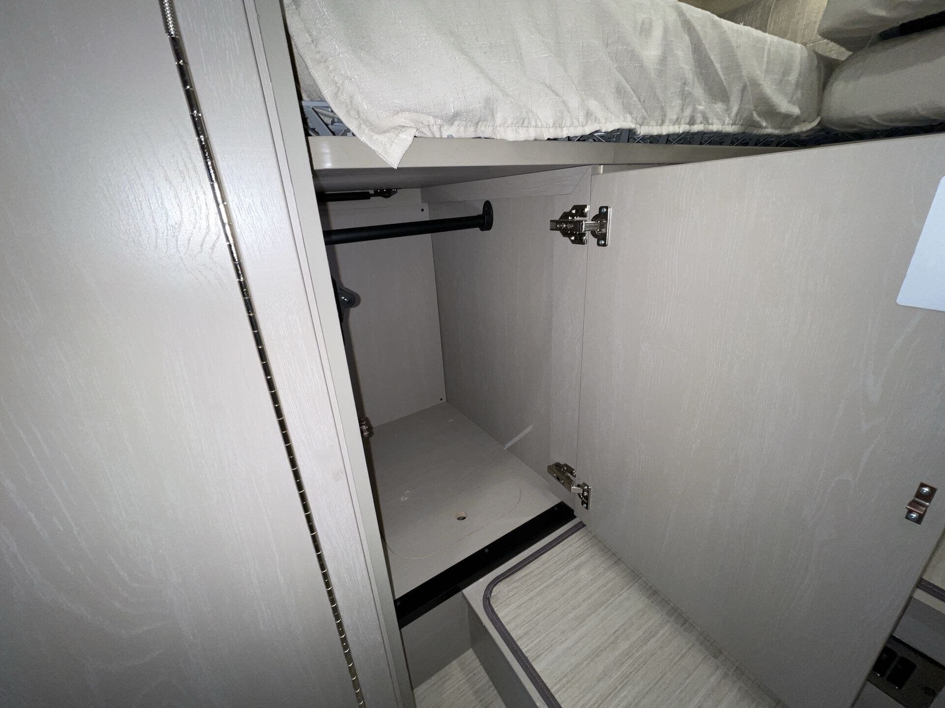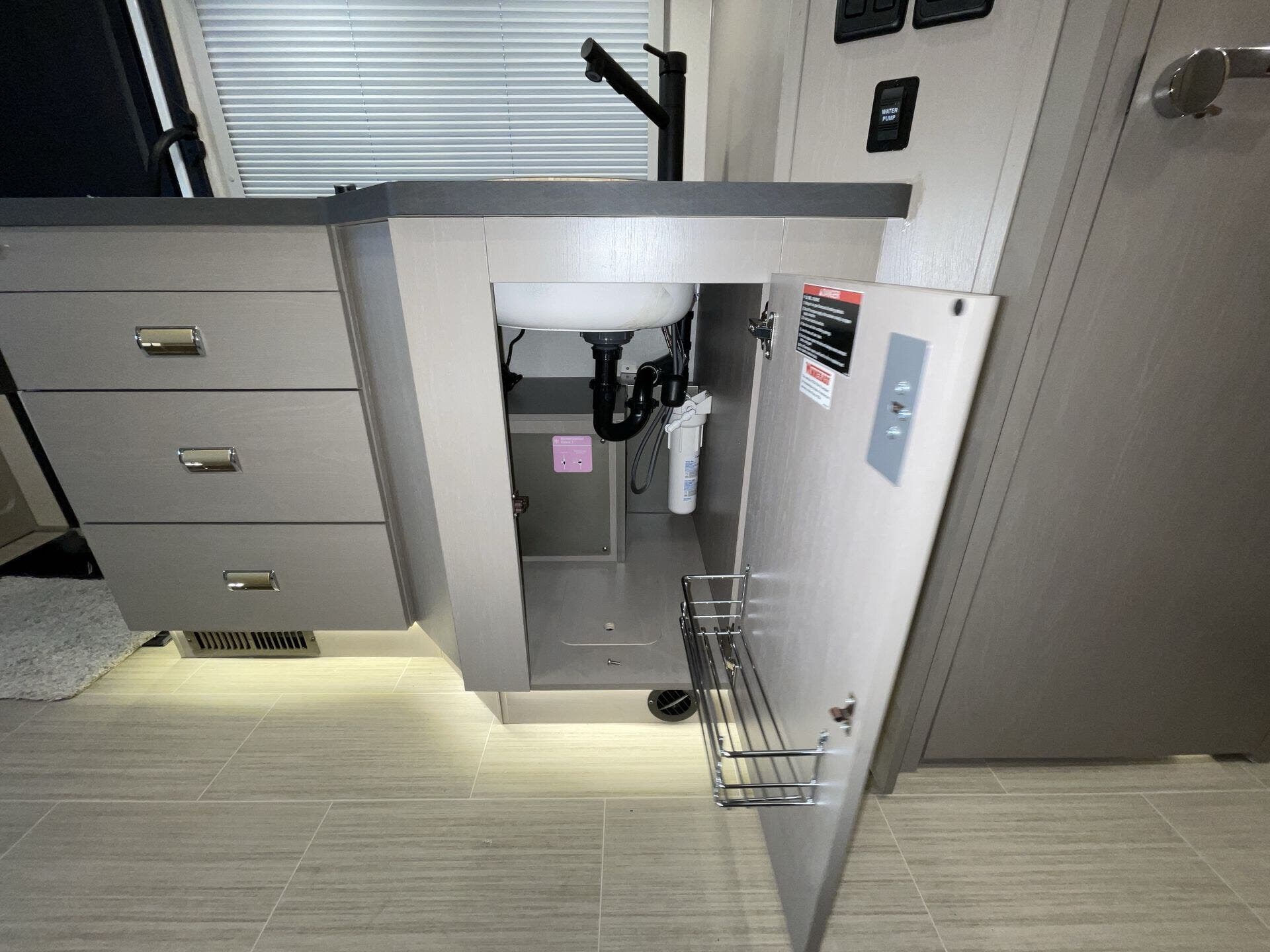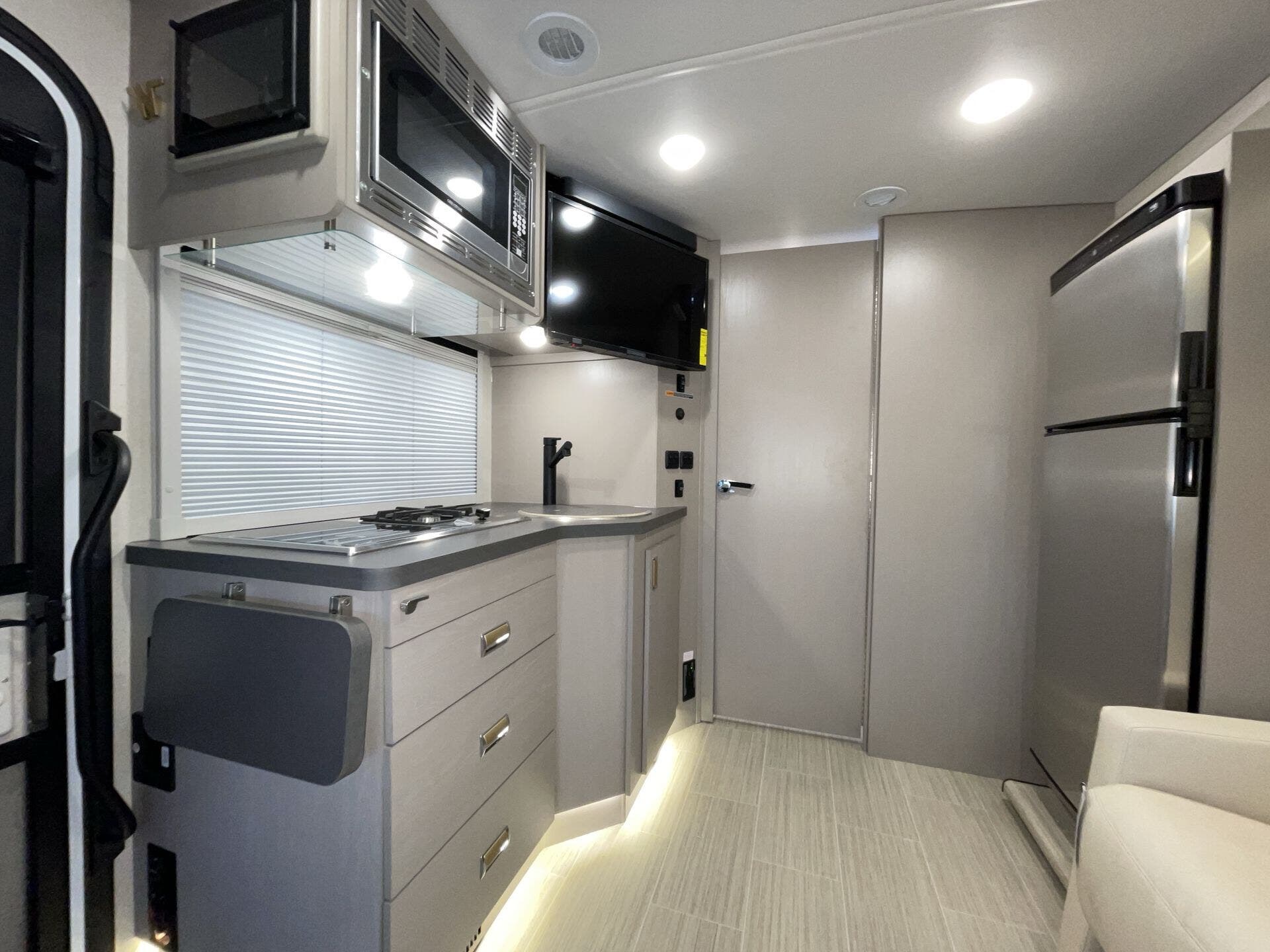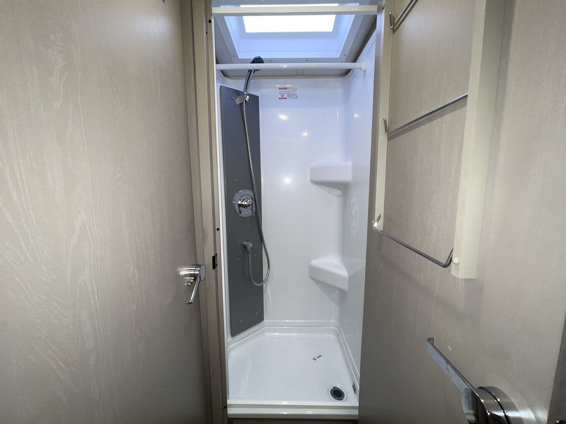 The gear garage and extra storage make it easy to bring bikes, luggage, or whatever else you need without cluttering the main living space. The kitchen is practical, tank sizes are solid, and there’s plenty of storage for trips of any length.