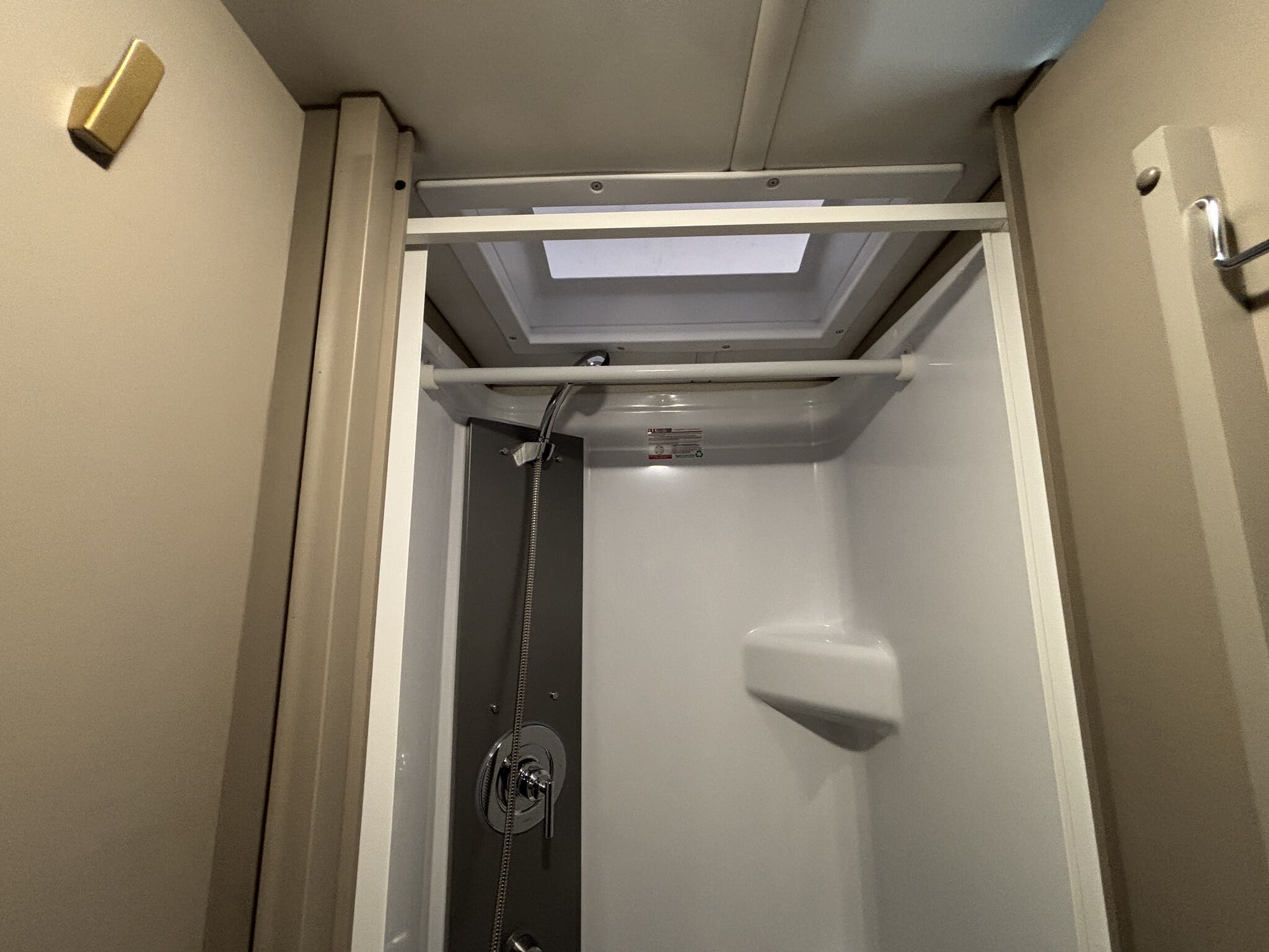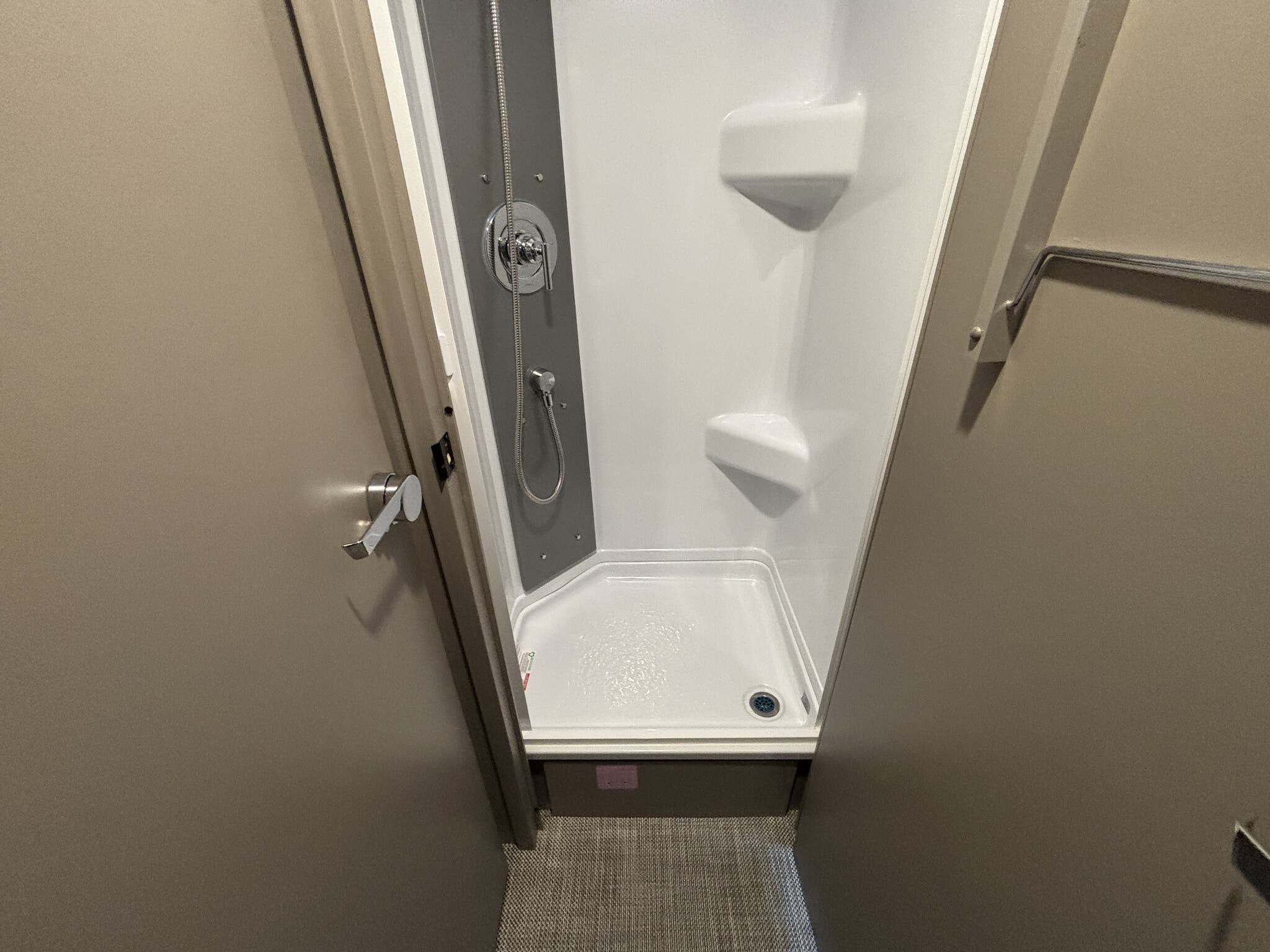 - Convenient amenities like an external shower, power entrance step, roof vent, skylight, and slide-out awning for outdoor comfort.