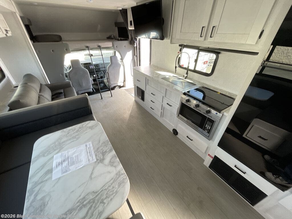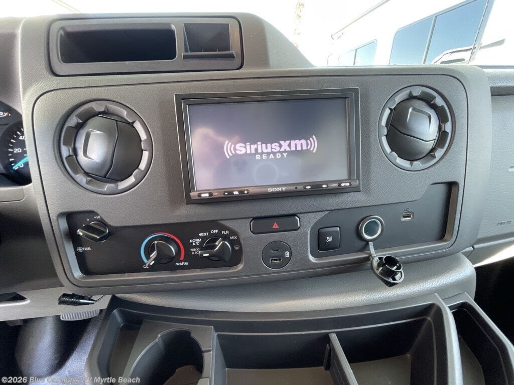 With any Entrada Class C gas motorhome from EAST TO WEST, the construction consists of a one-piece painted fiberglass front cap, a TPO roof membrane, and 2" Azdel composite sidewalls for added durability. There are rotocast exterior storage compartments with slam latch doors, along with an exterior LP Quick Connect, and a power awning with an LED light strip. You will also find rear and sideview cameras to help make maneuvering and parking your RV easier than ever. Inside, you'll feel right at home with soft close hardwood cabinet doors and drawers, a high-altitude tankless water heater, plus a 12V smart TV and USB ports to keep your electronics charged up!
