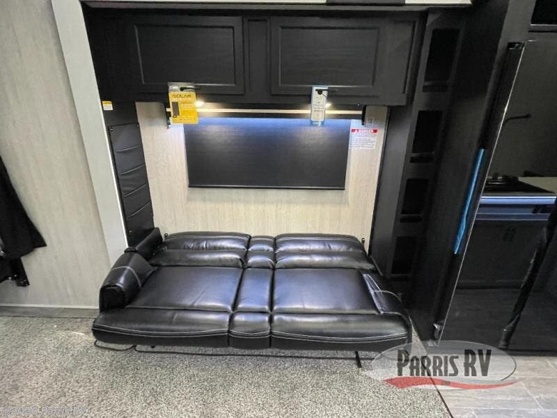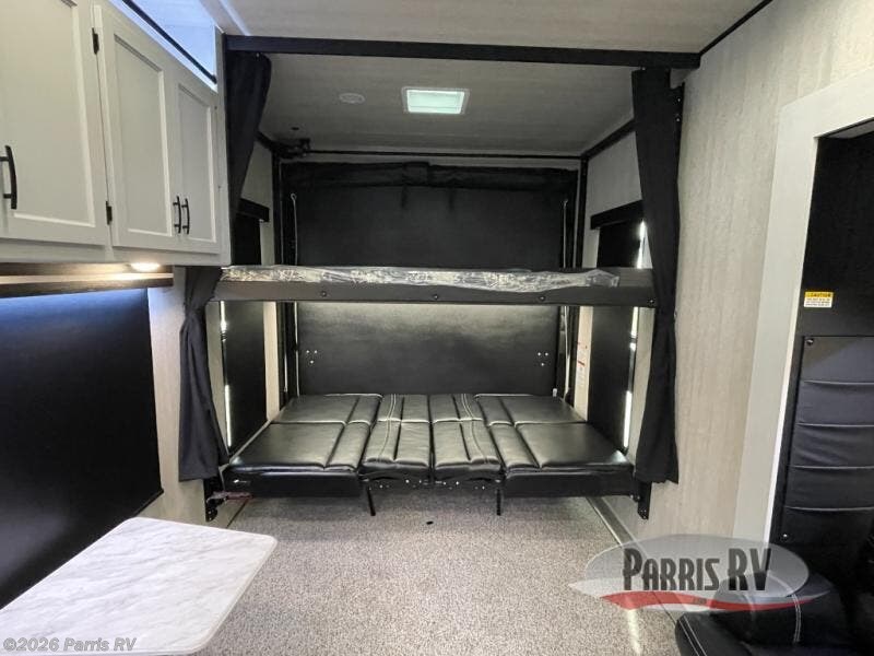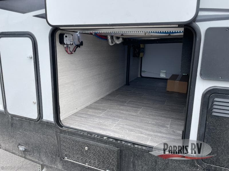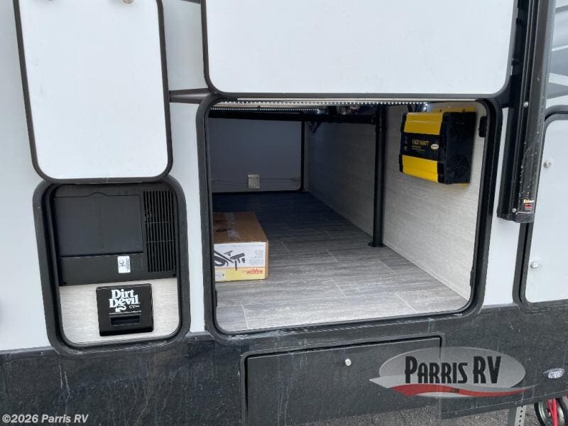 Wherever you decide to camp, this toy hauler is sure to bring fun. There is a front master bedroom with an RV king bed and a nightstand, plus a vanity/wardrobe slide that will provide more space. Your guests can sleep on the power queen bed after the toys are unloaded from the 16' 4" garage, and in the morning, they can relax on the power sofa bed under the top bed. The kitchen includes everything you need each day to prepare meals; a three burner cooktop, microwave oven, and an extra large double door refrigerator. You'll also appreciate the slam-door luggage compartments to store your larger camp gear, the 40 gallon fuel station to keep your toys ready to go, and the power awning with LED lights for an outdoor living space!