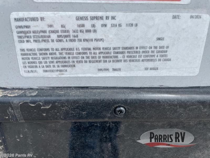 Request More Info on this 2027 Genesis Supreme Rage'n 3016RIKS Offered for sale by Parris RV