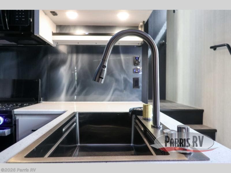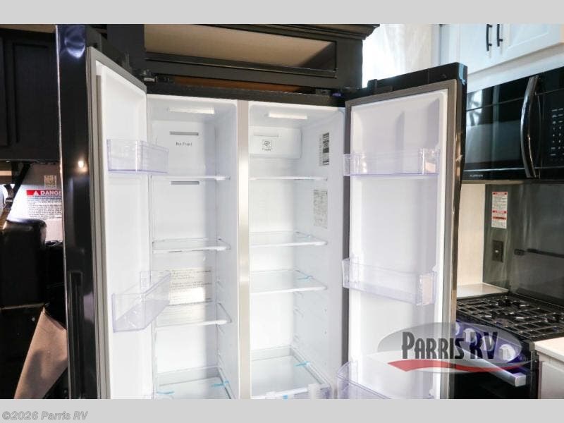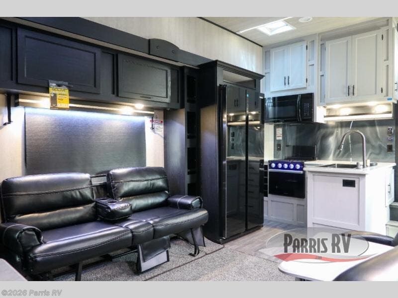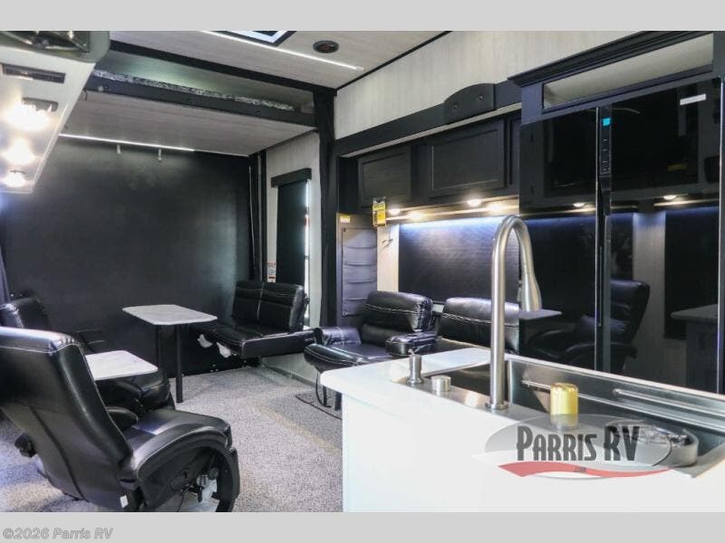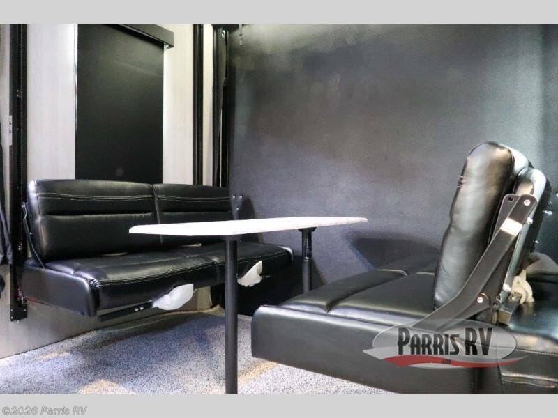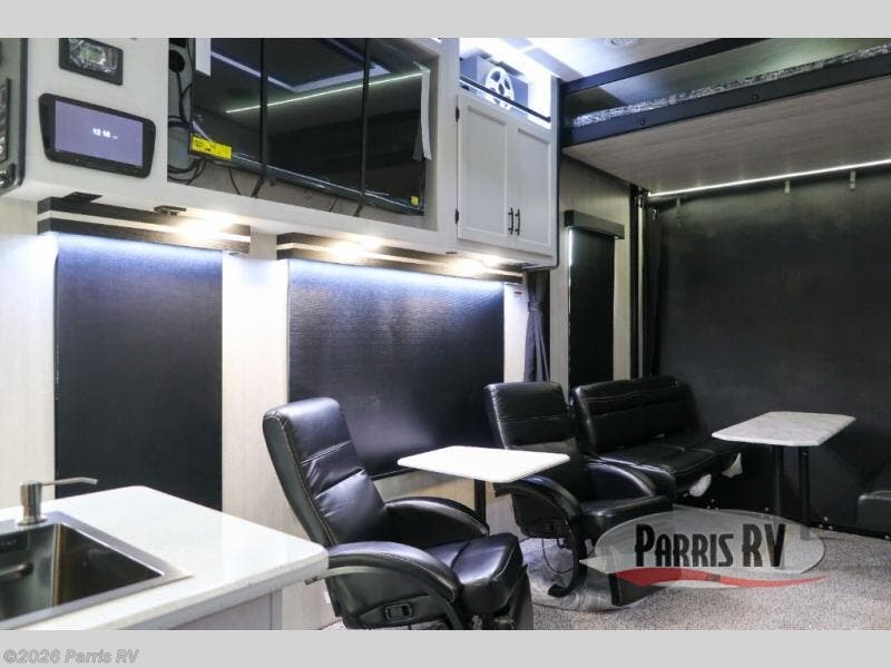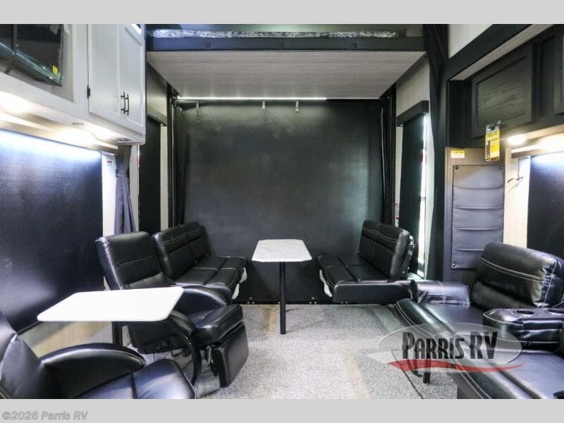 Stand out from the crowd with this Vortex toy hauler! You can enjoy a comfortable night of rest on your very own king-size bed in the front master suite. This space has a wardrobe slide for storing your sweaters, a nightstand to place your alarm clock on, and a countertop on the other side of the bed that you can place décor on. The kitchen is equipped with great tools, like the three-burner range that you can use to fry up some eggs and bacon, and you'll also be able to take a load off in the two lounge chairs.