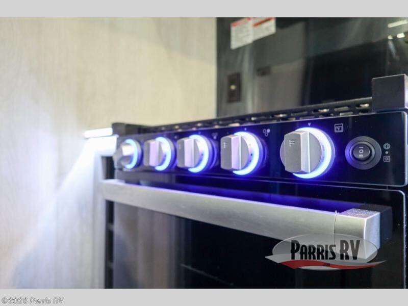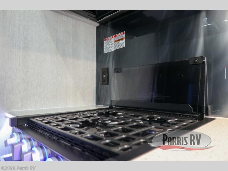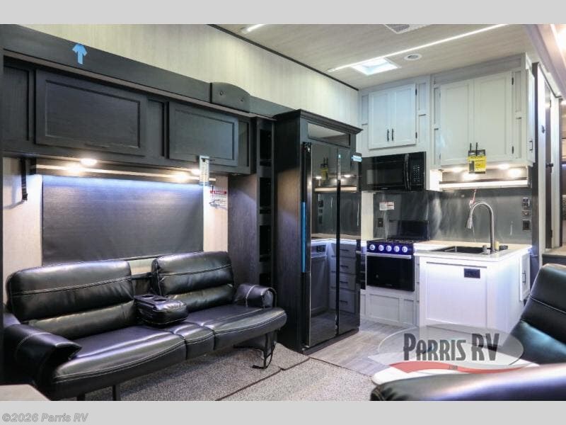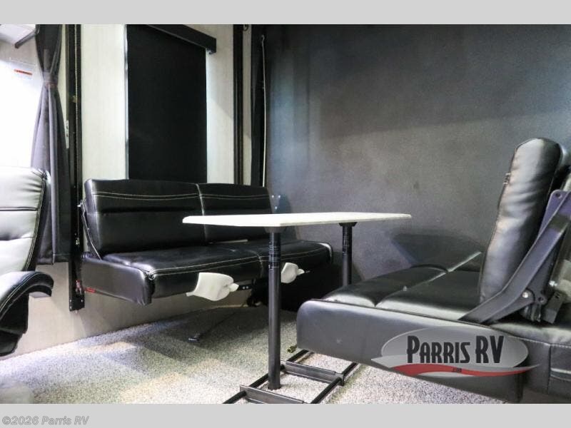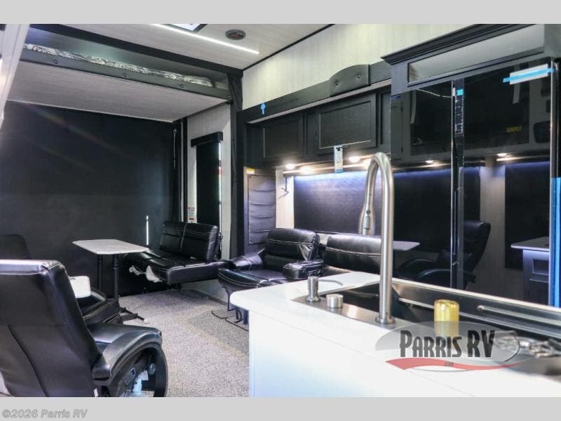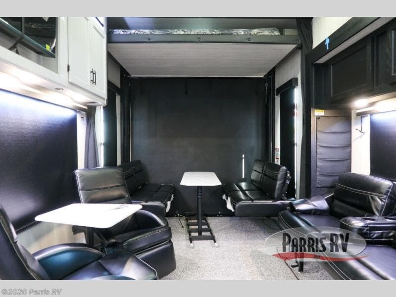 Stand out from the crowd with this Vortex toy hauler! You can enjoy a comfortable night of rest on your very own king-size bed in the front master suite. This space has a wardrobe slide for storing your sweaters, a nightstand to place your alarm clock on, and a countertop on the other side of the bed that you can place décor on. The kitchen is equipped with great tools, like the three-burner range that you can use to fry up some eggs and bacon, and you'll also be able to take a load off in the two lounge chairs.