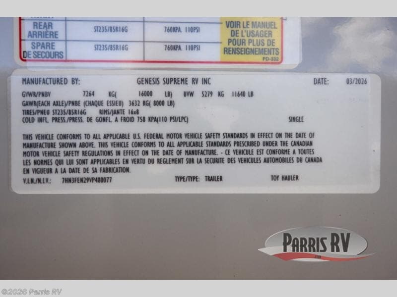Request More Info on this 2027 Genesis Supreme Vortex 2814IKS Offered for sale by Parris RV