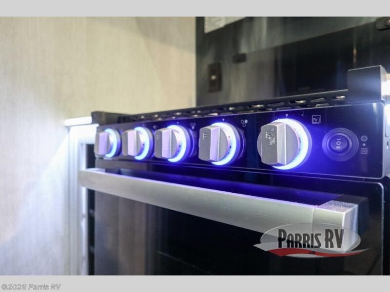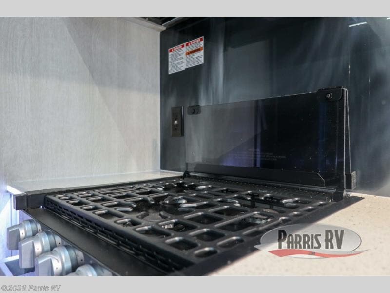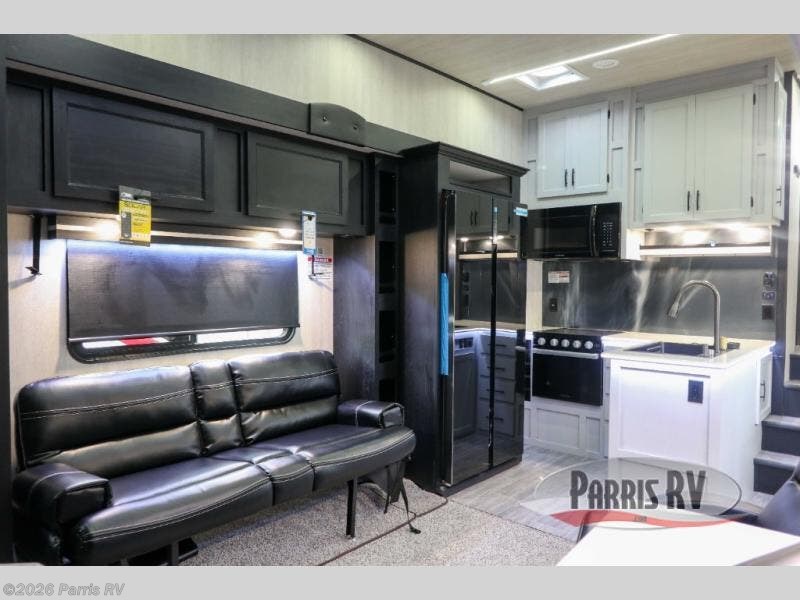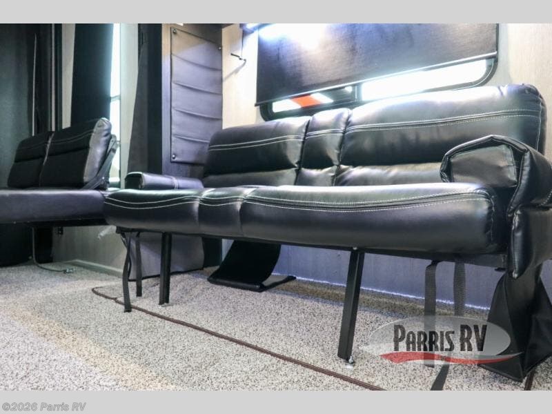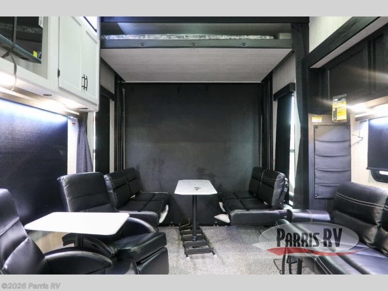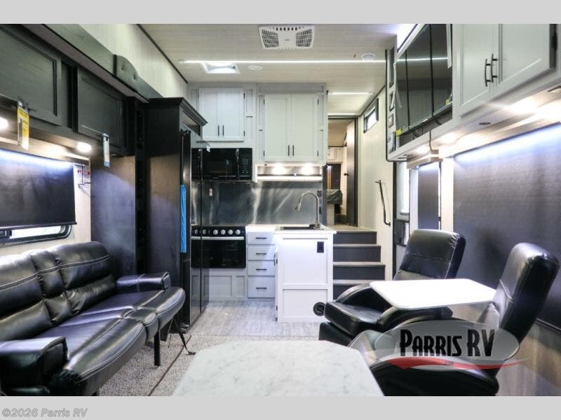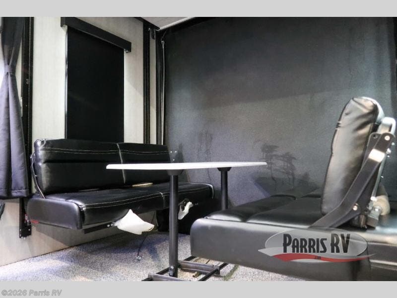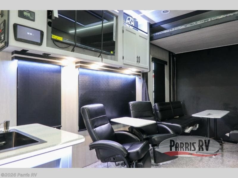 Stand out from the crowd with this Vortex toy hauler! You can enjoy a comfortable night of rest on your very own king-size bed in the front master suite. This space has a wardrobe slide for storing your sweaters, a nightstand to place your alarm clock on, and a countertop on the other side of the bed that you can place décor on. The kitchen is equipped with great tools, like the three-burner range that you can use to fry up some eggs and bacon, and you'll also be able to take a load off in the two lounge chairs.