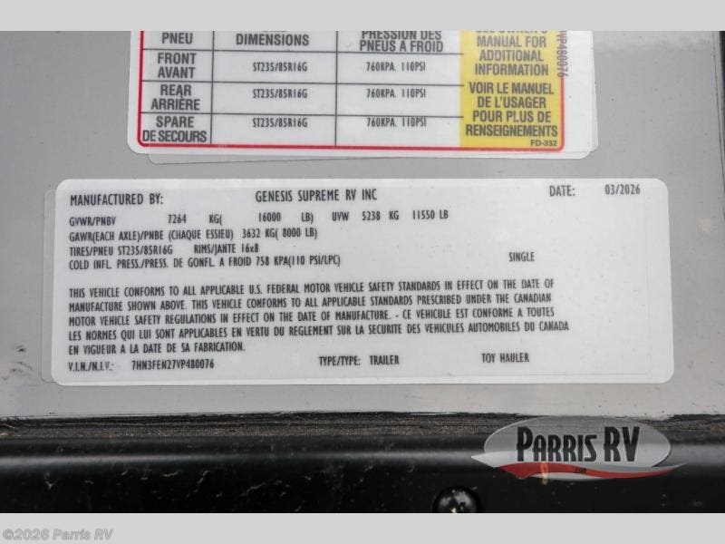 Request More Info on this 2027 Genesis Supreme Vortex 2814IKS Offered for sale by Parris RV