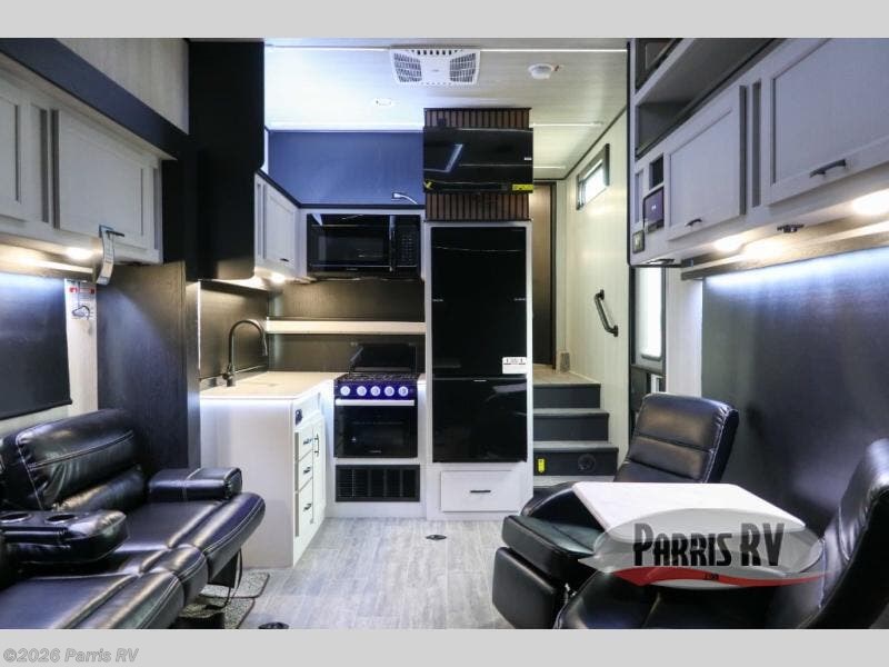 This unit is just like model 2815, except features a higher profile with plenty of room. You can store your ATVs in the 15' 11" garage on this Vortex toy hauler and use the 7' laminated ramp door with beaver tail to get them out. For other gear, there are slam-door storage compartments, and you'll also be able to put fresh products in the 6-cubic foot double-door refrigerator. When you get hungry, use the three-burner range to make a fresh batch of French toast, and when you get tired, use the RV queen bed, power queen bunk, and sofa bed to get some rest. You can also add space to the interior by adding the two optional slides.