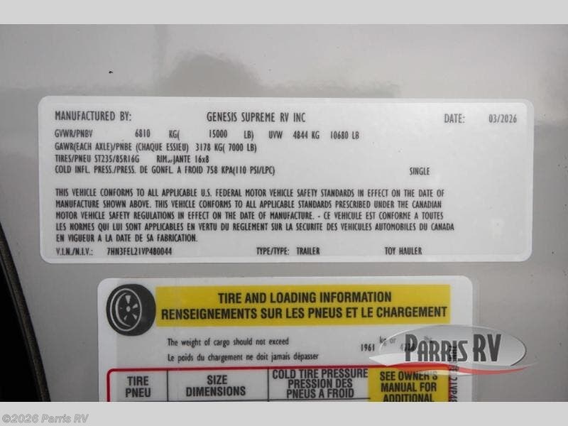 Request More Info on this 2027 Genesis Supreme Vortex 2815VT Offered for sale by Parris RV