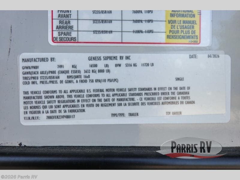 Request More Info on this 2027 Genesis Supreme Vortex 3016IKS Offered for sale by Parris RV