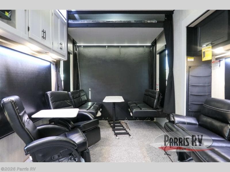 If you want to get away for the weekend with your toys, get away with this Vortex toy hauler. It has a 16' 4" garage to keep your ATVs and dirt bikes secure while you travel. You can accommodate a group of six for sleeping with the king-size bed, power queen bunk and sofas, and everyone will benefit from a hot meal prepared on the three-burner range in the kitchen. You can even keep your cold items fresh by storing them in the refrigerator. The dual-entry bathroom has a door within the main hallway, but it also has a private entrance that leads into the bedroom.