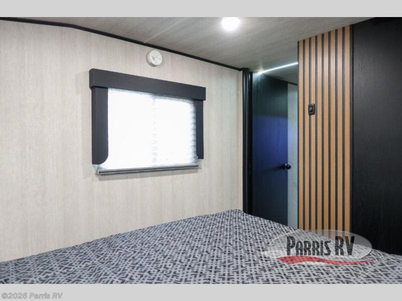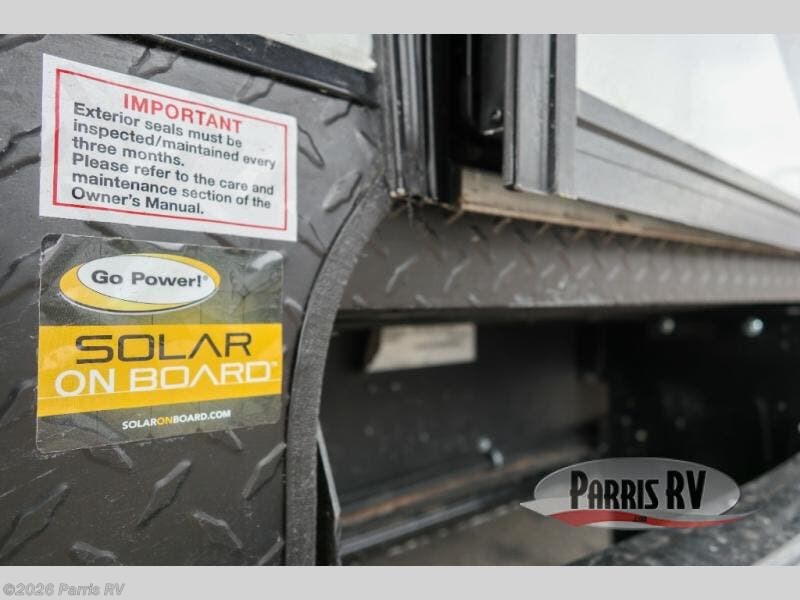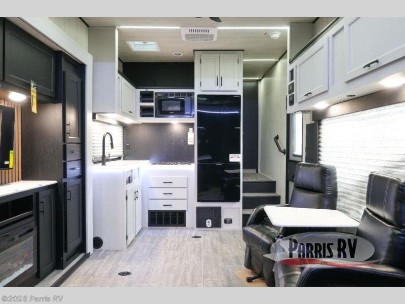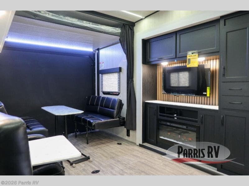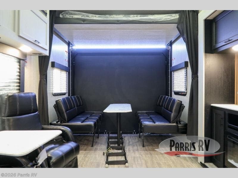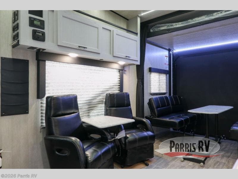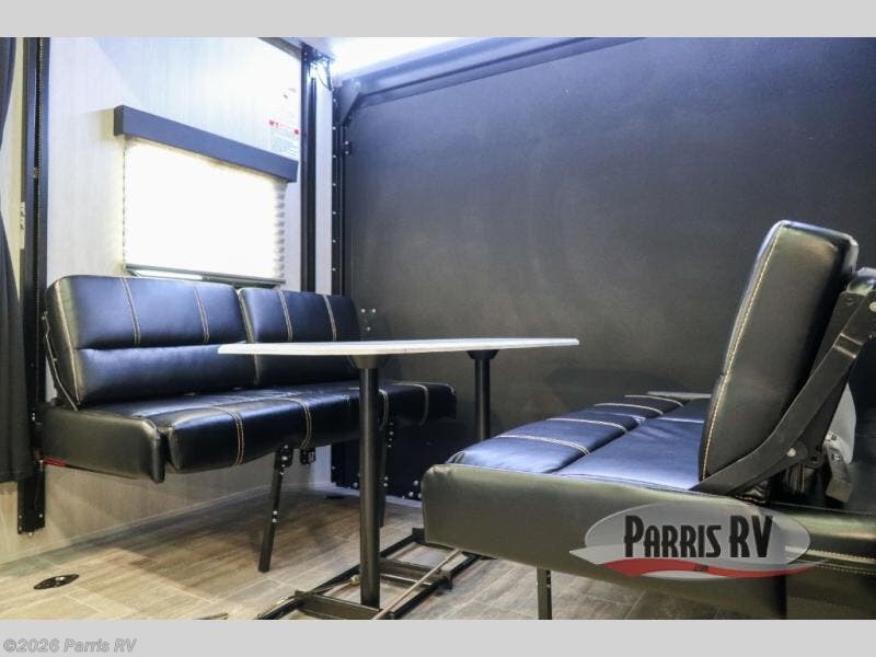 This toy hauler is ready for adventure when you are! There are two swivel/rocker chairs with a table and picture window where you can enjoy your coffee at each morning. The entertainment center slide out also includes a fireplace and pantry to keep dry goods. A 7' laminated ramp door will make it easy to unload your toys, and there is an opposing rear power dinette in the garage area that will provide more sleeping space for guests. The full kitchen and bath are sure to come in handy when you're camping all weekend, and you'll love having a private bedroom up front, complete with a queen bed, nightstand, and a dresser!