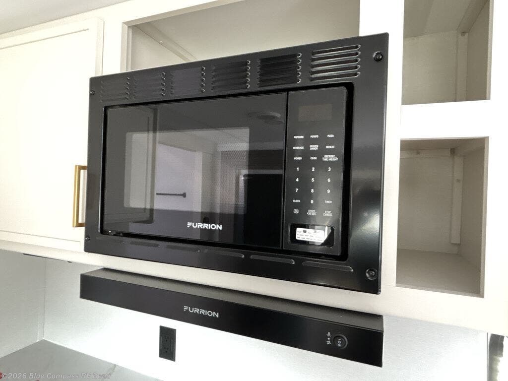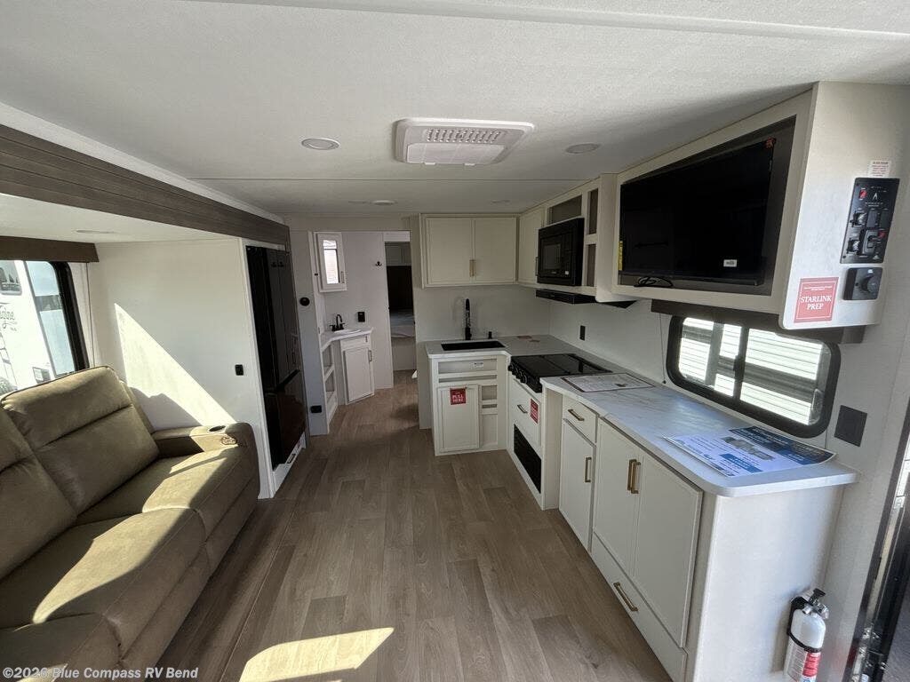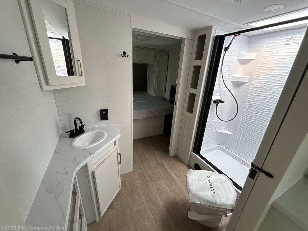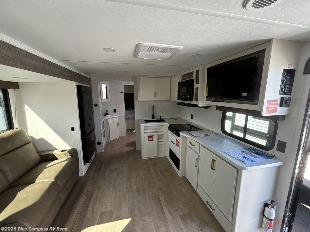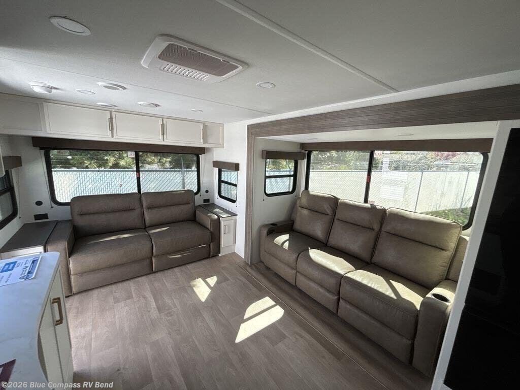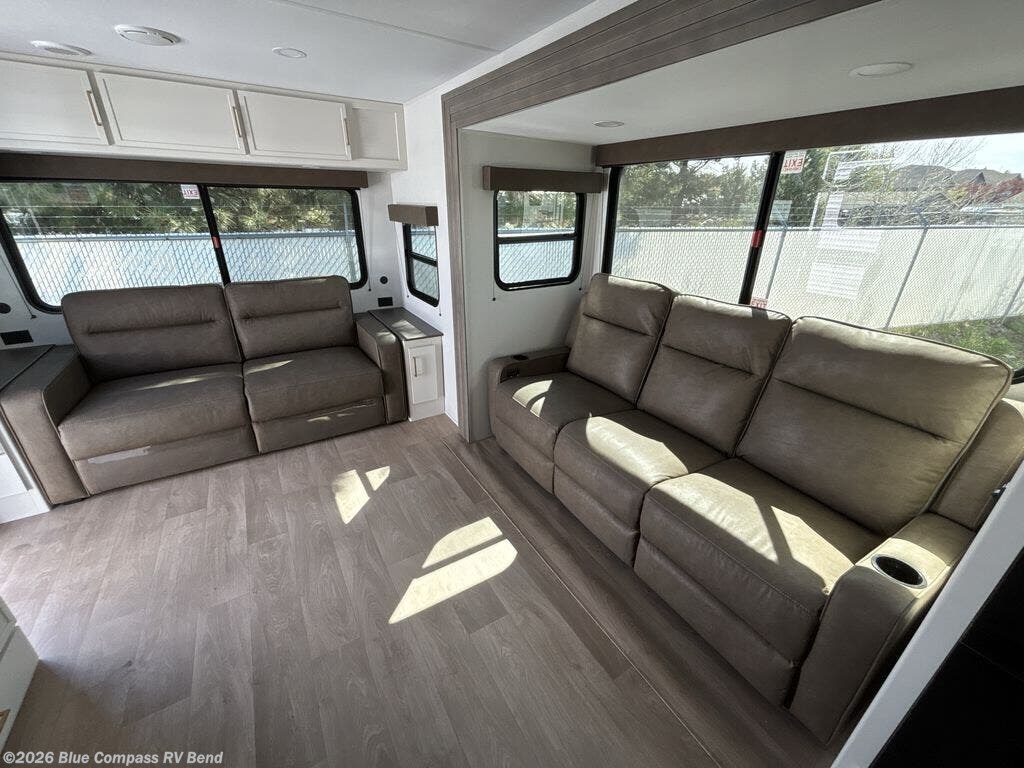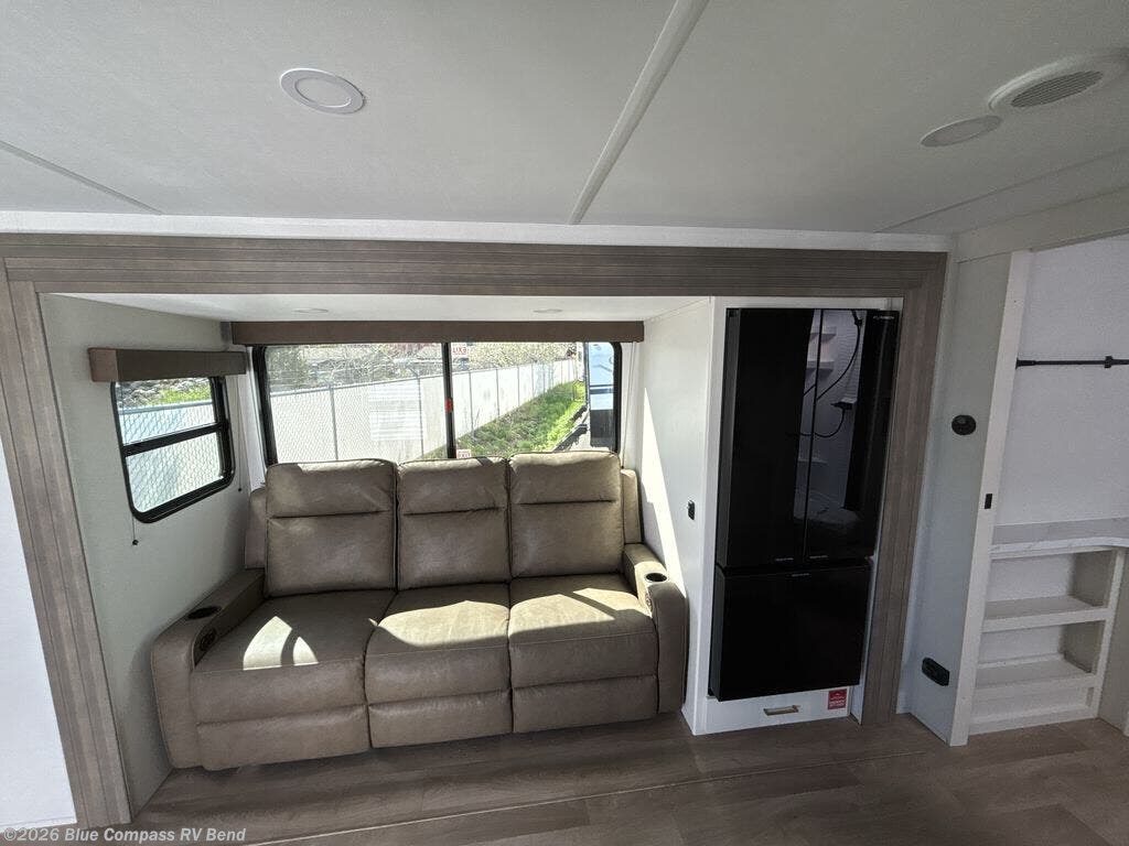the amount of interior space you have in the living area thanks to the U-shaped dinette slide, which can be switched out for optional theater seats. The rear 69" EZ glide sofa will be perfect for guests to sleep on, and the 32" TV lets you enjoy movie nights. There is a three burner range and convection microwave/combo air fryer to cook meals inside, or you can cook on the exterior griddle with a 1.7 cu. ft. refrigerator. And the 17' power awning will provide much wanted shade as you visit with friends. Back inside, the walk-thru bath is both spacious and convenient since it can be accessed from the main living area and the front master bedroom. Here, you'll find a queen bed, storage space, plus TV prep if you want to add a television. You even have your own exterior entry door for convenience!