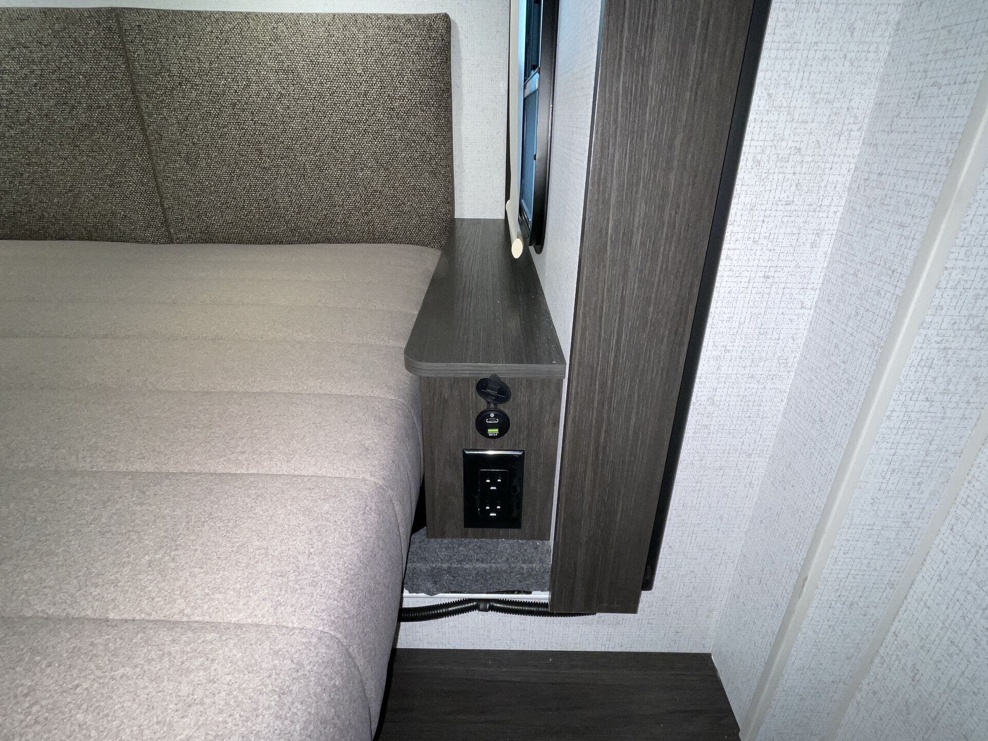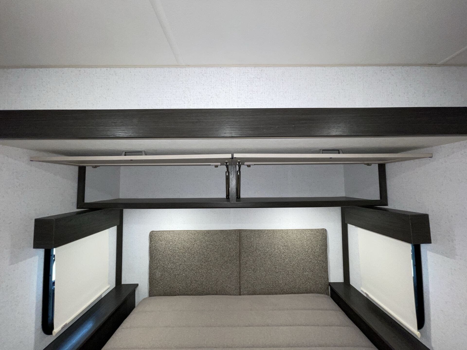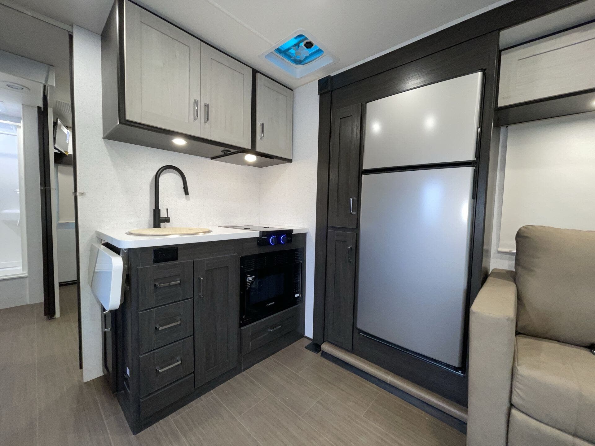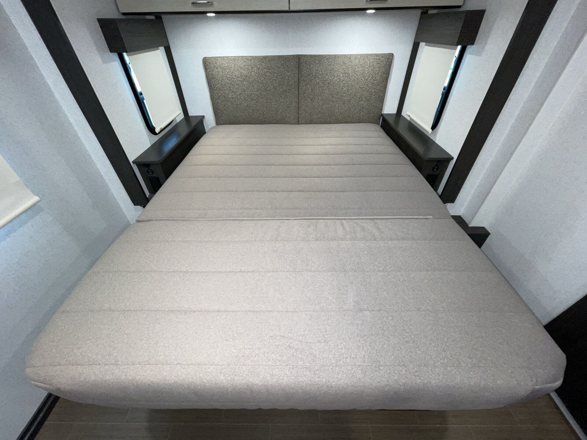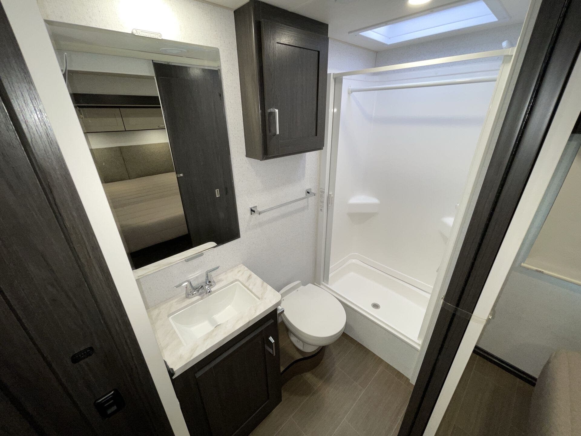 The mid-coach kitchen provides generous counter space and storage, making meal prep easy whether you’re on a quick trip or staying out longer. In the back, the private bedroom features a walk-around queen bed and a spacious bathroom, creating a comfortable place to unwind after a day on the road. With sleeping space for up to six and a length of about 28 feet, the Sunflyer 26FE offers a great balance of drivability, space, and everyday convenience for road trips or extended adventures.