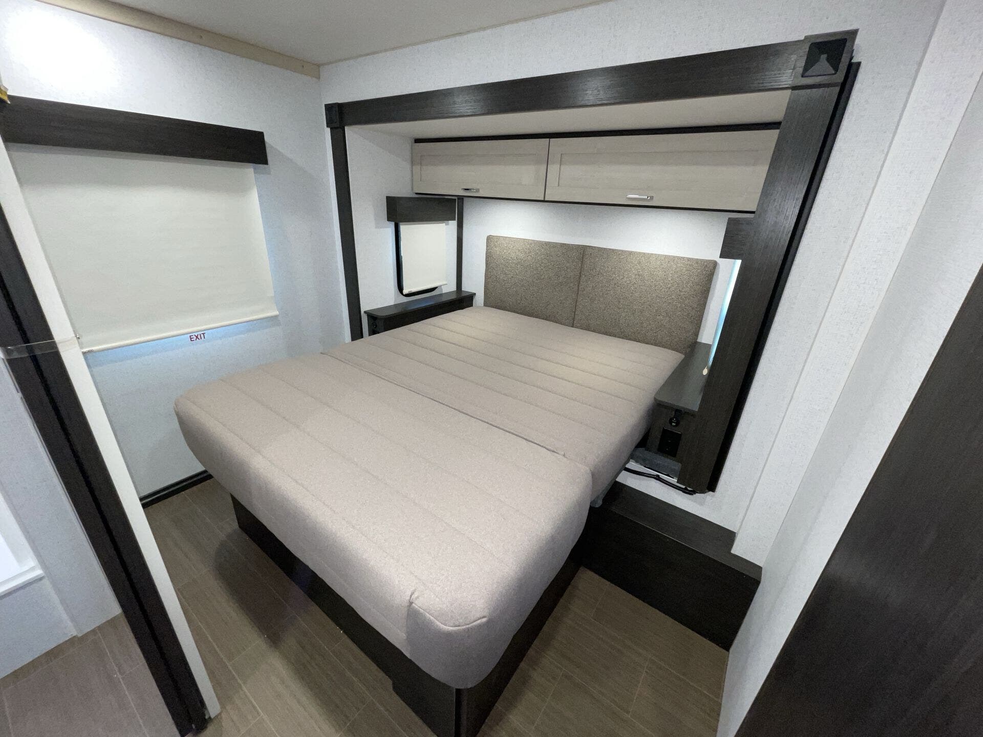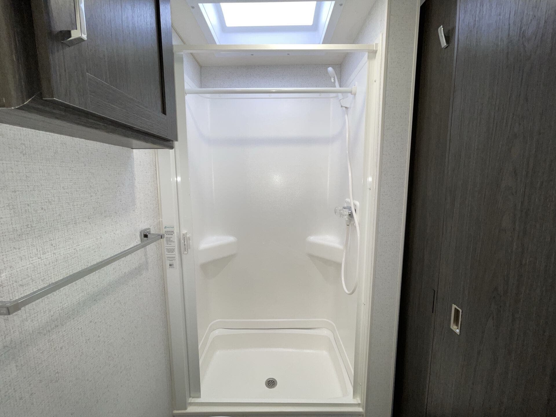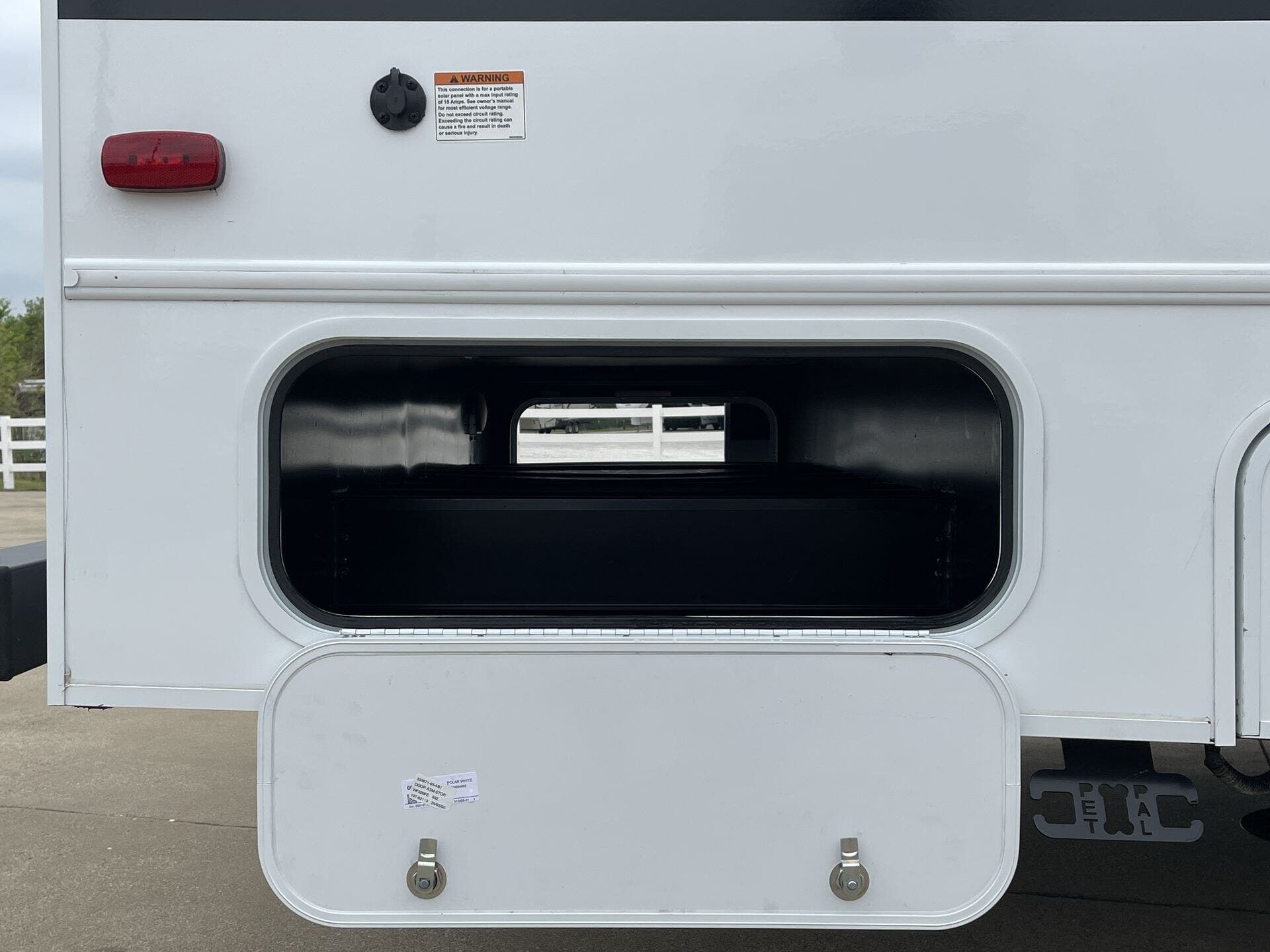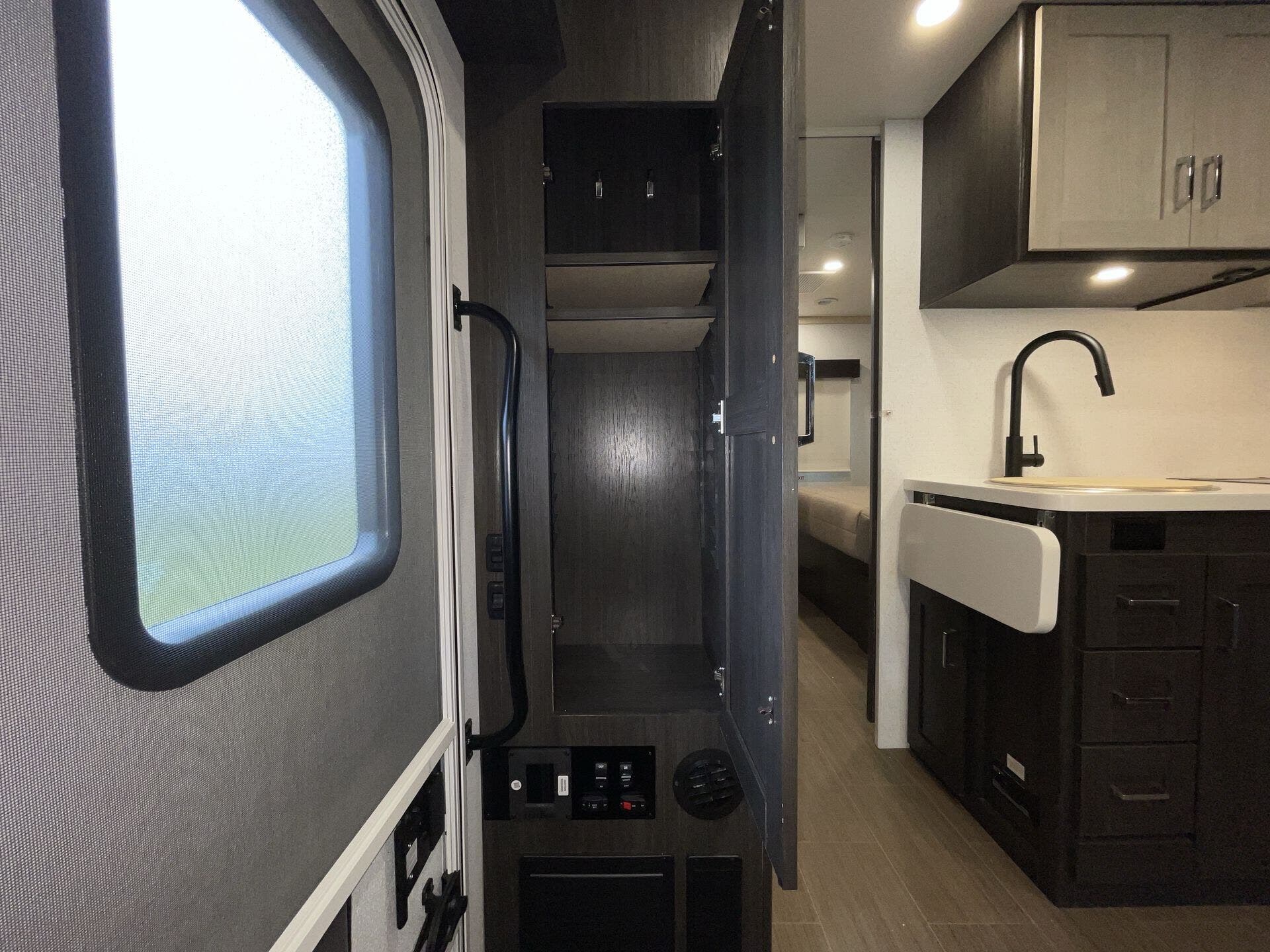 The mid-coach kitchen provides generous counter space and storage, making meal prep easy whether you’re on a quick trip or staying out longer. In the back, the private bedroom features a walk-around queen bed and a spacious bathroom, creating a comfortable place to unwind after a day on the road. With sleeping space for up to six and a length of about 28 feet, the Sunflyer 26FE offers a great balance of drivability, space, and everyday convenience for road trips or extended adventures.