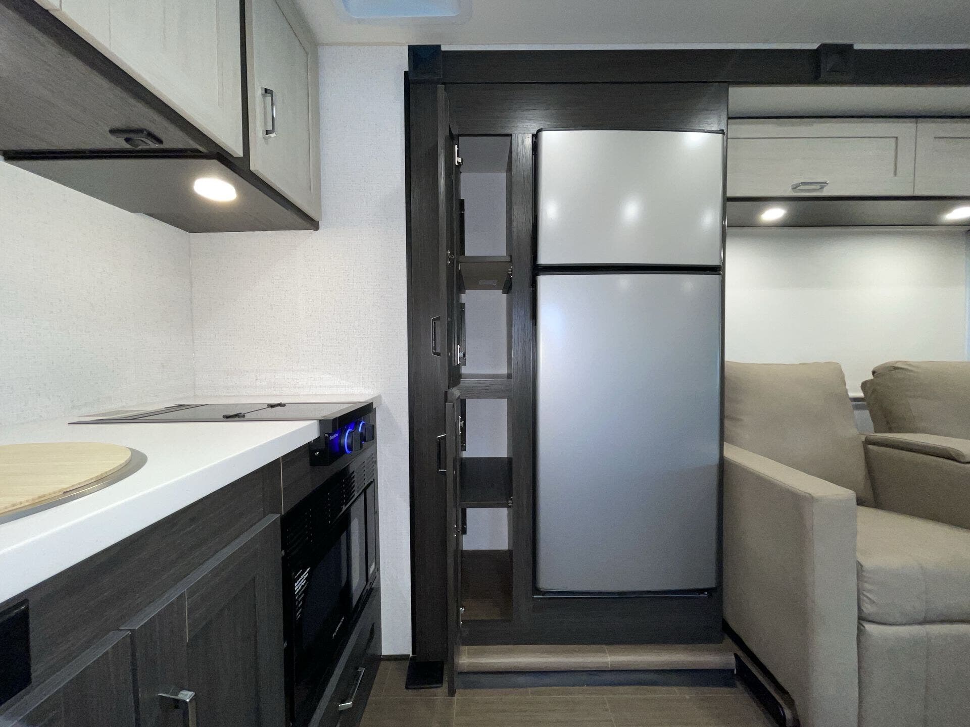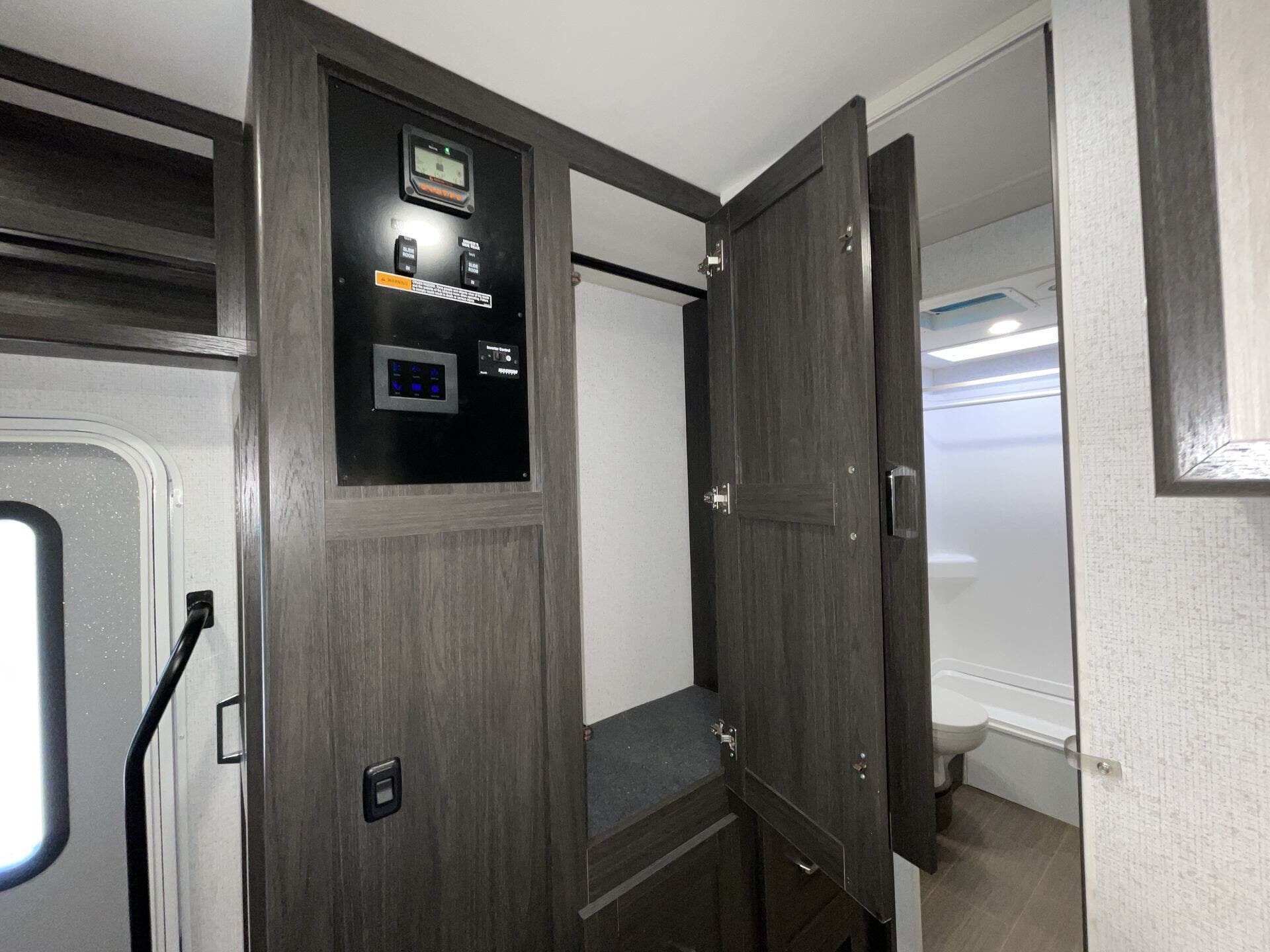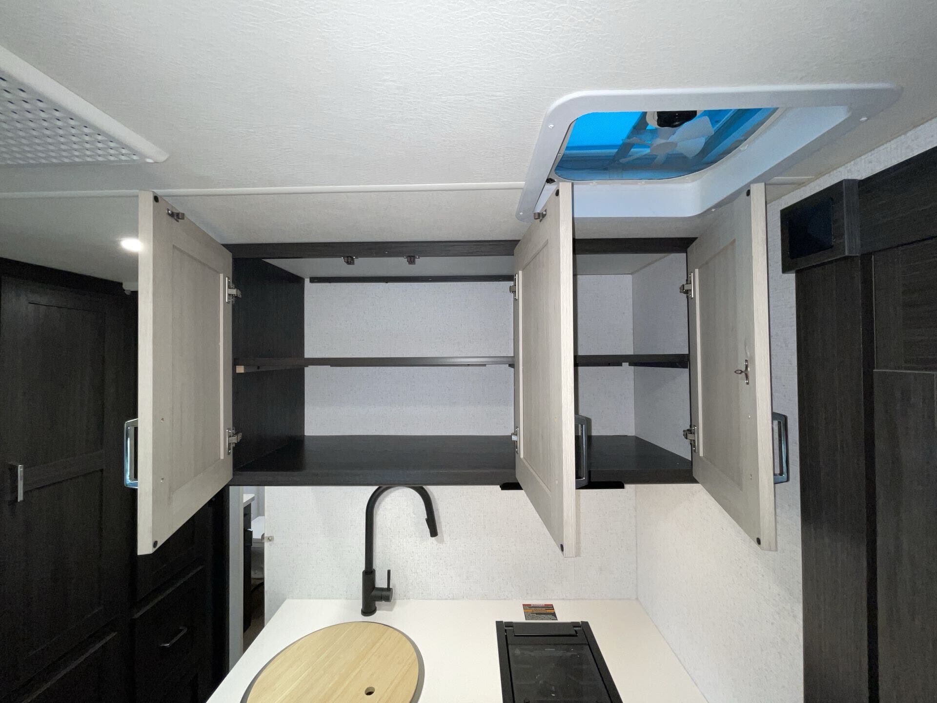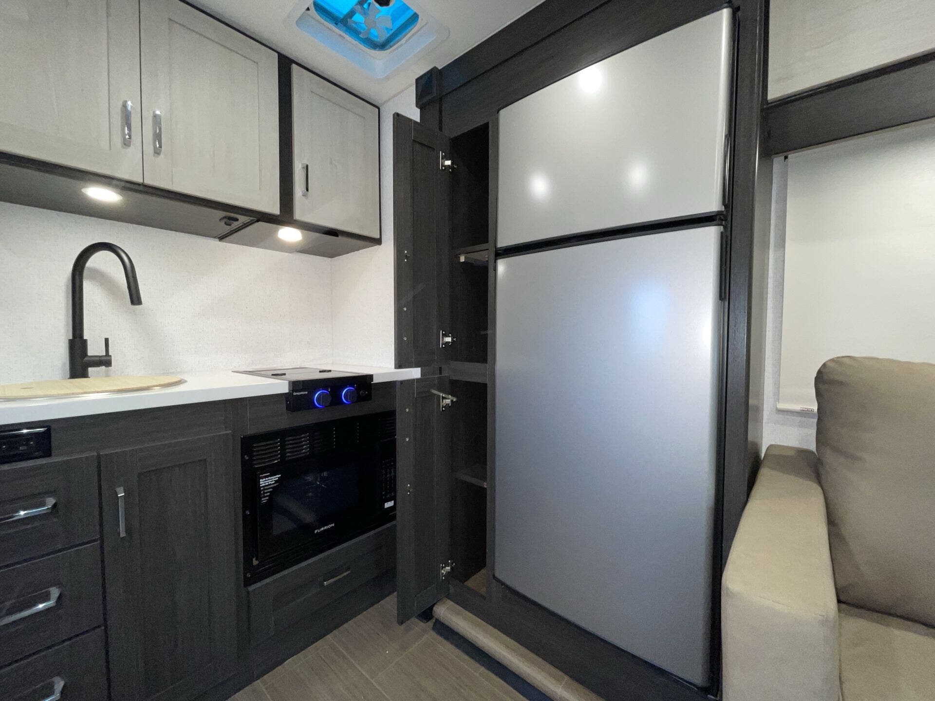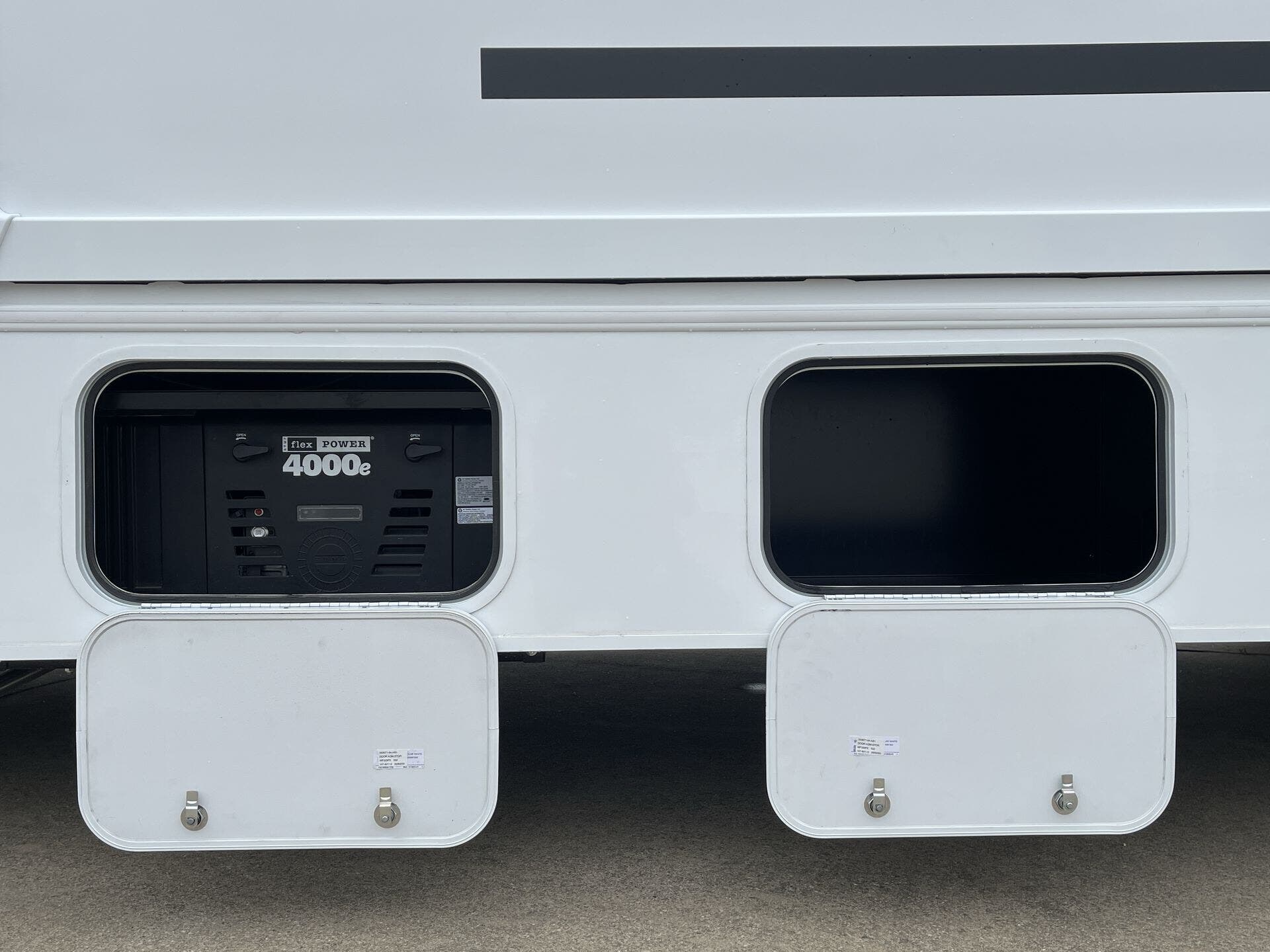 The mid-coach kitchen provides generous counter space and storage, making meal prep easy whether you’re on a quick trip or staying out longer. In the back, the private bedroom features a walk-around queen bed and a spacious bathroom, creating a comfortable place to unwind after a day on the road. With sleeping space for up to six and a length of about 28 feet, the Sunflyer 26FE offers a great balance of drivability, space, and everyday convenience for road trips or extended adventures.