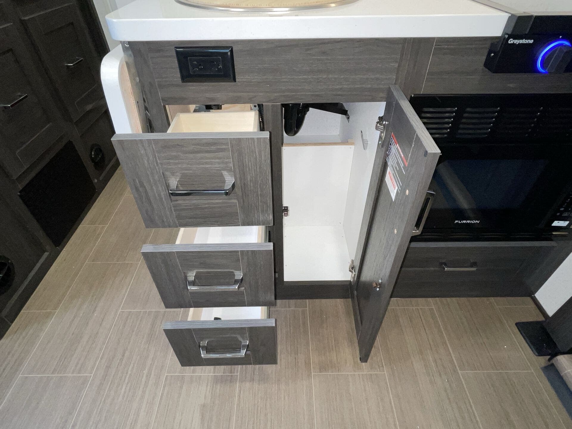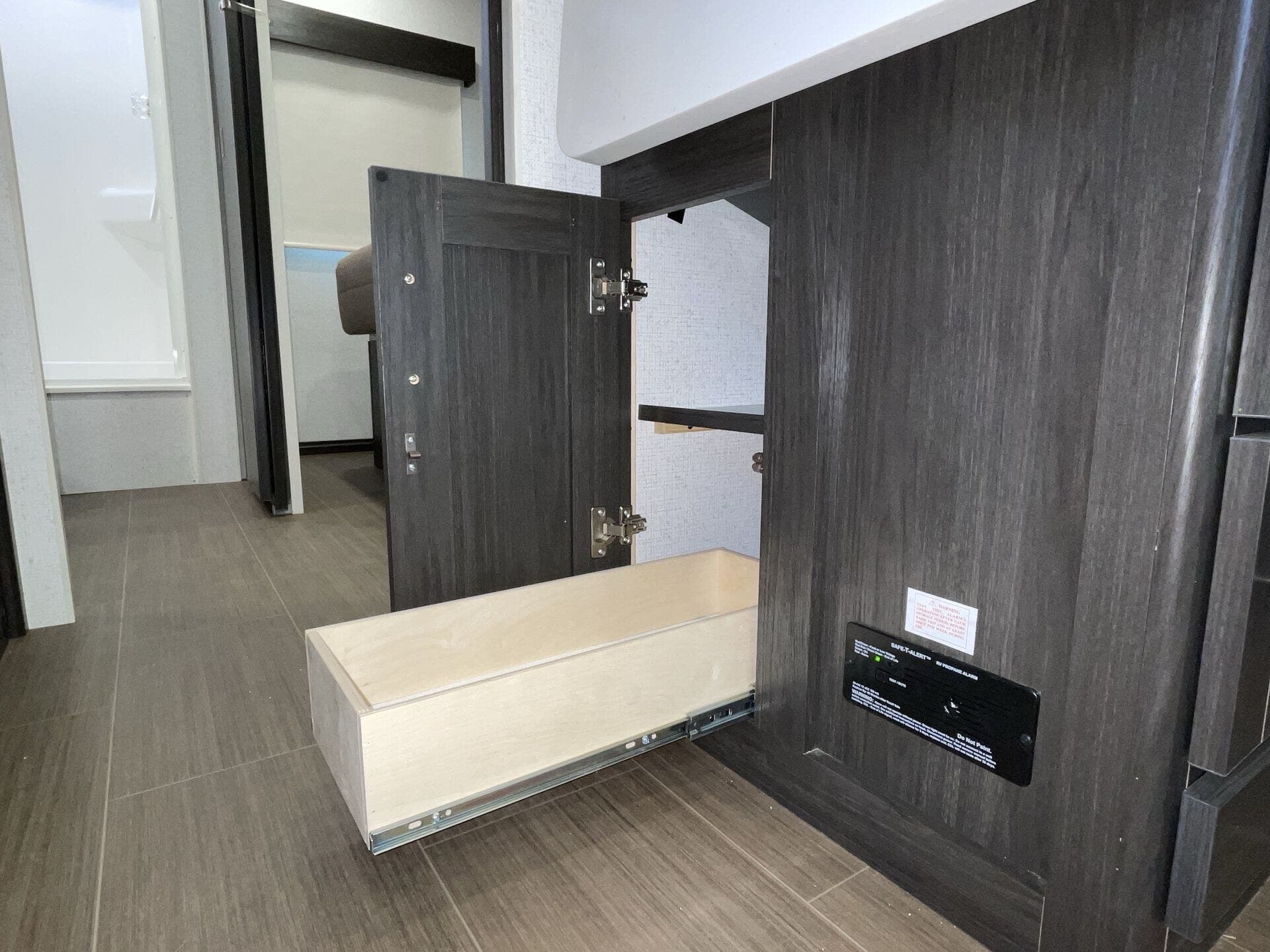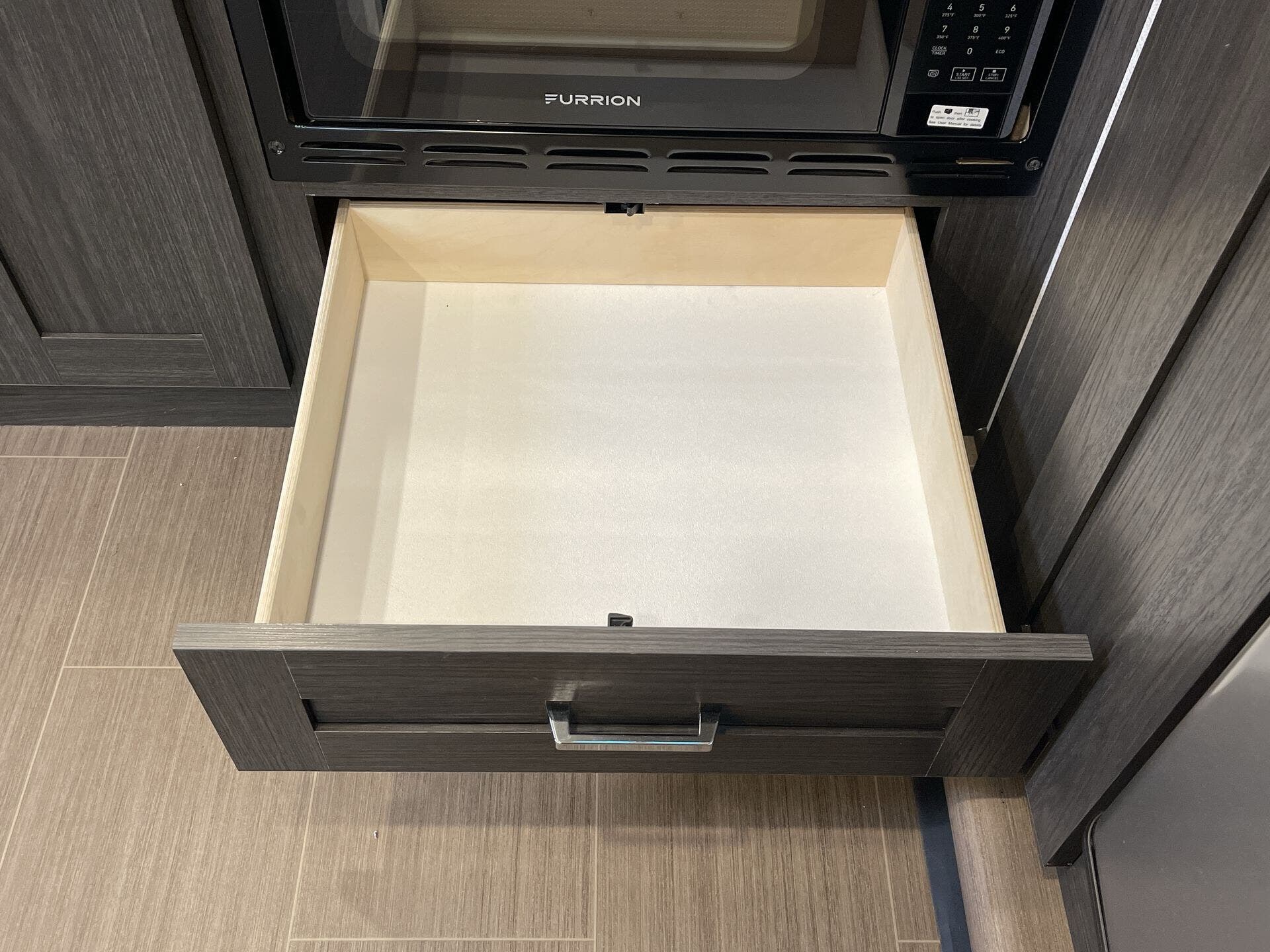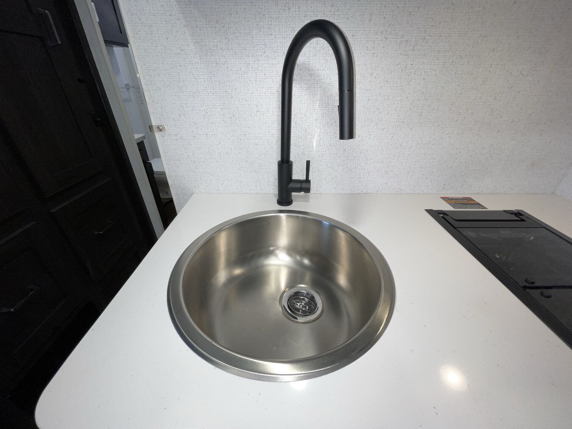The mid-coach kitchen provides generous counter space and storage, making meal prep easy whether you’re on a quick trip or staying out longer. In the back, the private bedroom features a walk-around queen bed and a spacious bathroom, creating a comfortable place to unwind after a day on the road. With sleeping space for up to six and a length of about 28 feet, the Sunflyer 26FE offers a great balance of drivability, space, and everyday convenience for road trips or extended adventures.