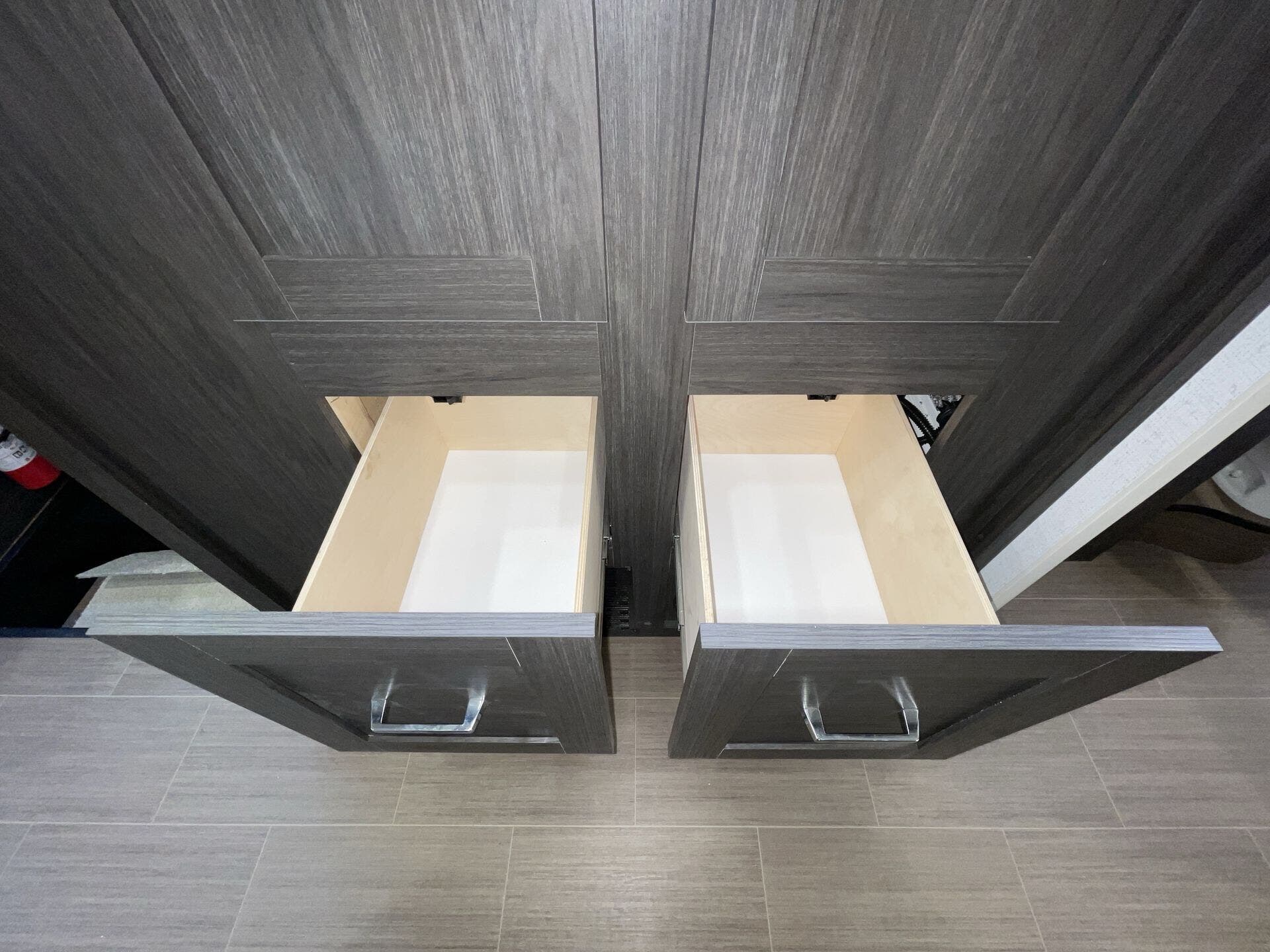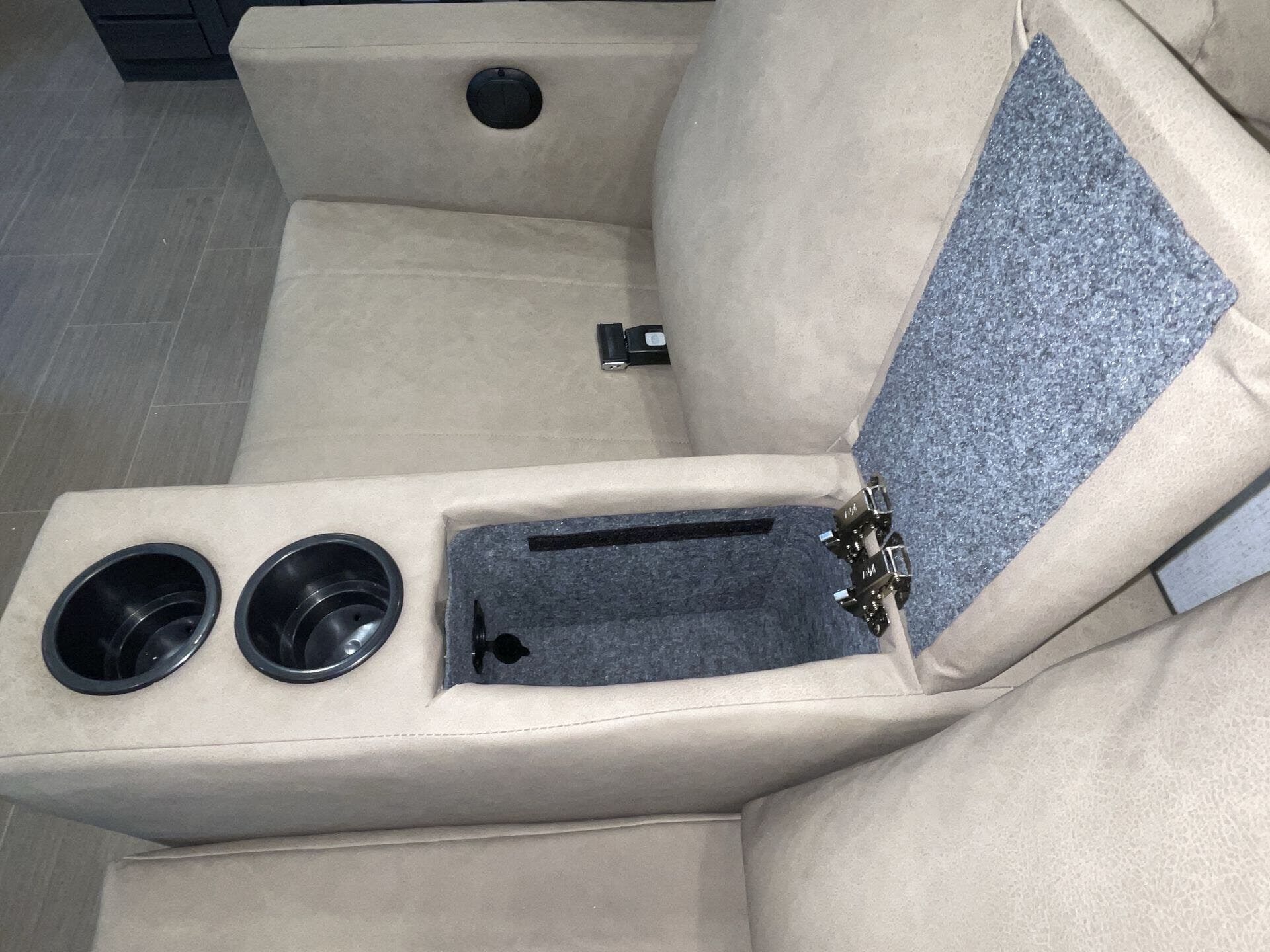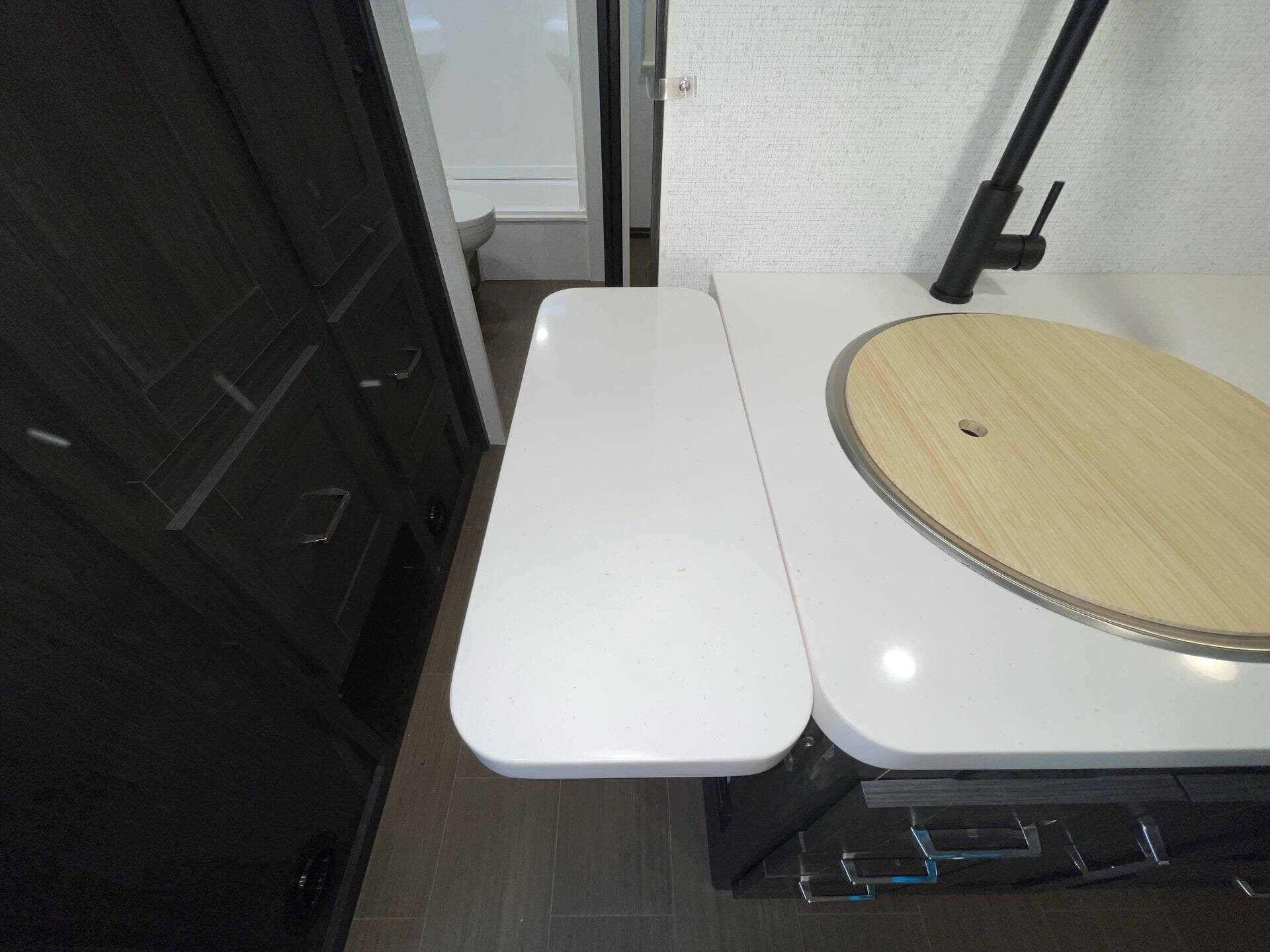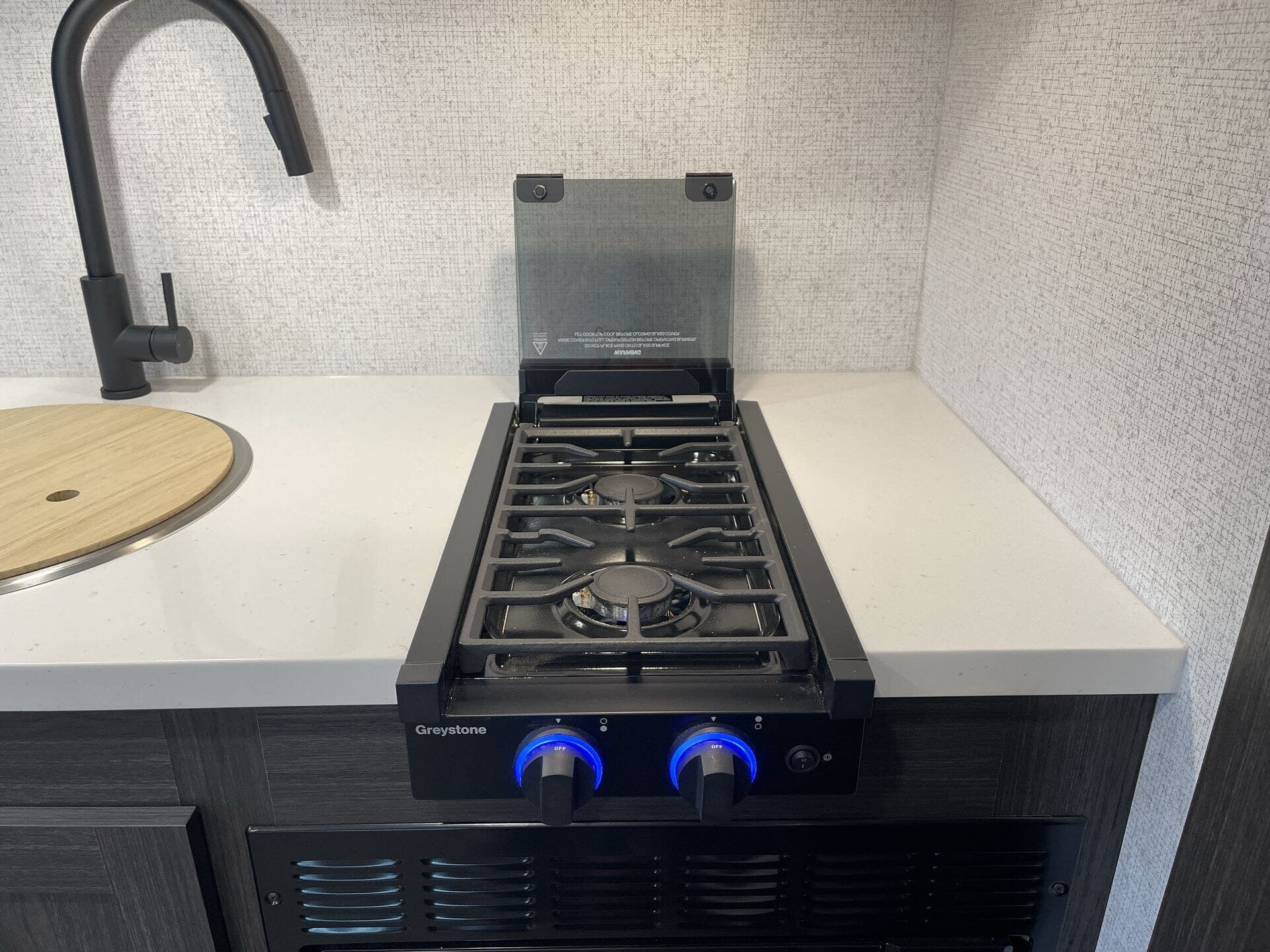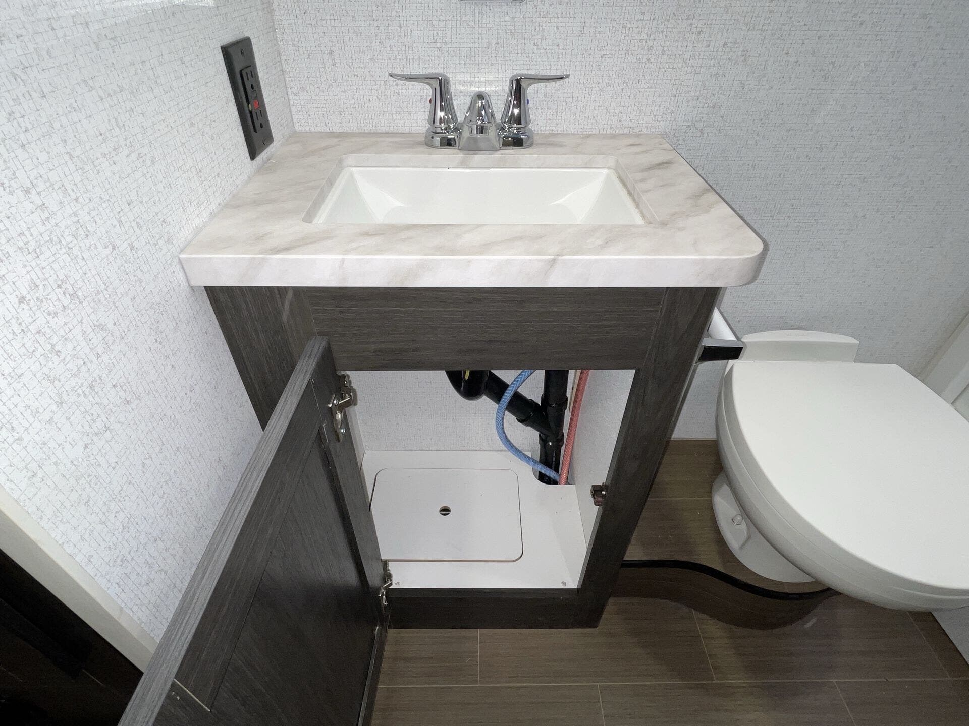 The mid-coach kitchen provides generous counter space and storage, making meal prep easy whether you’re on a quick trip or staying out longer. In the back, the private bedroom features a walk-around queen bed and a spacious bathroom, creating a comfortable place to unwind after a day on the road. With sleeping space for up to six and a length of about 28 feet, the Sunflyer 26FE offers a great balance of drivability, space, and everyday convenience for road trips or extended adventures.