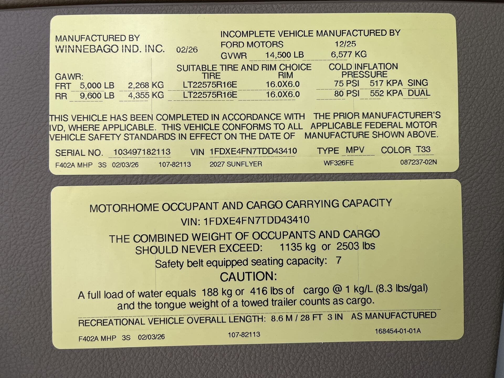 The 2027 Winnebago Sunflyer 26FE is a Class C motorhome designed to deliver a comfortable travel experience without feeling oversized. Built on the Ford E-450 chassis with a 350-hp 7.3L V8, it offers strong performance on the road while still being manageable to drive and park. Inside, the two slide-outs open up the living area and kitchen, giving you a roomy layout with a cabover bunk, dinette, and entertainment space that works well for relaxing or hosting family and friends.