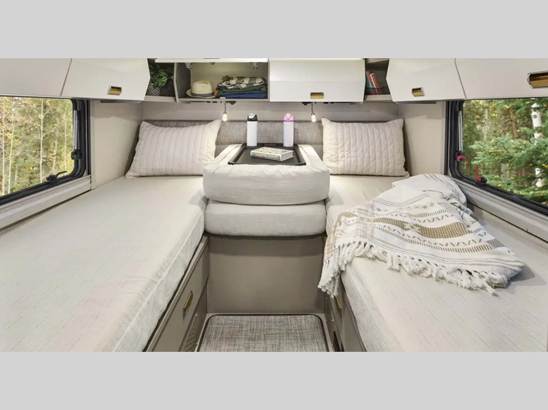 This is the perfect coach to travel with your honey or hiking buddy since there are two 32" x 76" twin beds in the back that can convert to a king-size bed if you choose! And the TrueComfort+ sofa with a movable pedestal table plus the cabover bunk will provide additional sleeping space. You can choose the optional low profile front cap with storage if you do not need the added sleeping space. There is a 25" x 30" shower across the hall from a private toilet and sink so two people can freshen up at once. You will also be able to create meals each day since there is a two-burner cooktop and convection microwave, and the 12V refrigerator will keep cold items fresh!