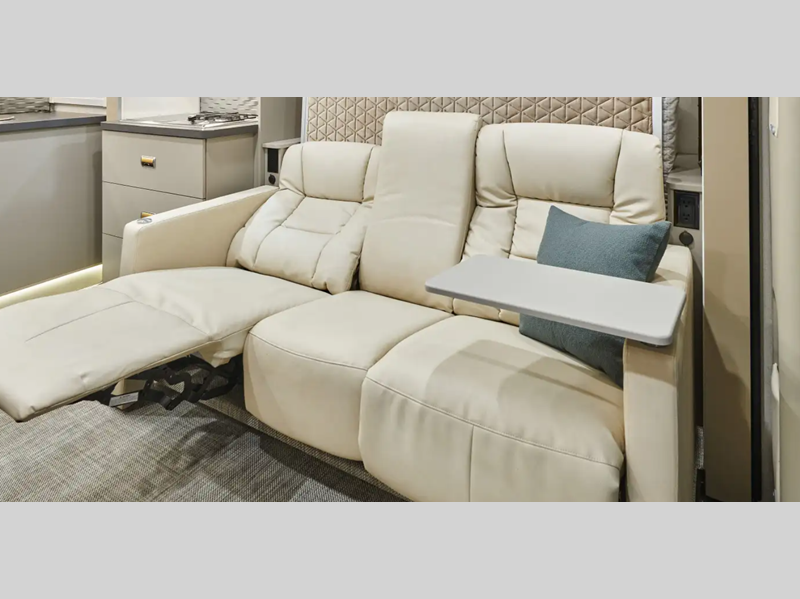 The perfect couples coach or for a family of three or four! This versatile Murphy bed unit will offer you sleeping space when you need it, then a comfortable living area during the day with plenty of seating all while keeping your same coach length. You will be able to easily set up the queen Murphy+ bed when it's time for bedtime while the kids or your guests sleep on the 49" x 75" cabover bunk. You can also choose the optional low profile front cap with storage if you do not need the added sleeping space. Everyone can get cleaned up in the full bathroom that has a space-saving sliding door and large bath wardrobe along the very rear that features a gear garage below. Create yummy meals and snacks using the kitchen appliances and the flip-up counter, then dine at the fold-down table with chairs or eat seated on the theater seating with lap tables nearby on either side.