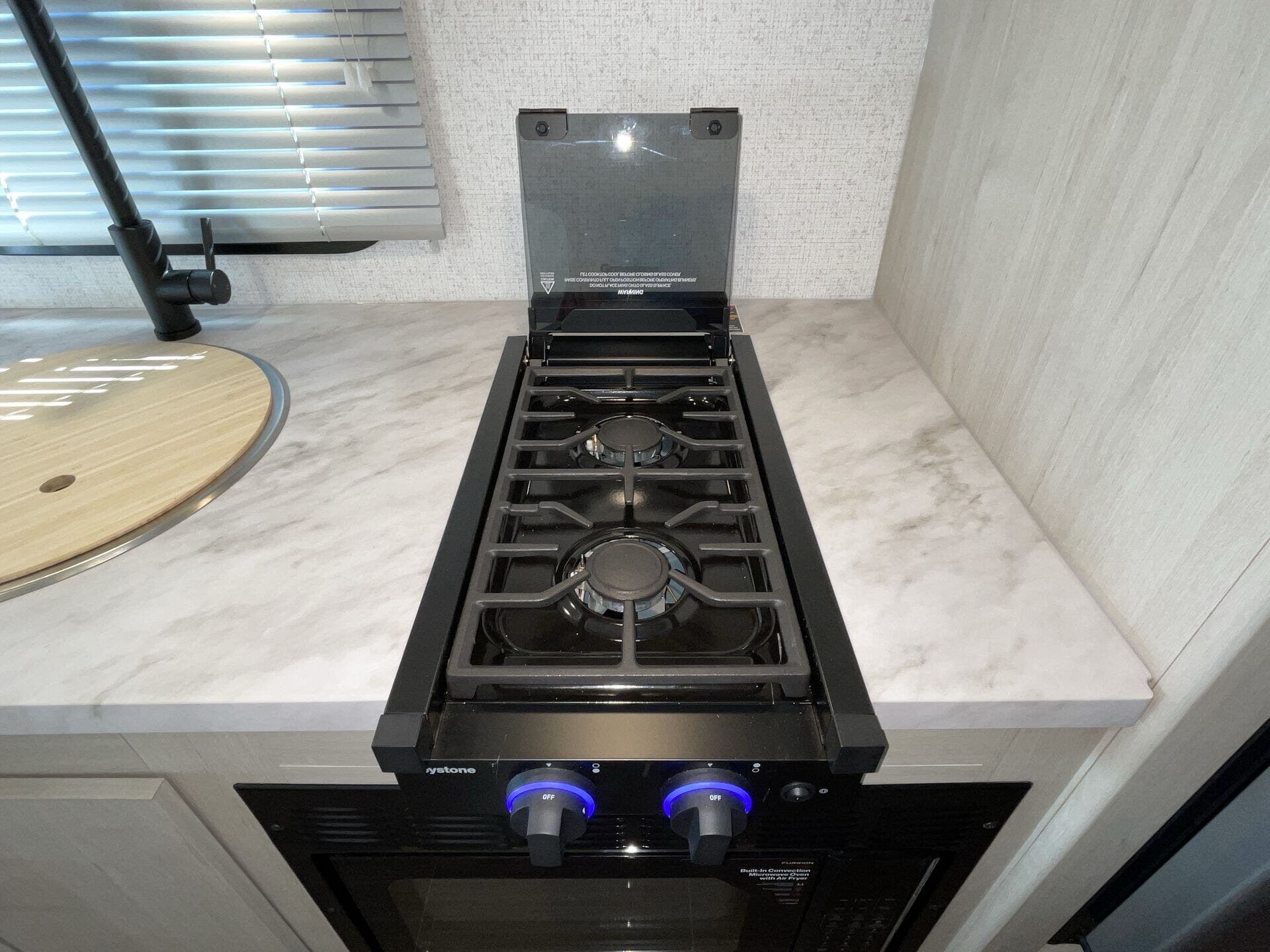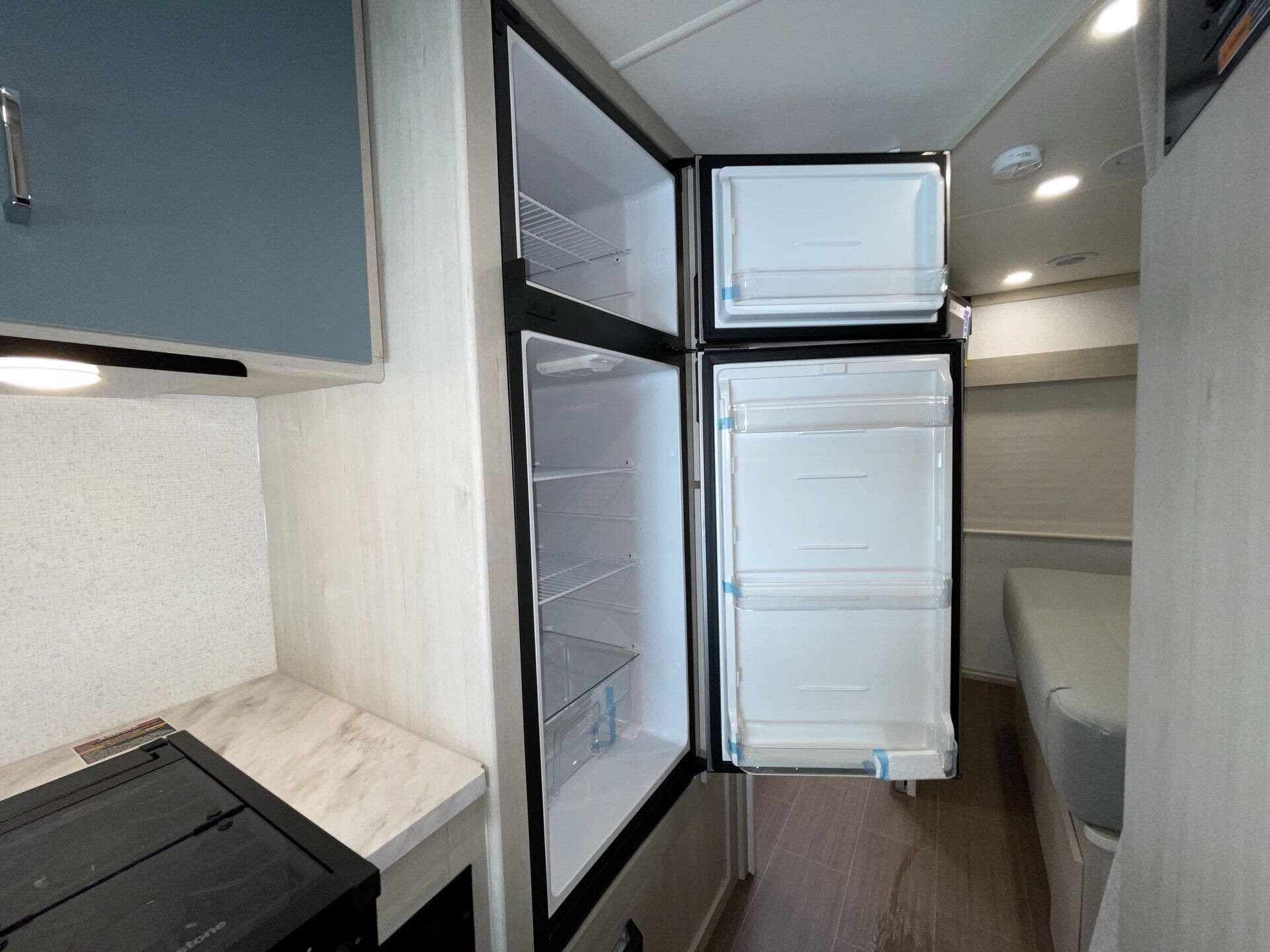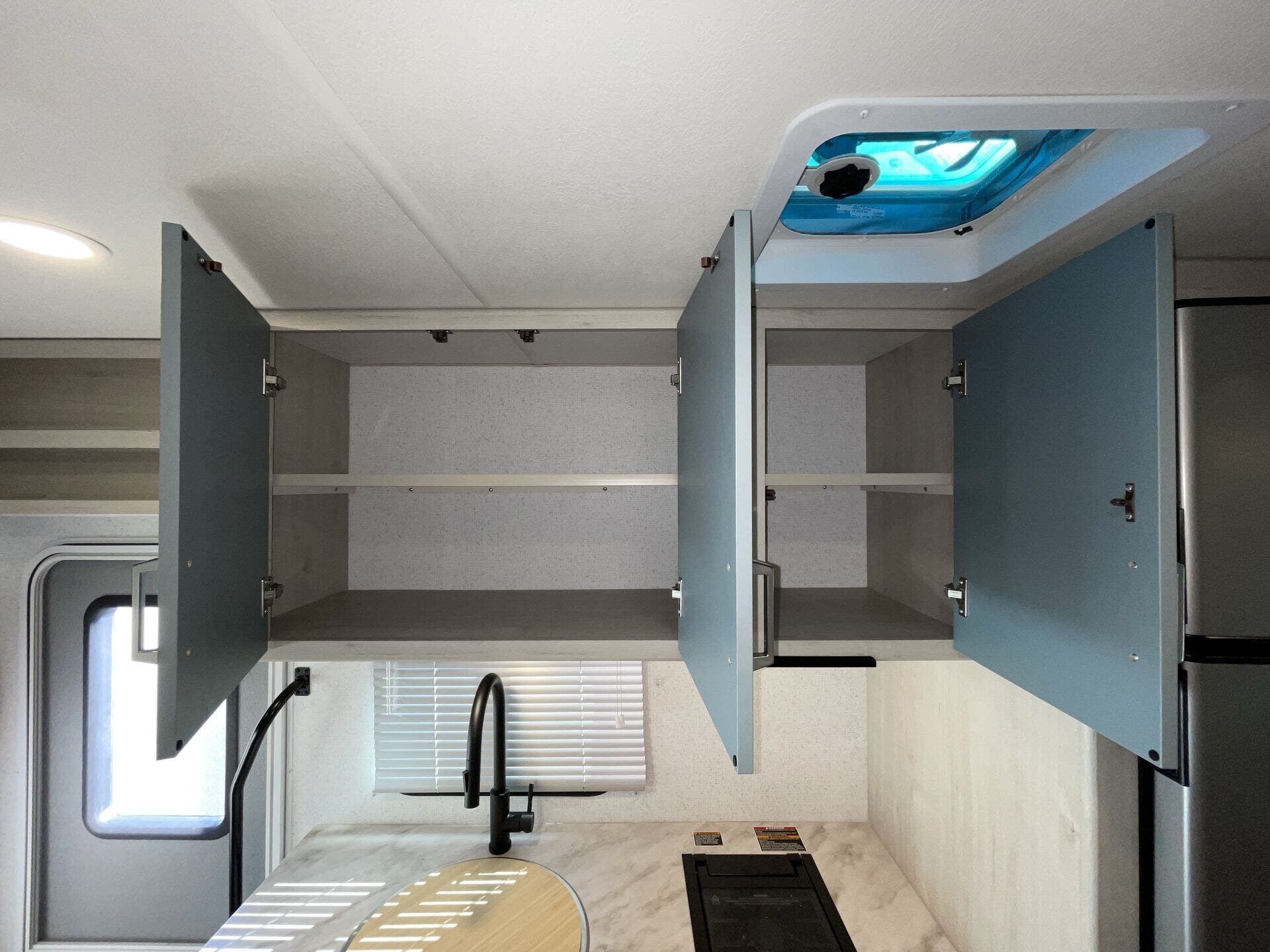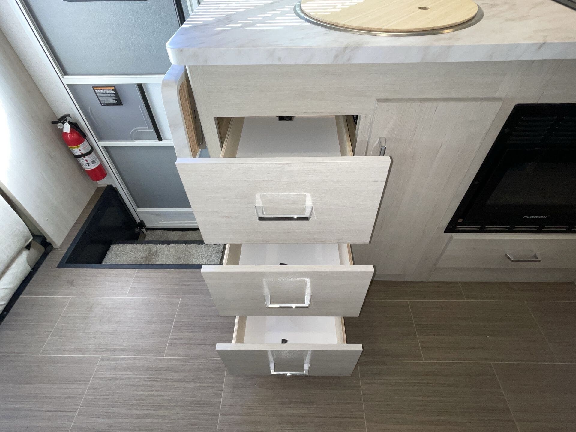 You’ve got a cab-over bunk plus a rear sleeping area, so whether it’s family, friends, or a mix of adults and kids, everyone has a real place to sleep without feeling like they’re in a corner. The kitchen is practical — good counter space, solid storage, and appliances that let you cook real meals on the road.