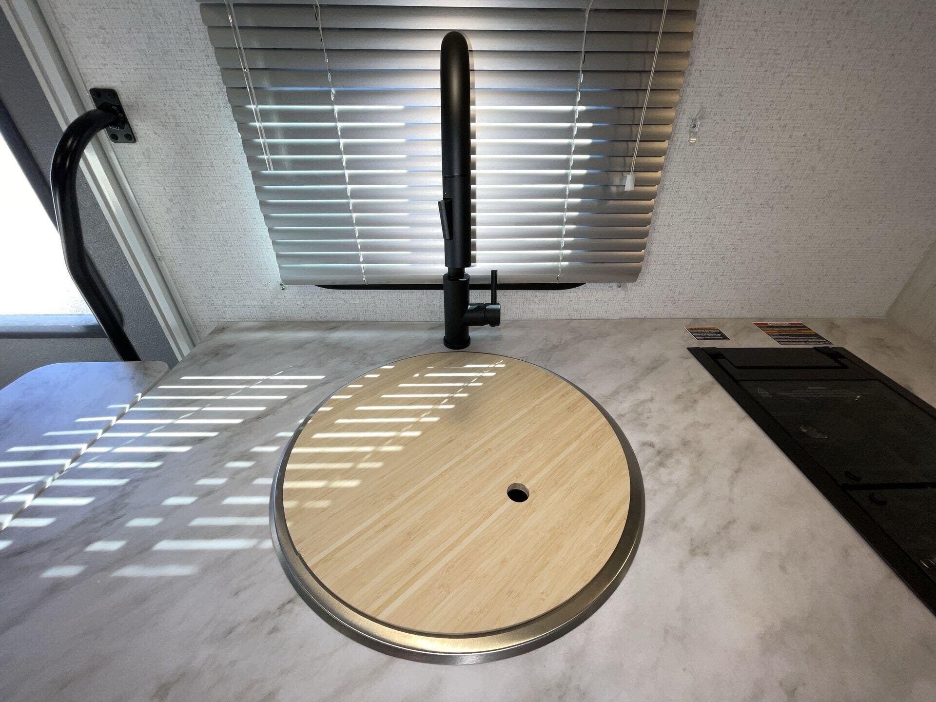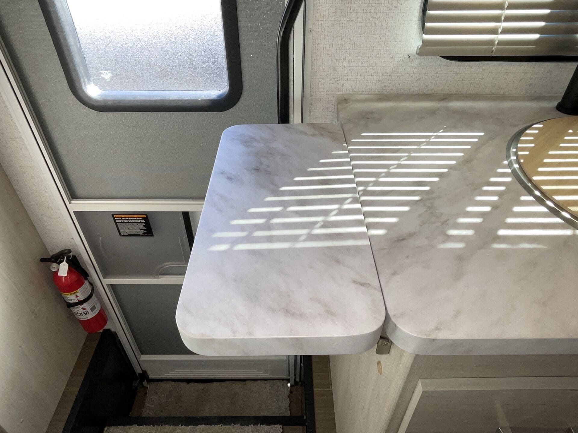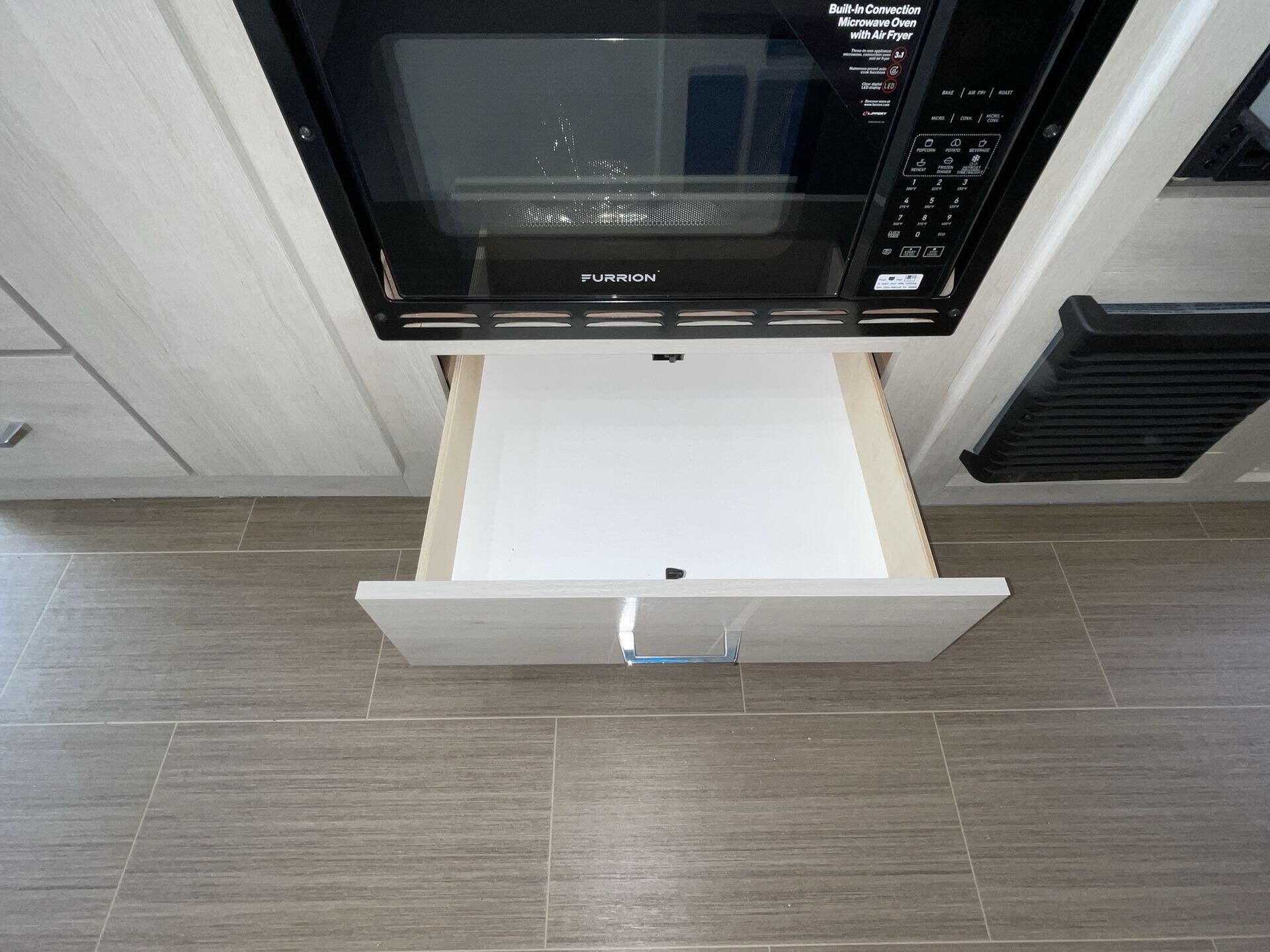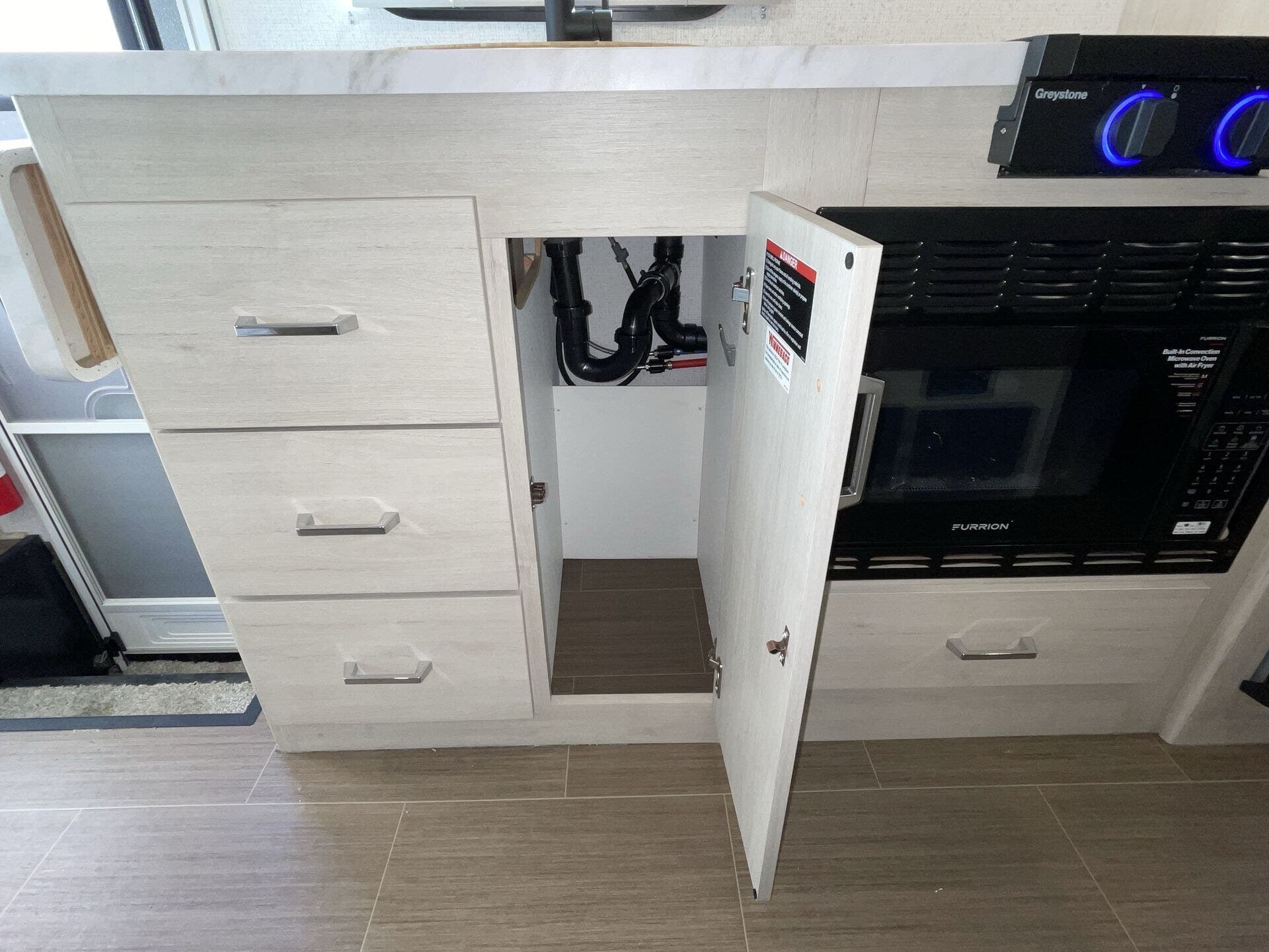 You’ve got a cab-over bunk plus a rear sleeping area, so whether it’s family, friends, or a mix of adults and kids, everyone has a real place to sleep without feeling like they’re in a corner. The kitchen is practical — good counter space, solid storage, and appliances that let you cook real meals on the road.