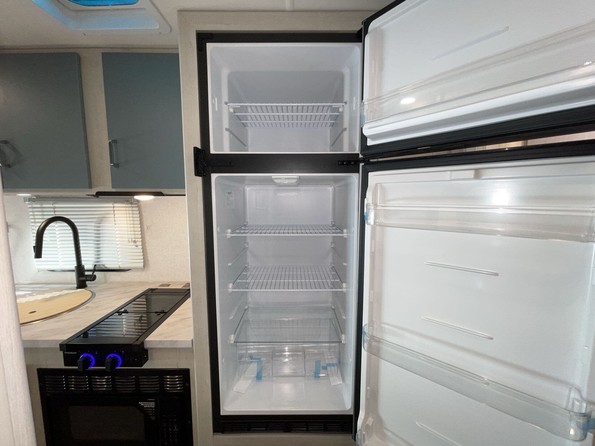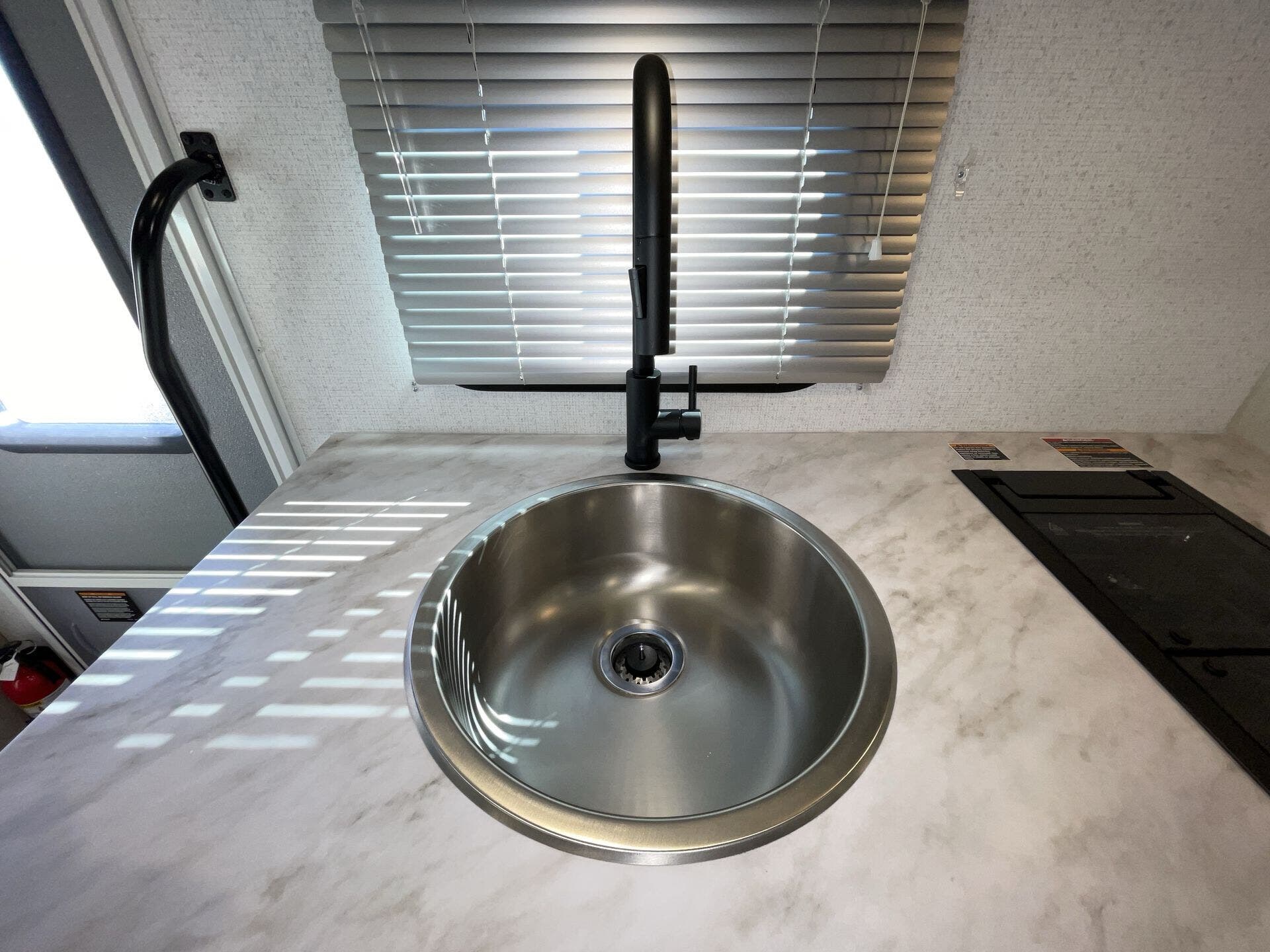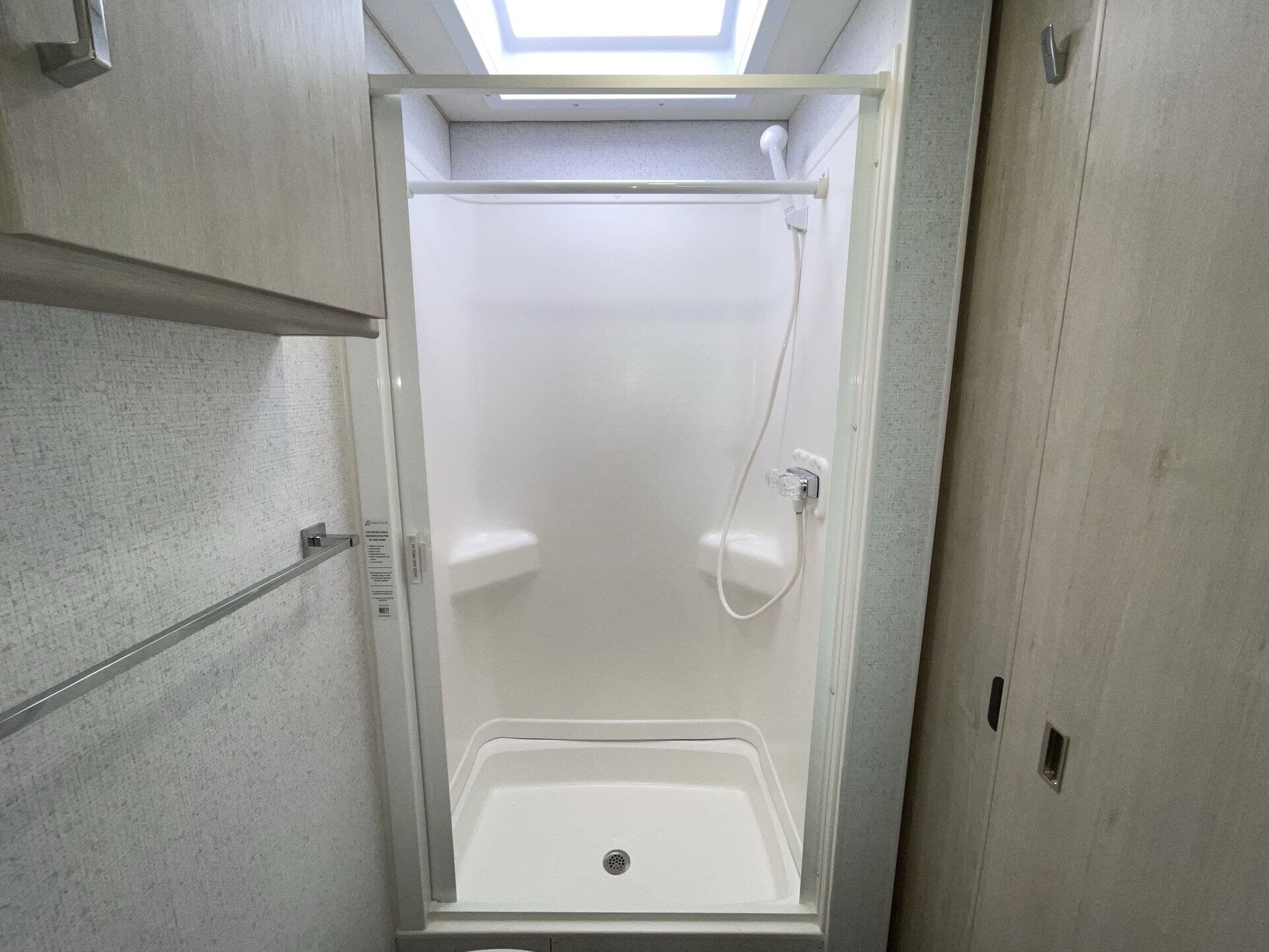 The bathroom has a proper shower (not just a wet corner) and enough room that you don’t feel cramped using it, which makes a big difference on longer trips. Tank capacities are sized so you can spend a few nights out without constantly worrying about hookups.