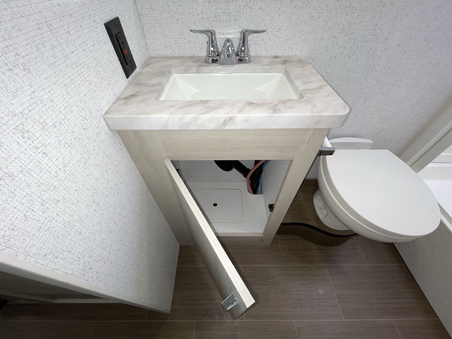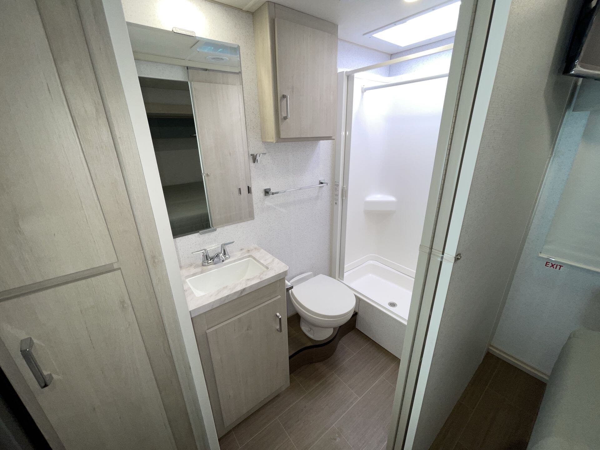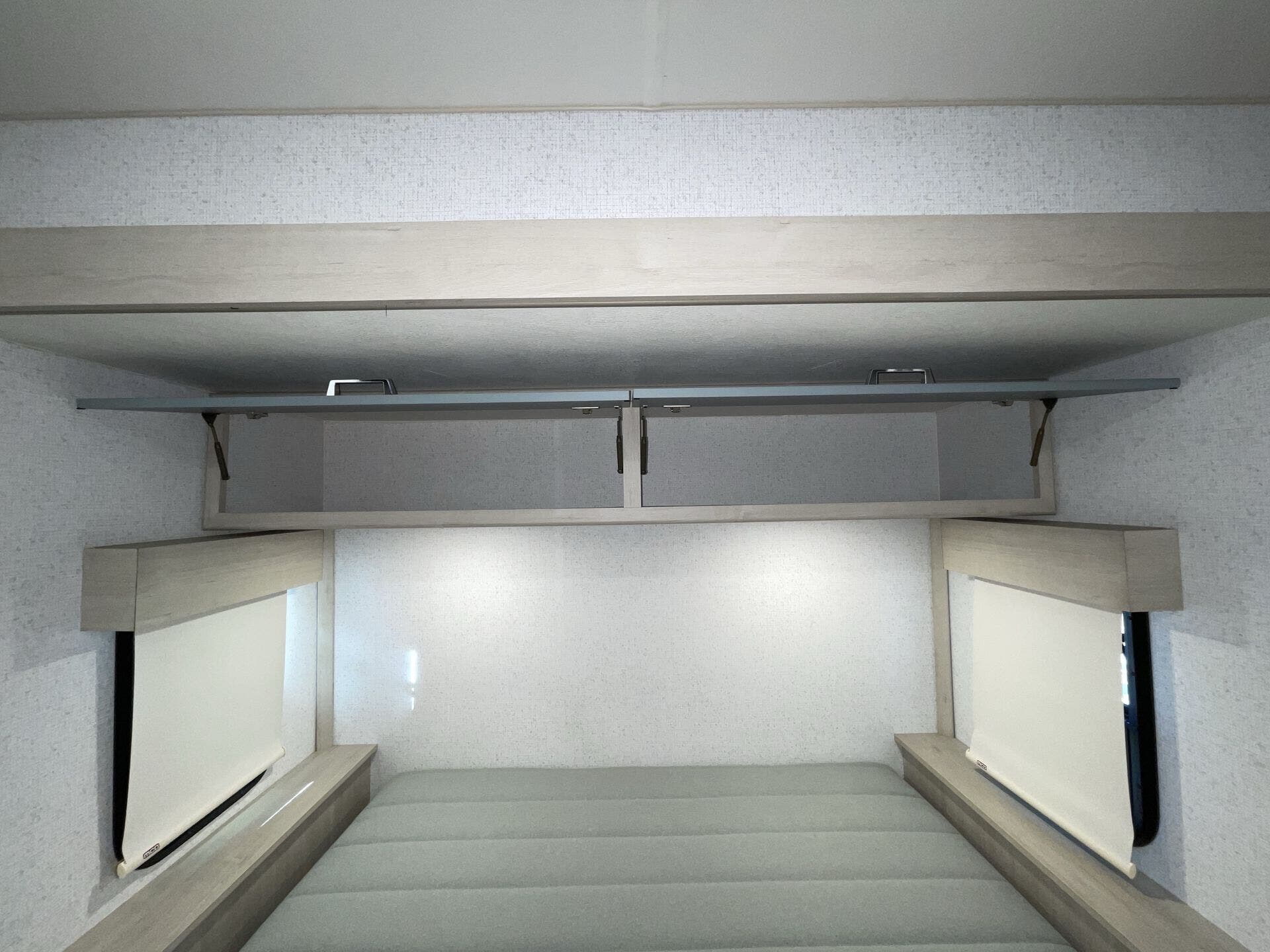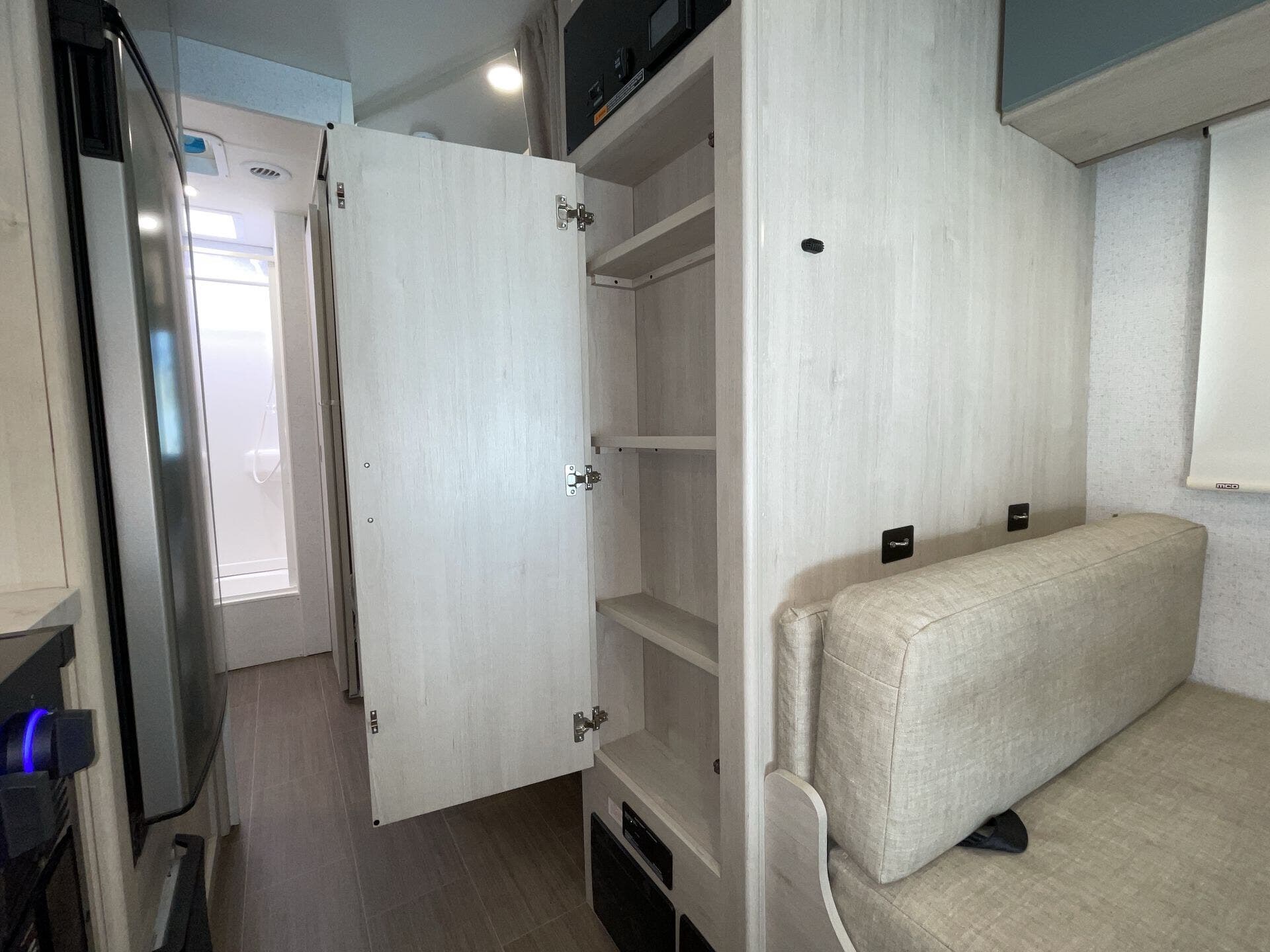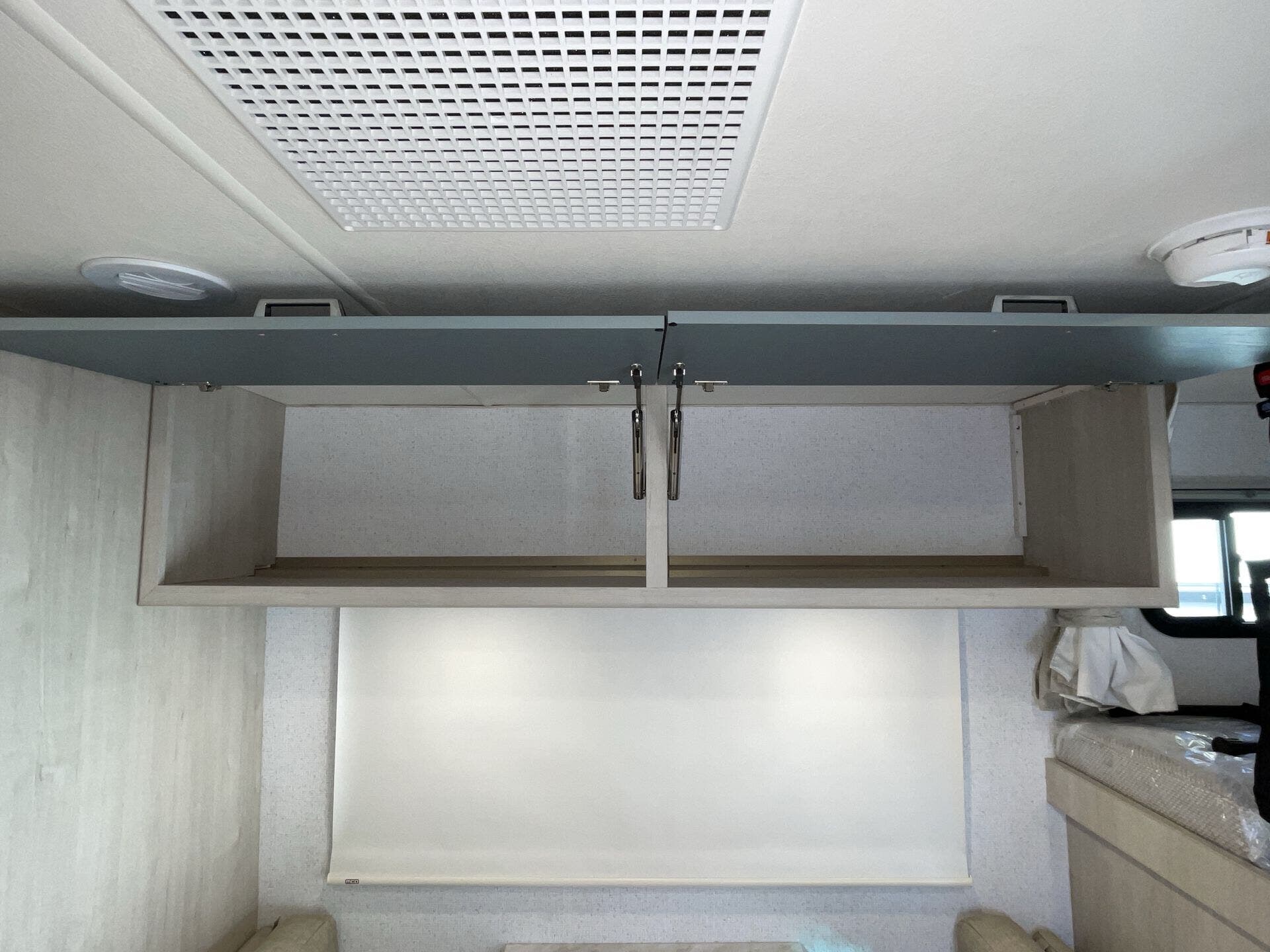Booth Dinette, Day/Night Shades, Dinette, Dinette Bed, Kitchen Sink, Medicine Cabinet, Overhead Cabinetry, Pantry, Queen Bed, Roof Vents, Shower, Solid Surface Countertops, Toilet, Wardrobe(s)