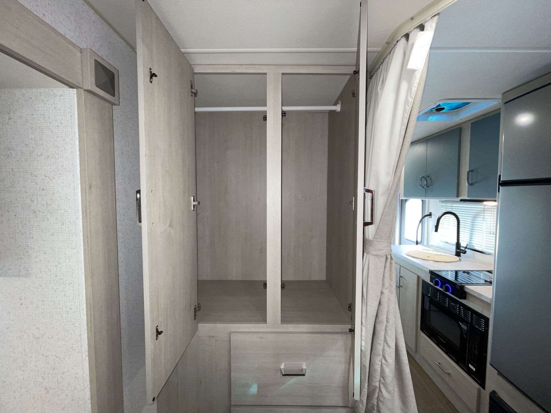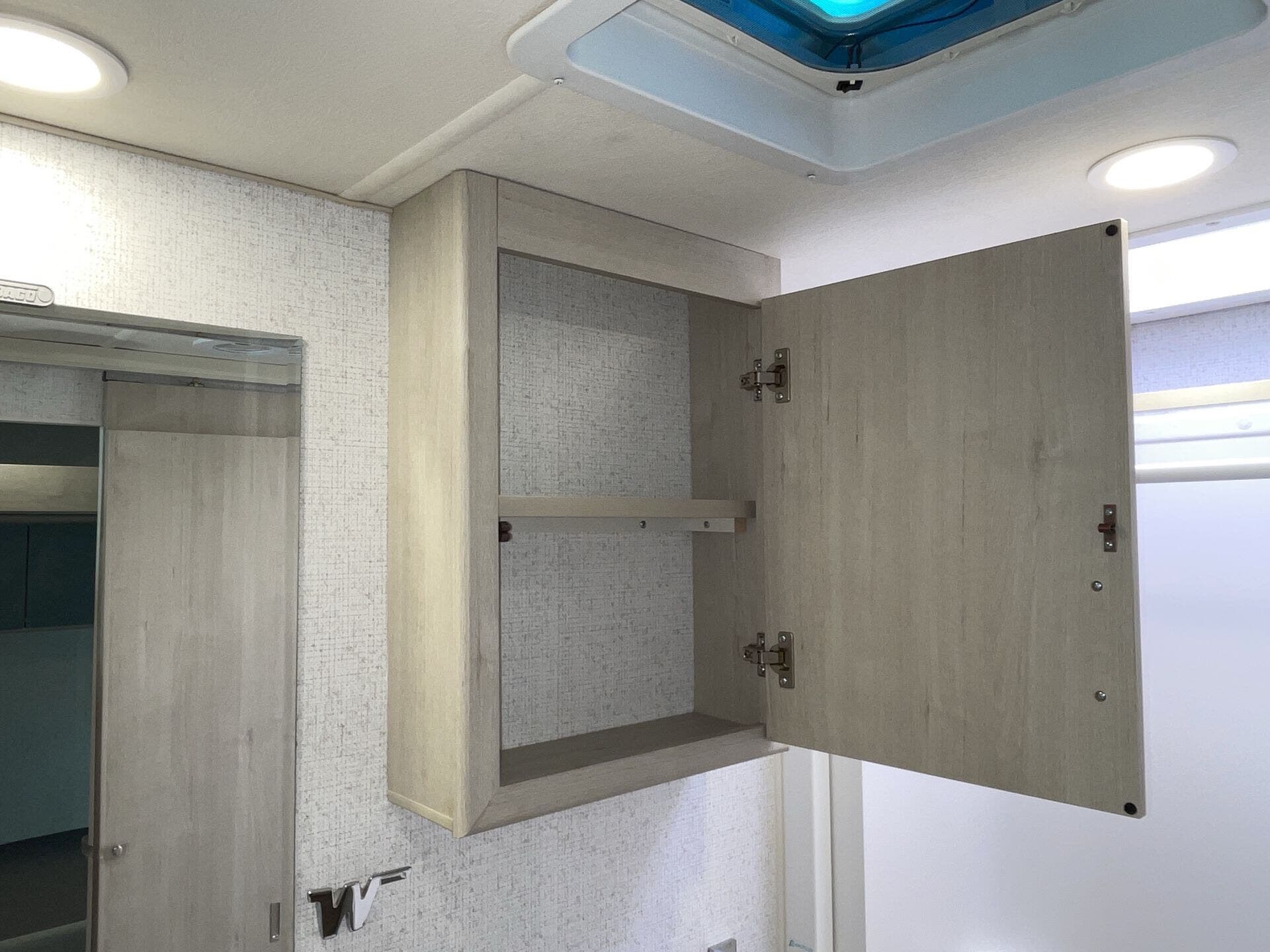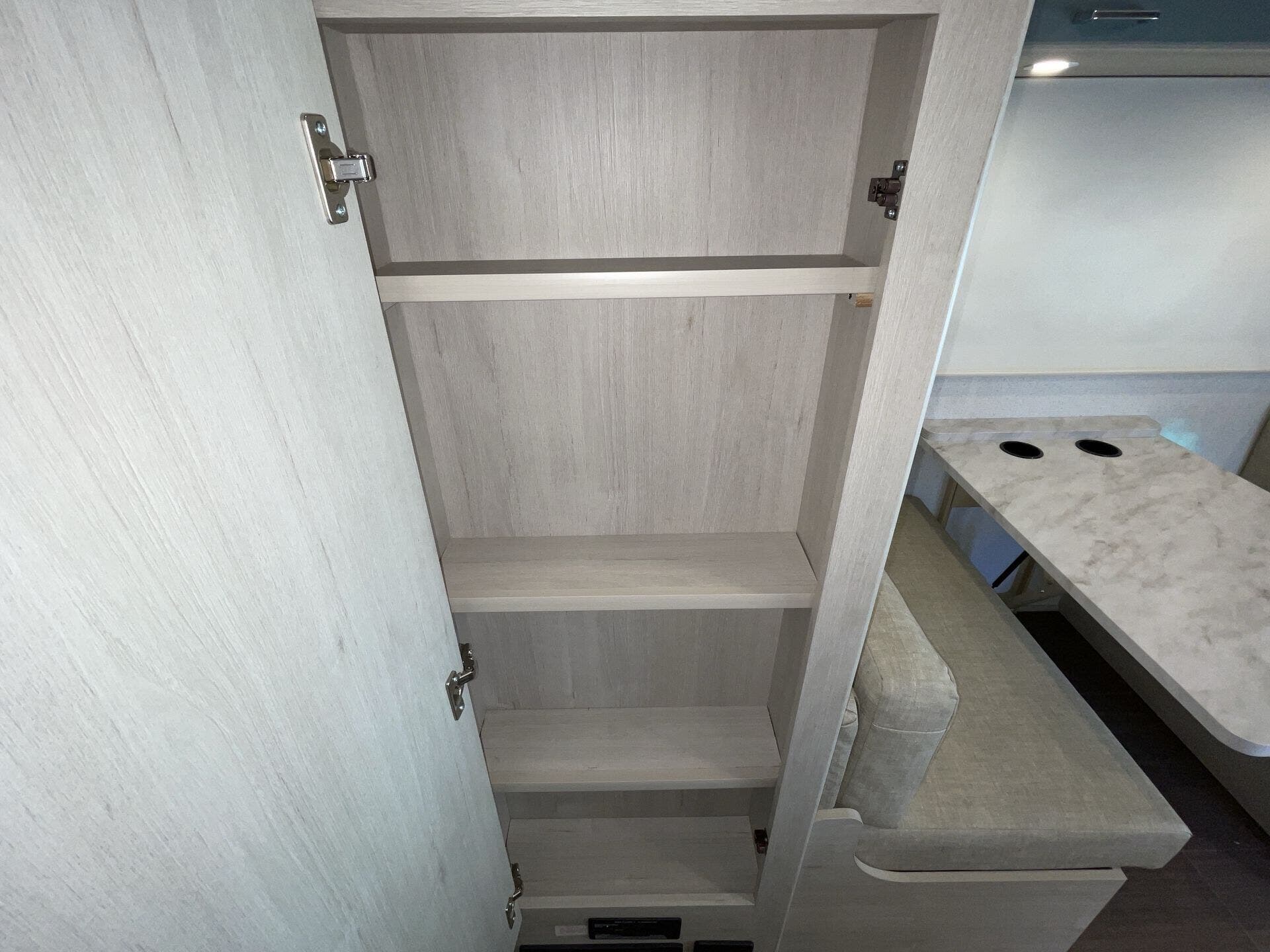 Outside, the power awning with LED lighting makes the camping setup instantly usable — shade during the day, lit outdoor space at night. And storage throughout feels thoughtful — not just “there’s a cabinet,” but actually useful cabinets and closets that make sense.