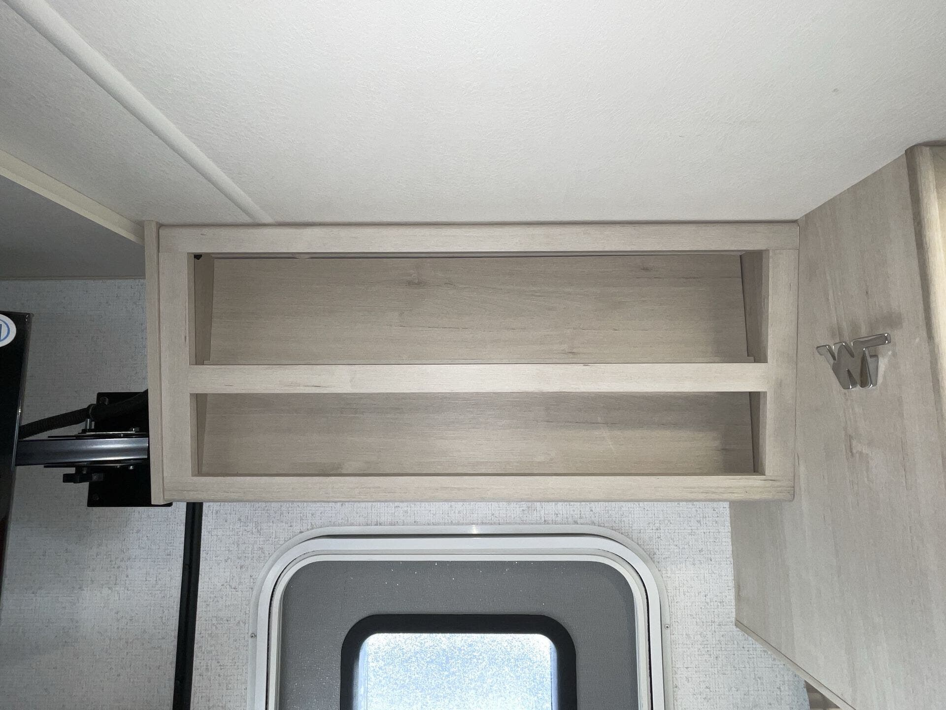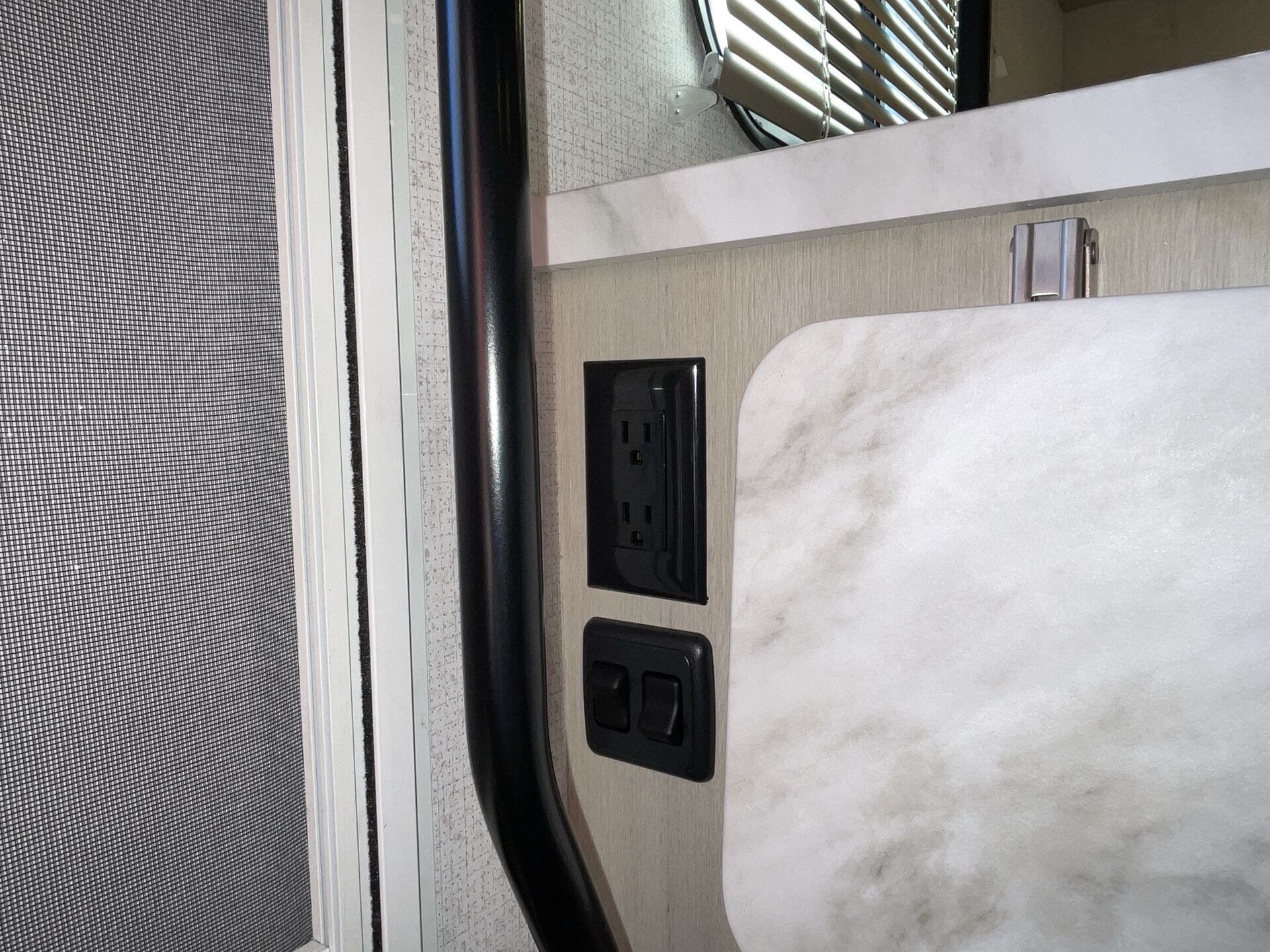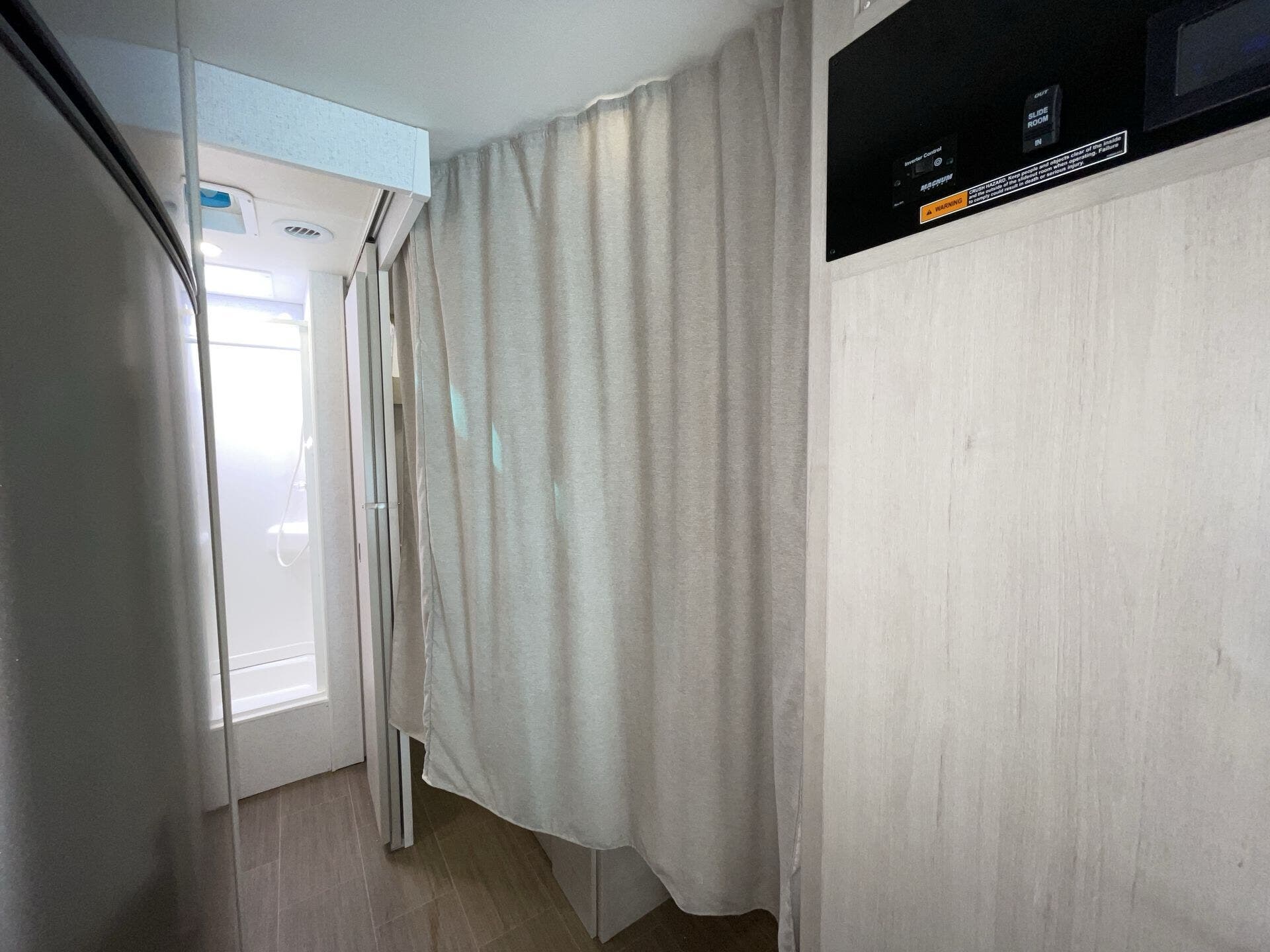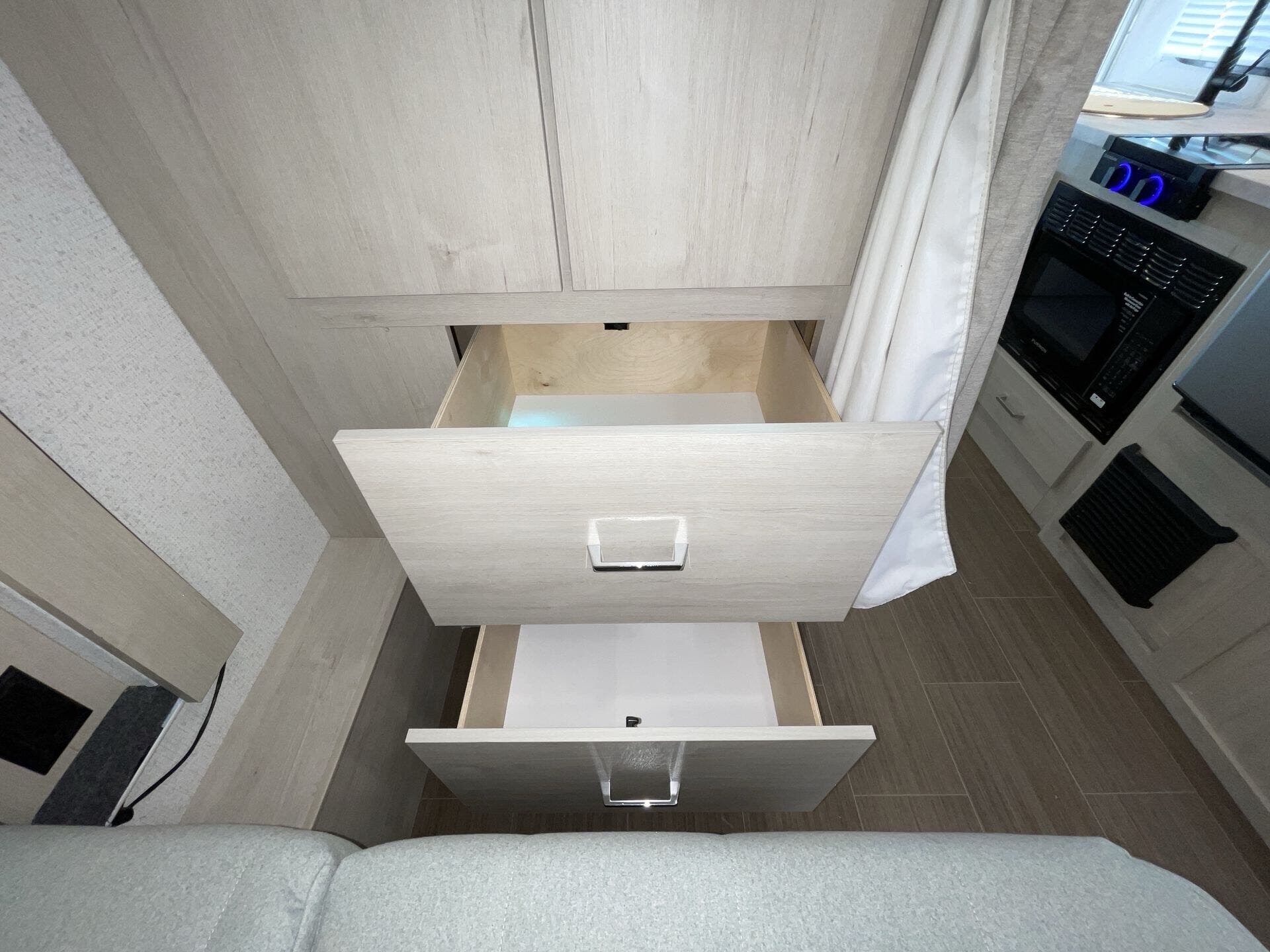 Outside, the power awning with LED lighting makes the camping setup instantly usable — shade during the day, lit outdoor space at night. And storage throughout feels thoughtful — not just “there’s a cabinet,” but actually useful cabinets and closets that make sense.