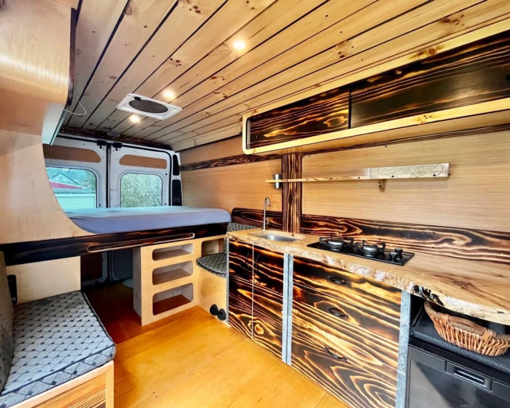 Experience the real Kaua?i — from sunrise beach mornings to starlit jungle nights — in this beautifully crafted, off-grid camper van. Built inside a 2017 Ram ProMaster 2500 high-roof van, this stealth camper is a fully self-contained island home on wheels, designed for comfort, style, and total freedom. The interior is nothing short of art: handcrafted with custom woodwork, including a live-edge countertop and shou sugi ban–style cabinetry. Natural wood tones and clean design bring the warmth of a boutique cabin into the heart of nature. Key Features: Off-grid power: • 500W solar panel • 360Ah battery bank • 2000W inverter • Victron MPPT charge controller • Charges via solar or while driving • AC and DC power outlets throughout Sleeping: • RV Full bed (48” x 74”) — comfortably sleeps one or two • Wake up with ocean views or jungle breezes Kitchenette: • Live-edge wood countertop • Two-burner propane stove • Stainless steel sink w/ 7.5-gal freshwater tank • 7.5-gal greywater system • Mini fridge • Cookware, dishes, and utensils included Climate and comfort: • Roof vent fan • Insulated walls and ceiling • Blackout curtains • Cold A/C while driving Storage: • Ample built-in cabinetry • Rear garage space for surfboards, gear, or luggage Other amenities: • pullout wooden dining table for indoor meals or laptop time • Backup camera • LED lighting throughout • Stealth-friendly exterior ...