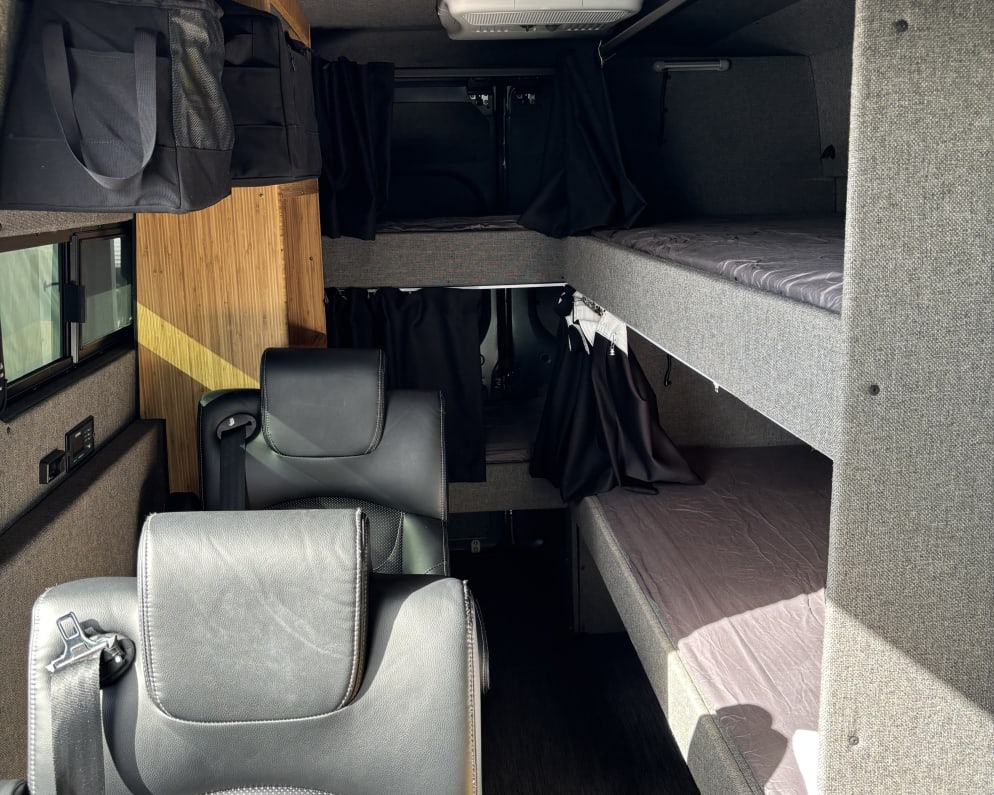 This new 2024 Dodge Ram Promaster seats and sleeps 4 comfortably and safely. Most van listings that claim to sleep 4 expect all 4 people to share a king sized bed. This van has 4 individual bunk beds for optimum comfort. The van comes with a heater and AC that can be operated while the vehicle is off (shore power required for AC) for optimal comfort while sleeping in the van. There are 4 spacious bunk beds with sheets, blankets and pillows (blanket and pillow add on charge for laundry costs). The sideways bunks are 6’ long and the driver’s side bunks are 6.5’ long. All bunks are 30” wide. This van is equipped with 4 bucket seats and 4 seatbelts for a safe trip to all your destinations. Behind the driver’s seat there is a a wonderful kitchenette equipped with essential cooking gear, an induction burner and a spacious fridge. This camper van has ample of storage so you can bring all the essentials and travel in comfort. To top it off this van comes with a top of the line focal sound system and a 10” subwoofer for cranking the tunes while you travel. This camper van is perfect for family and group excursions in the beautiful wilderness of Colorado and beyond!
